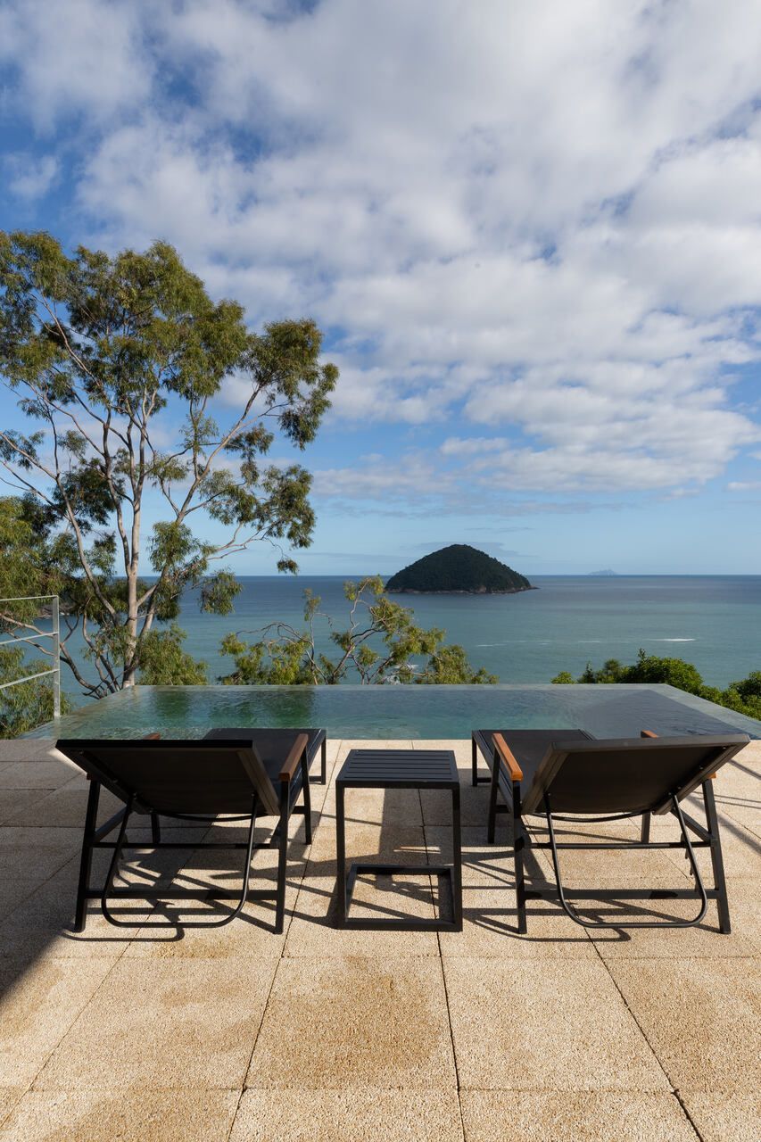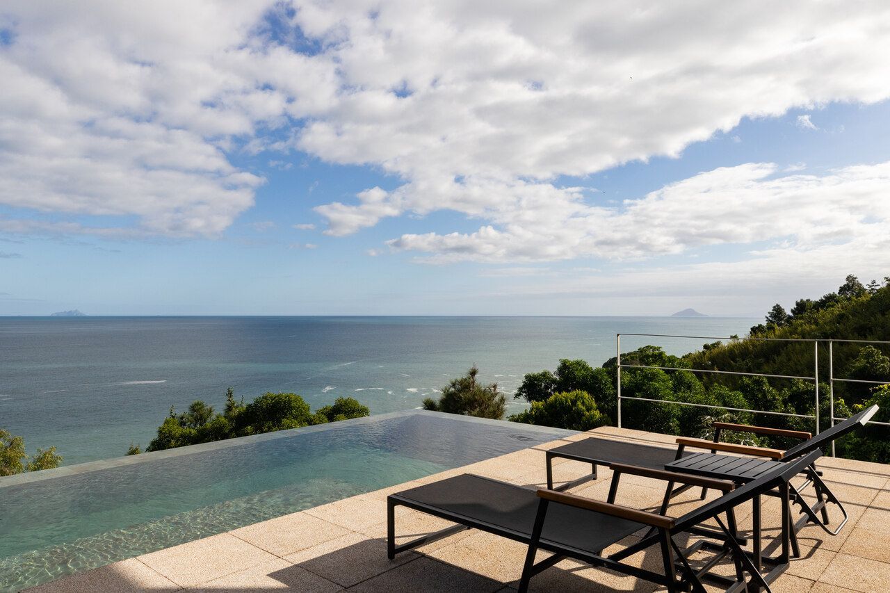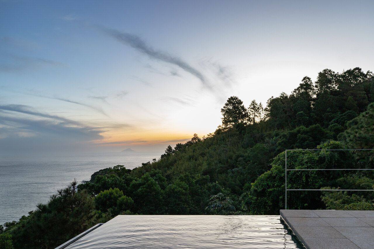 A piscina como fundo infinito de frente para o mar, a mais de 60m de altura do nível do mar, parece suspensa sob a copa das árvores. Seu tom azulado torna ainda imersa na paisagem e é um dos atrativos da casa para quem quer flanar entre as aguas e o ar.