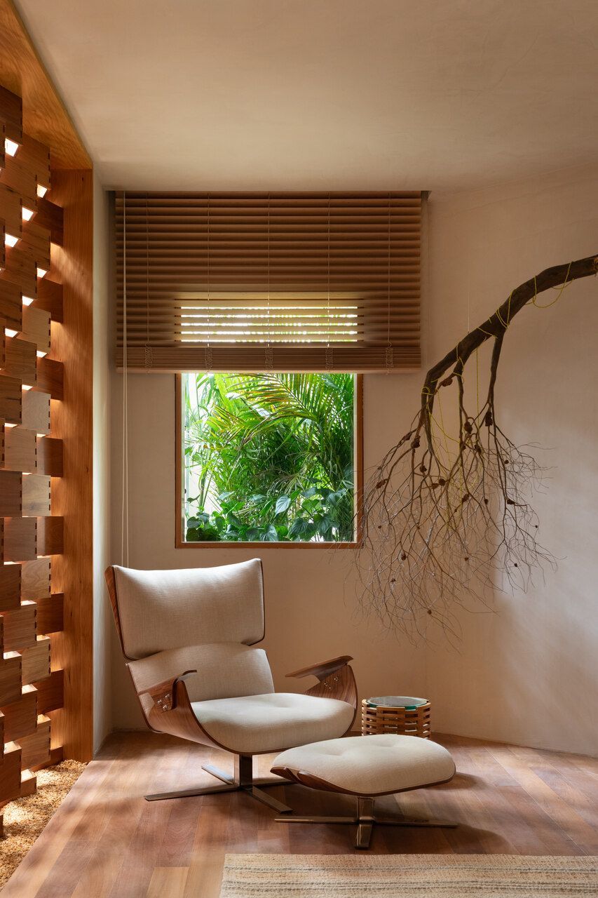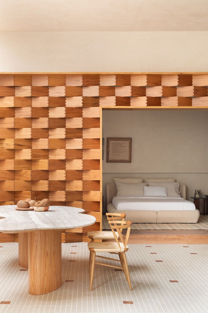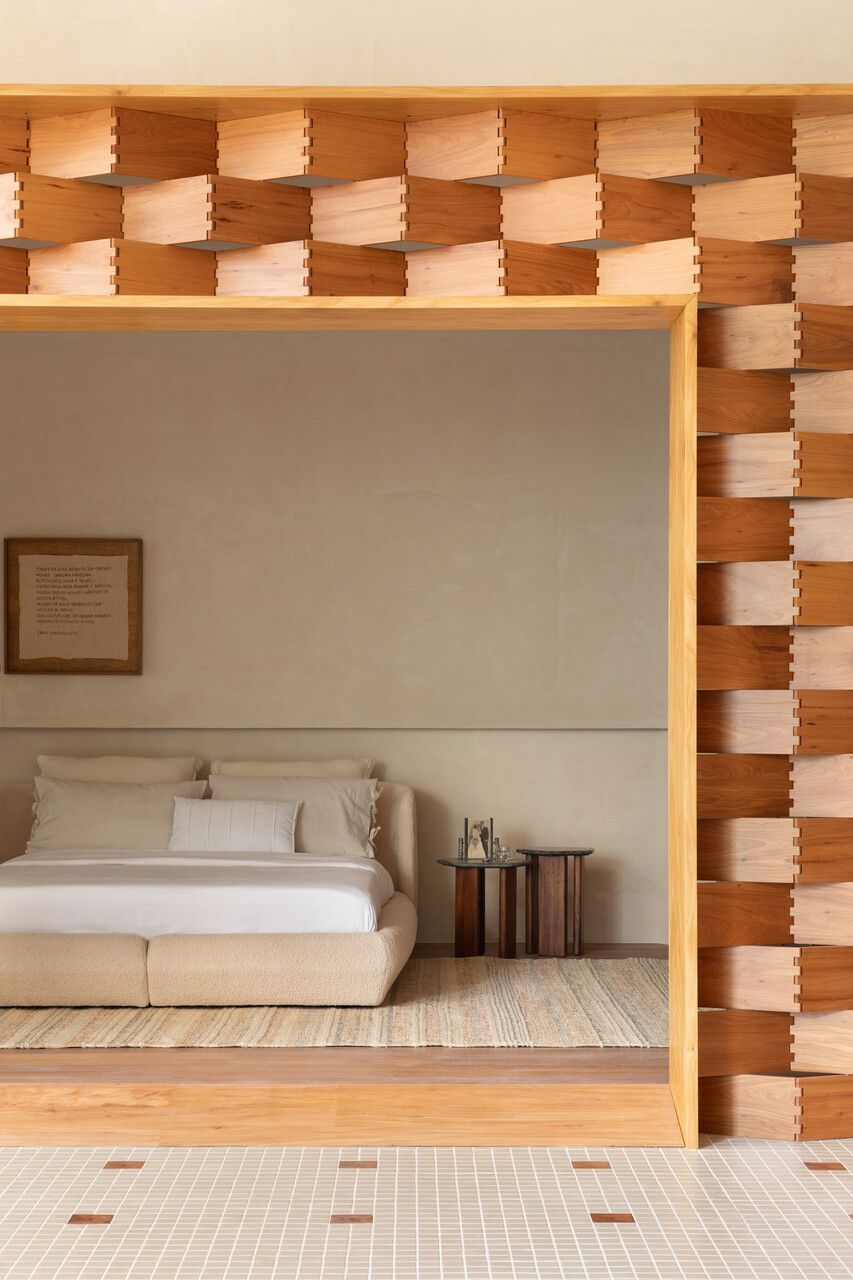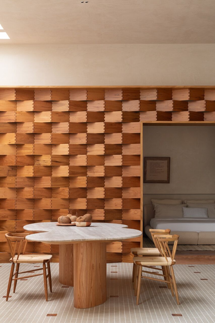 No segundo núcleo, a natureza é exaltada por meio de materiais que remetem ao bioma tropical, como madeira, fibras naturais e formas orgânicas. O terceiro núcleo é o quarto, delimitado por um painel artesanal de madeira chamado “mãos dadas”, representando a união simbólica entre homem e natureza.