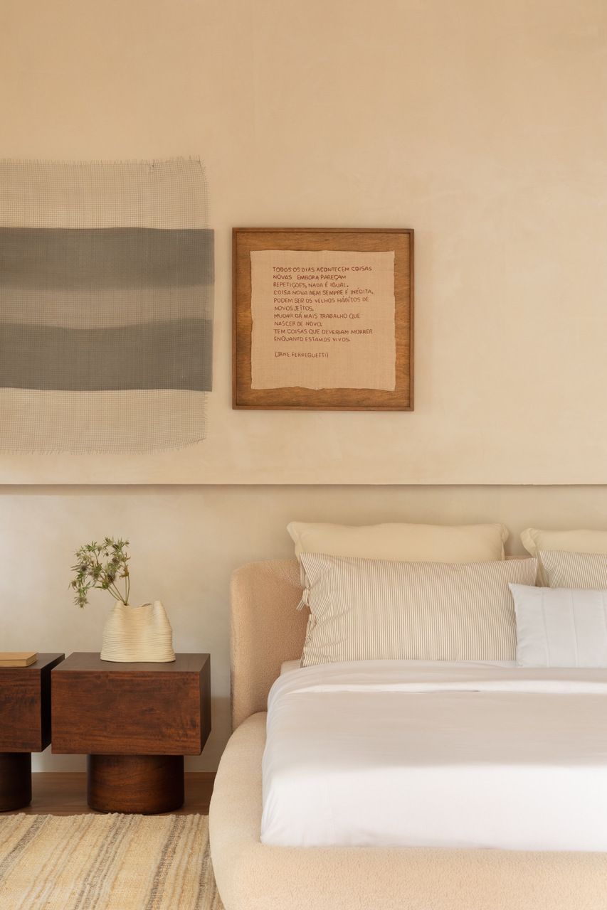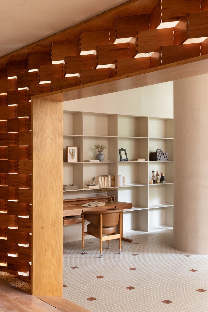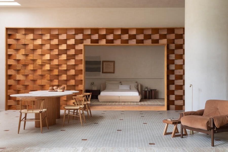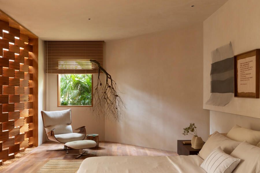 No segundo núcleo, a natureza é exaltada por meio de materiais que remetem ao bioma tropical, como madeira, fibras naturais e formas orgânicas. O terceiro núcleo é o quarto, delimitado por um painel artesanal de madeira chamado “mãos dadas”, representando a união simbólica entre homem e natureza.