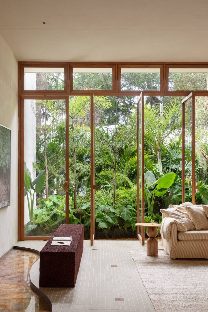 Outra solução marcante foi a abertura de um grande vão na alvenaria, transformando o espaço fechado em um ambiente conectado ao jardim tropical com espécies como jabuticabeira, palmeiras e filodendros. A presença da vegetação aproxima a arquitetura da ideia de biofilia.