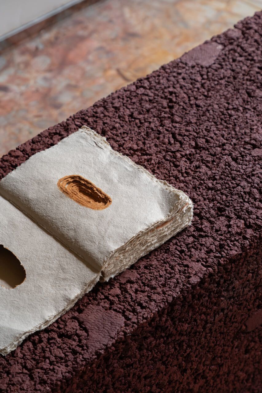 A Casa Essência é organizada em três núcleos conceituais. O primeiro leva o visitante por um túnel de paredes escuras com textura terrosa, que conduz a um espelho d’água de forma orgânica. A escolha do quartzito como revestimento simboliza a lama e a poluição, trazendo à tona uma importante reflexão sobre tragédias ambientais como a de Mariana (MG). Esse ambiente é reforçado por obras de artistas brasileiros que também exploram esse tema.