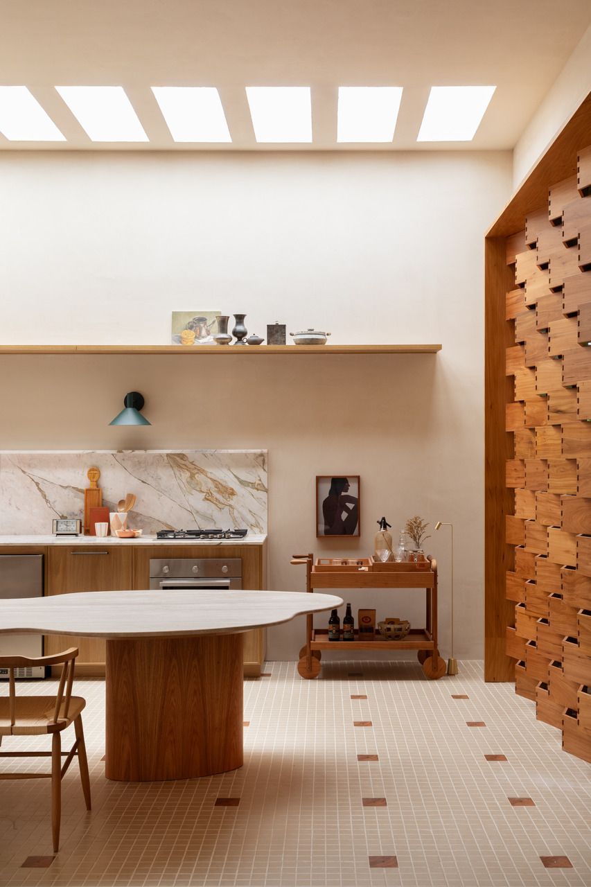O loft chama atenção pela curadoria minuciosa e pelo respeito à história do imóvel. O piso original de madeira foi restaurado, e a escolha de peças como o armário de época e o sofá de design brasileiro reforça o equilíbrio entre o antigo e o atual. Entre os destaques do mobiliário estão criações de designers afetados pelas enchentes no sul do país, incorporando ainda mais camadas de significado à proposta.