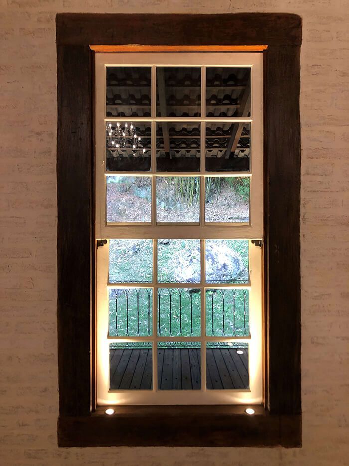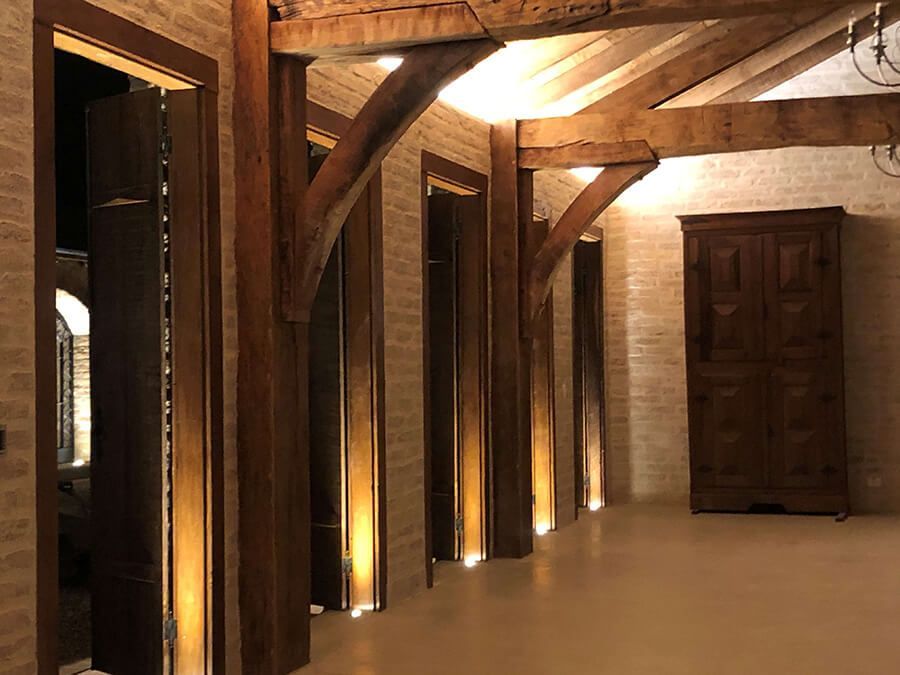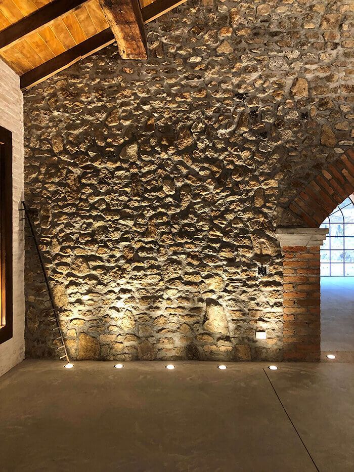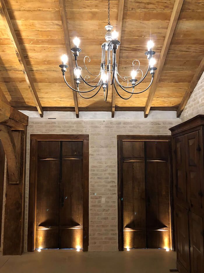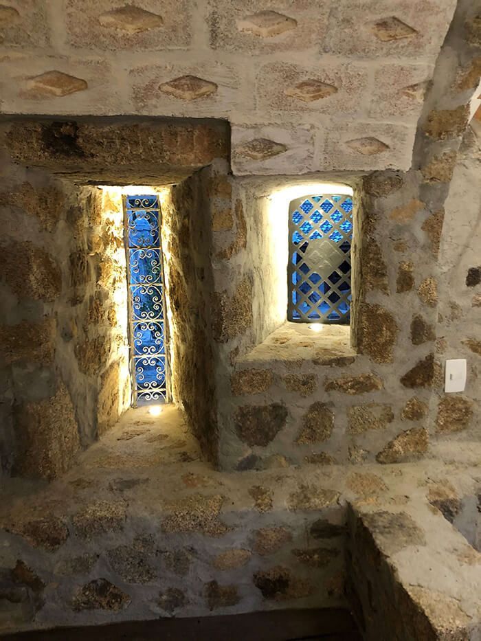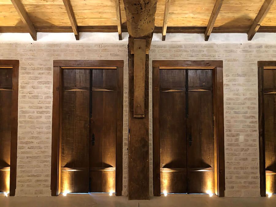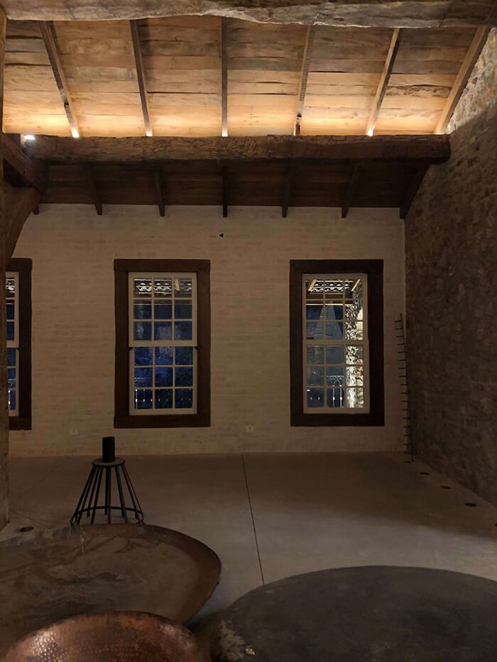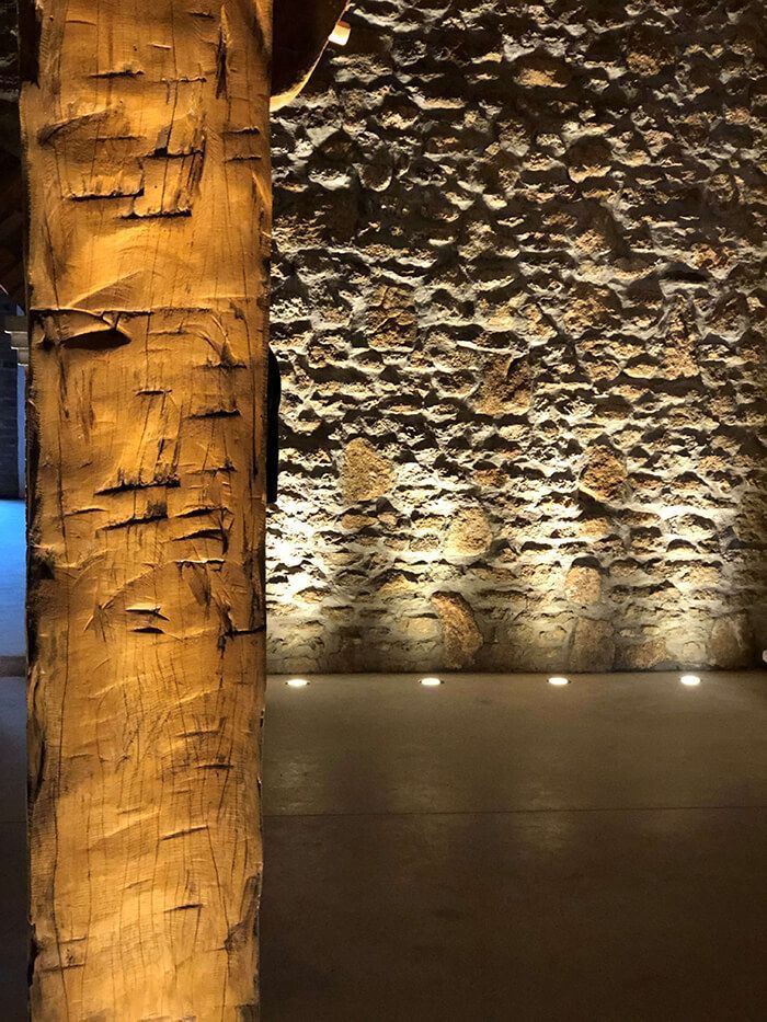 Para destacar todos os detalhes e irregularidades das madeiras e das pedra, foi usados o efeito de iluminação Up Light, instalados no chão e em todas as portas e janelas do espaço.