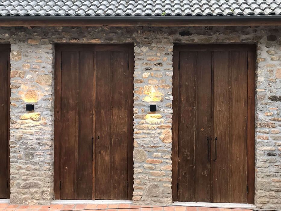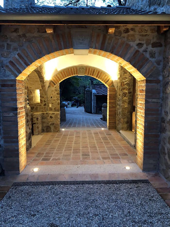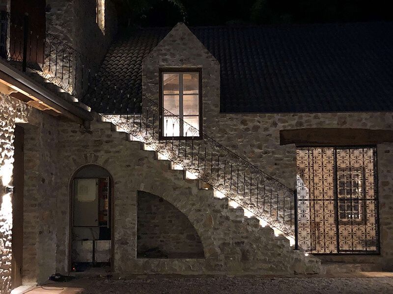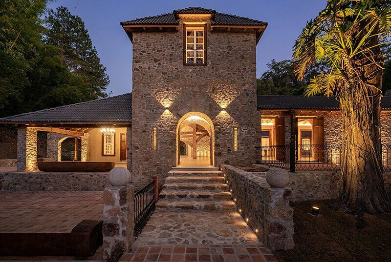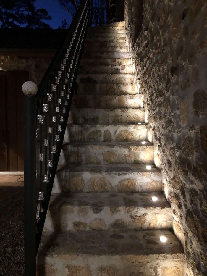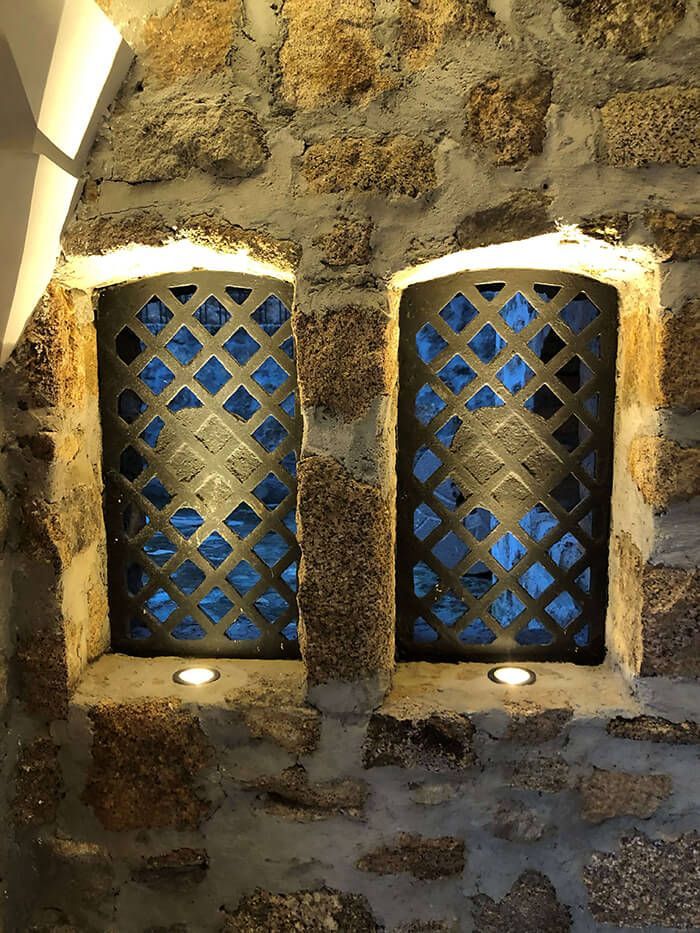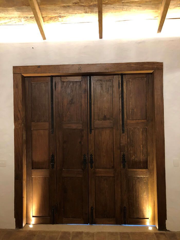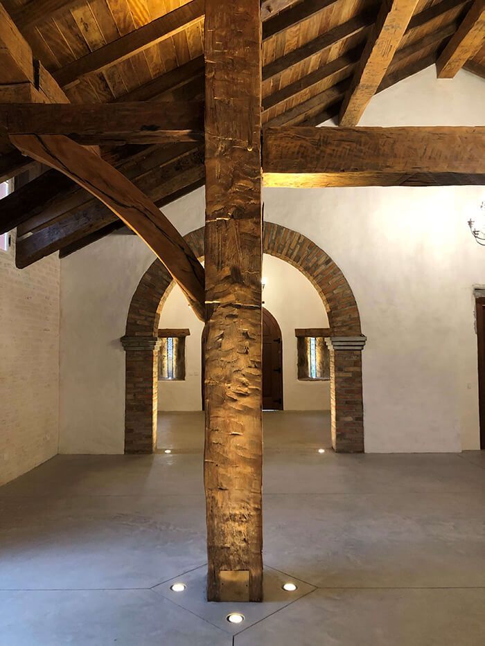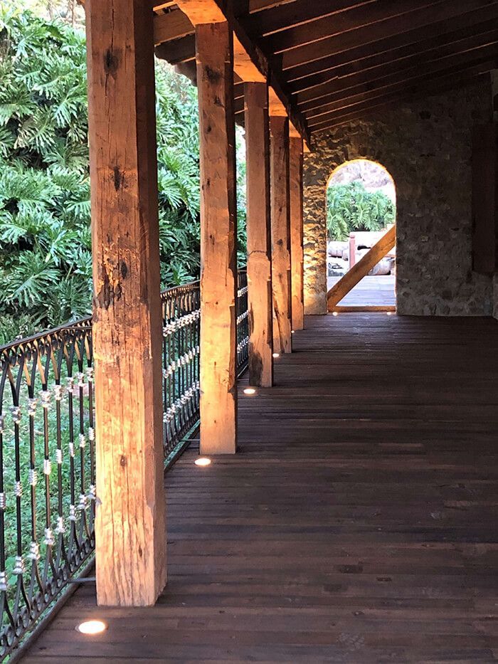 Para destacar todos os detalhes e irregularidades das madeiras e das pedra, foi usados o efeito de iluminação Up Light, instalados no chão e em todas as portas e janelas do espaço.