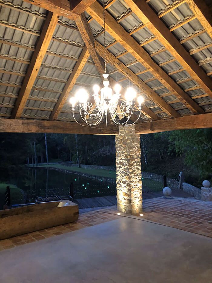 O escritório Interiores Augi foi procurado para assinar o projeto luminotécnico de uma casa de 1.100m², em Jarinu, SP. Os clientes queriam enaltecer as madeiras de demolição, que foram usadas na estrutura e lapidas a mão.
