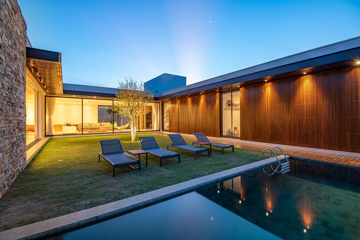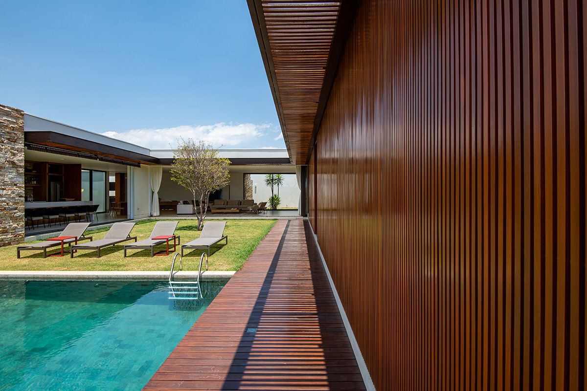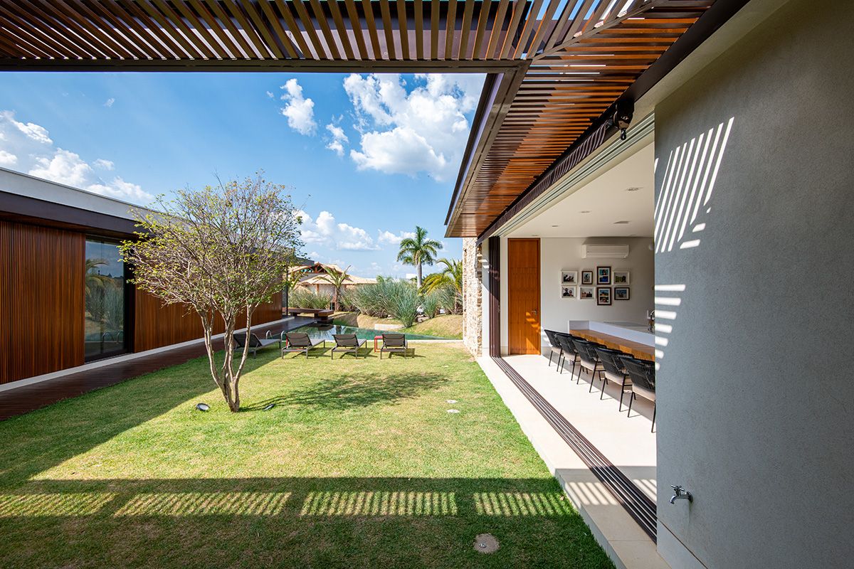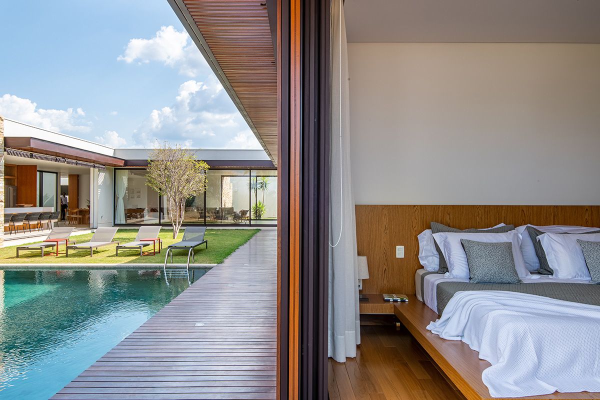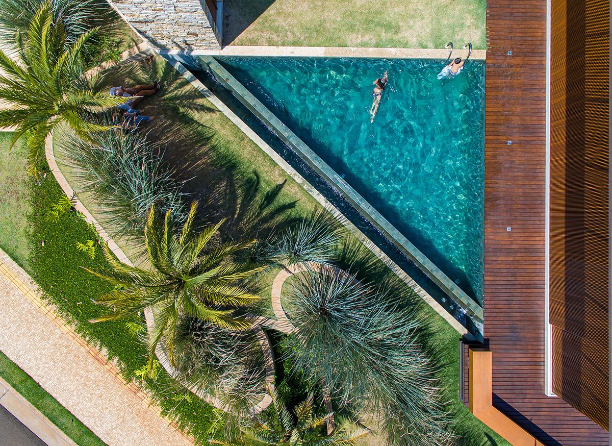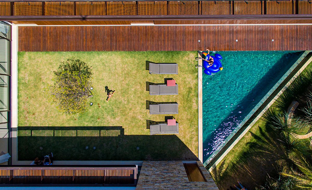 Ao mesmo tempo que a faixa de 6 metros integra, ela dá privacidade aos moradores, junto ao trabalho de paisagismo que foi realizado. O projeto conta ainda com cômodos bem espaçosos e uma piscina ótima!