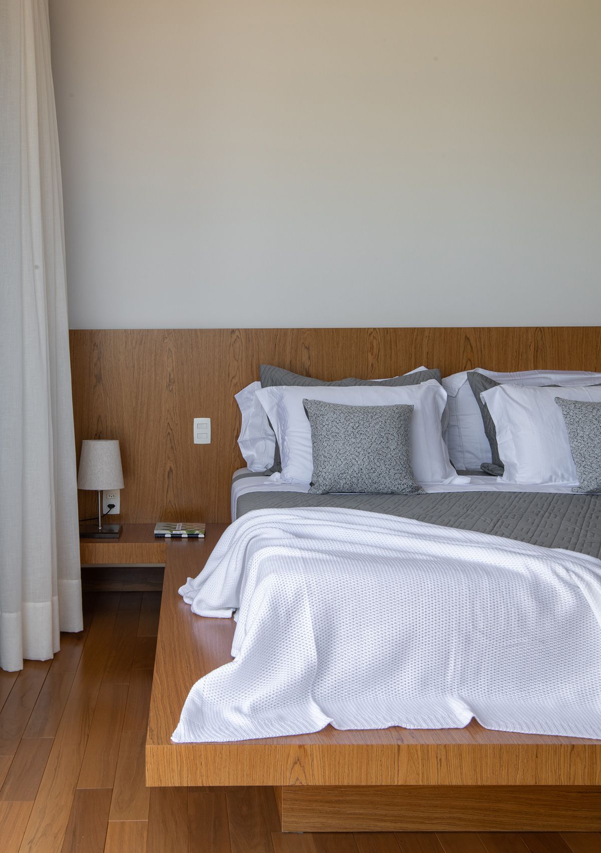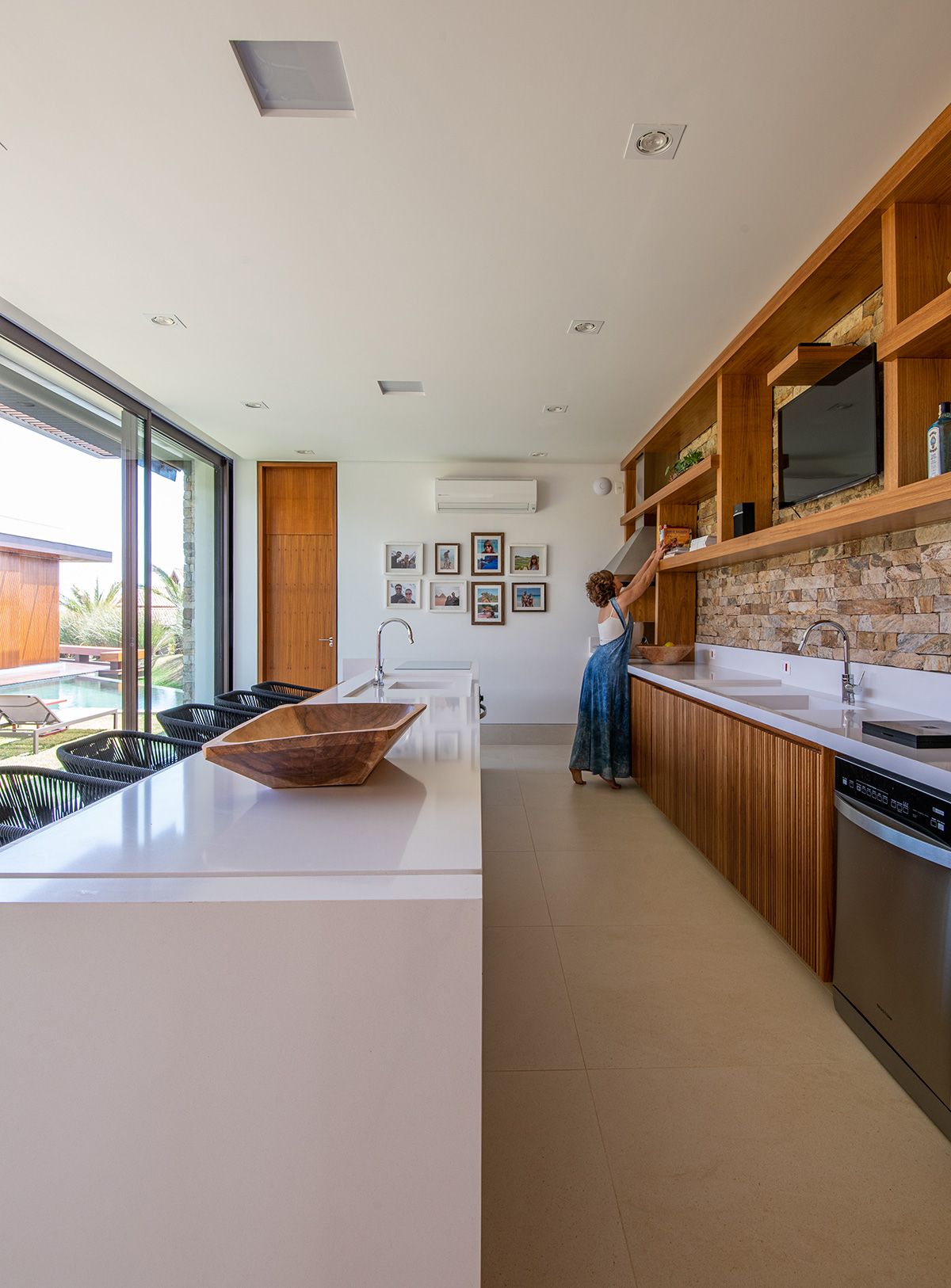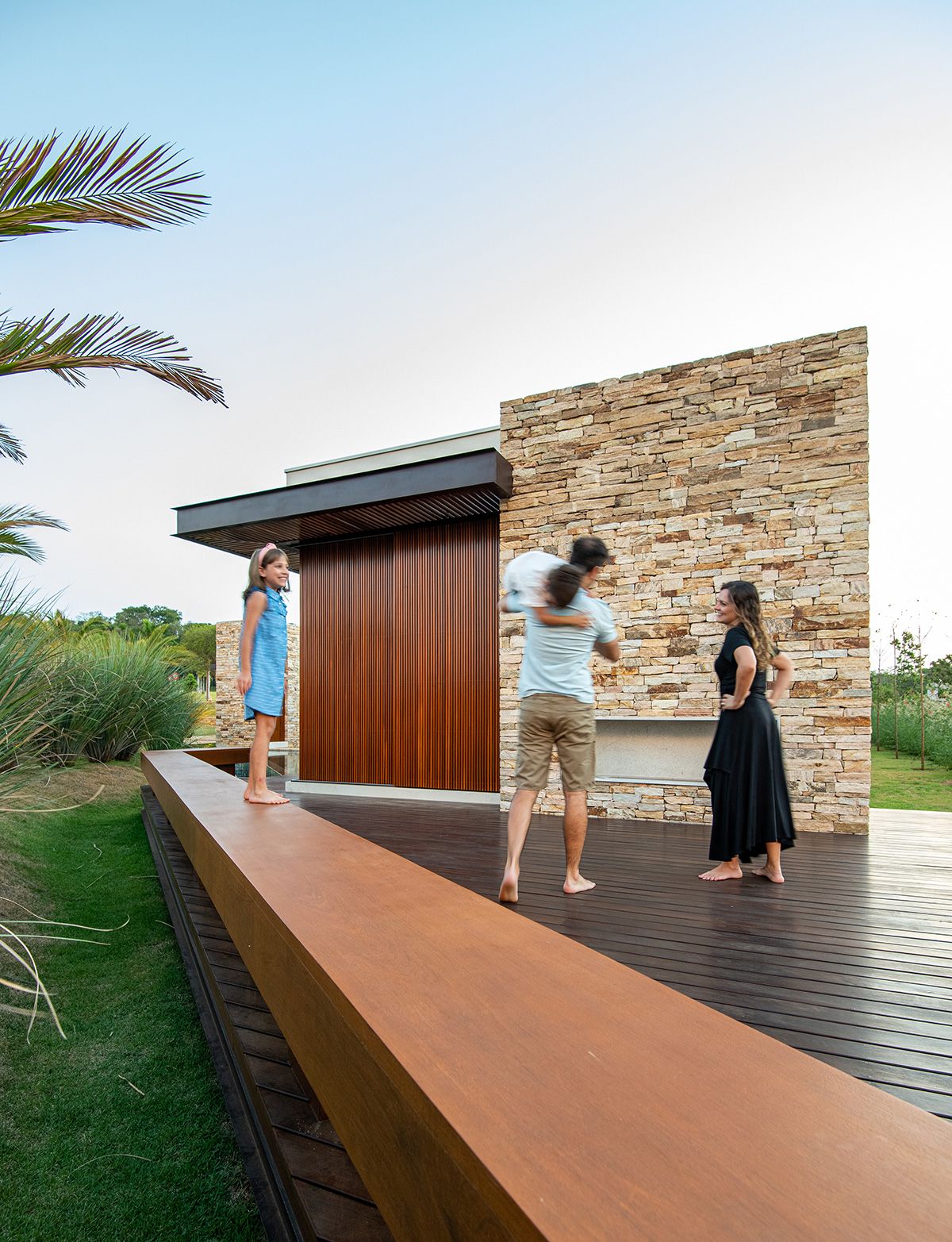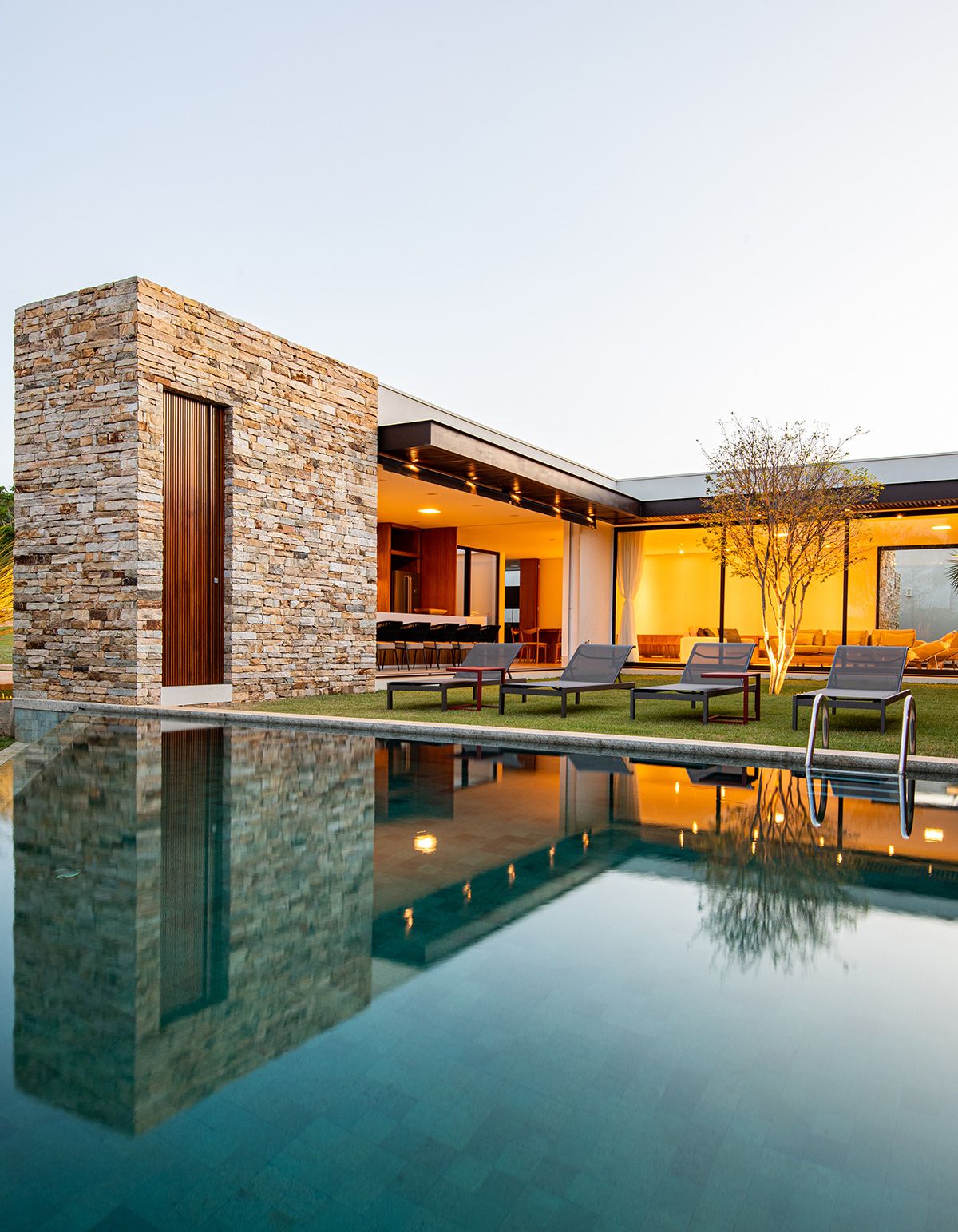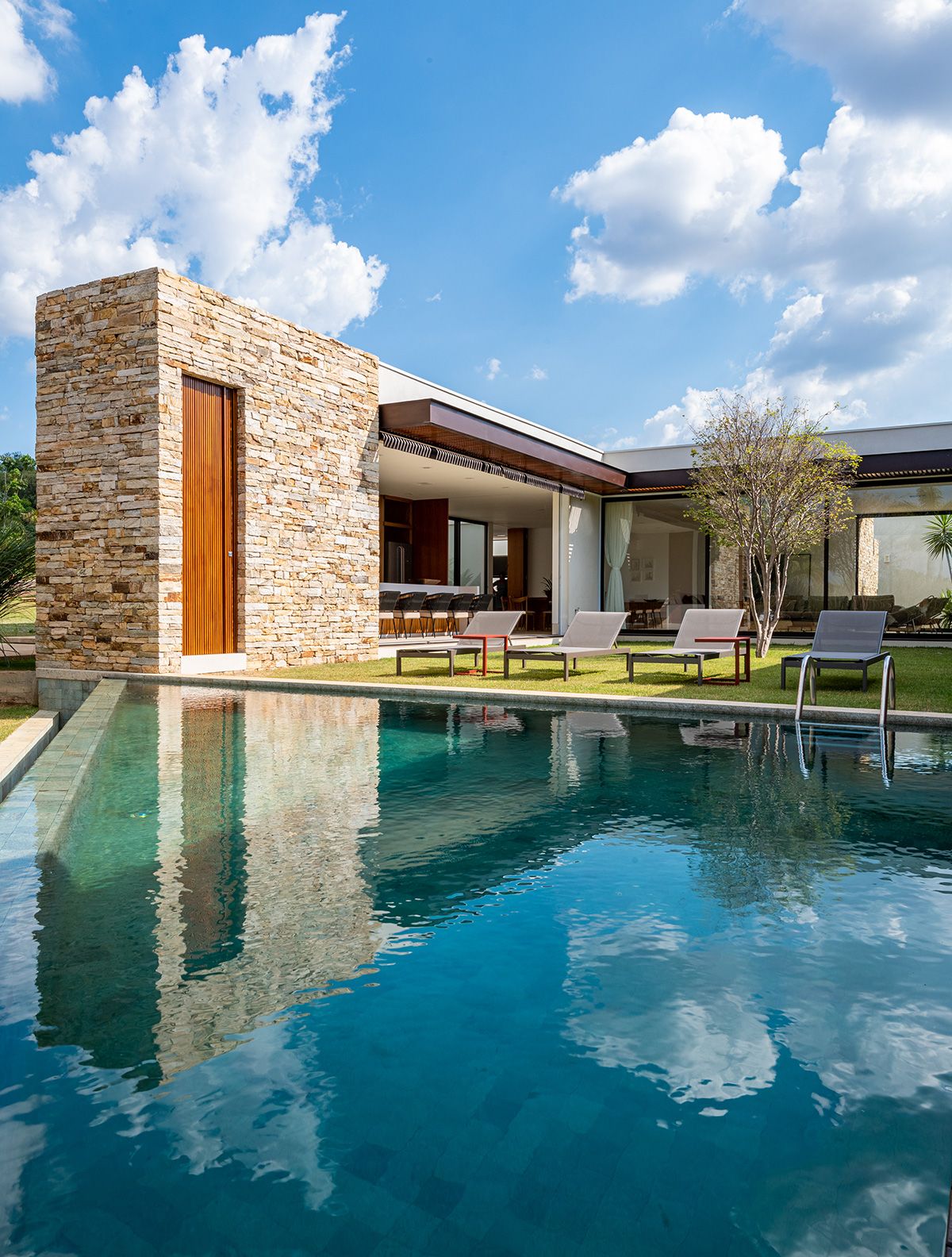 Ao mesmo tempo que a faixa de 6 metros integra, ela dá privacidade aos moradores, junto ao trabalho de paisagismo que foi realizado. O projeto conta ainda com cômodos bem espaçosos e uma piscina ótima!