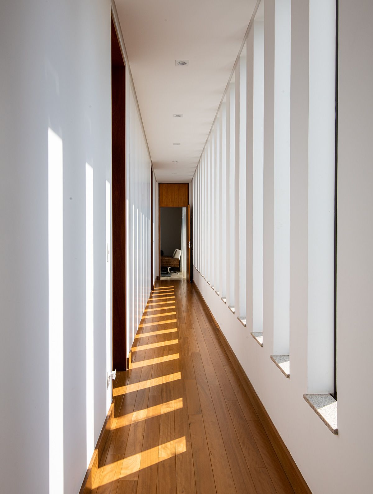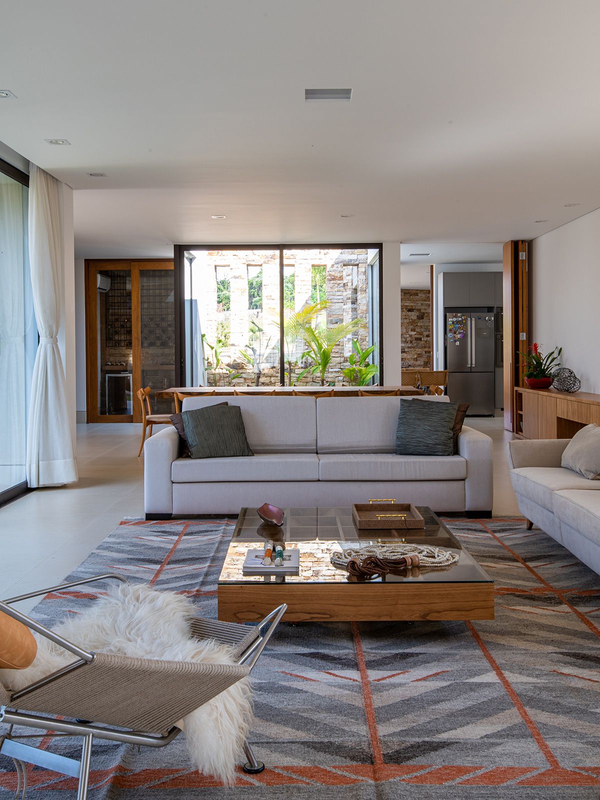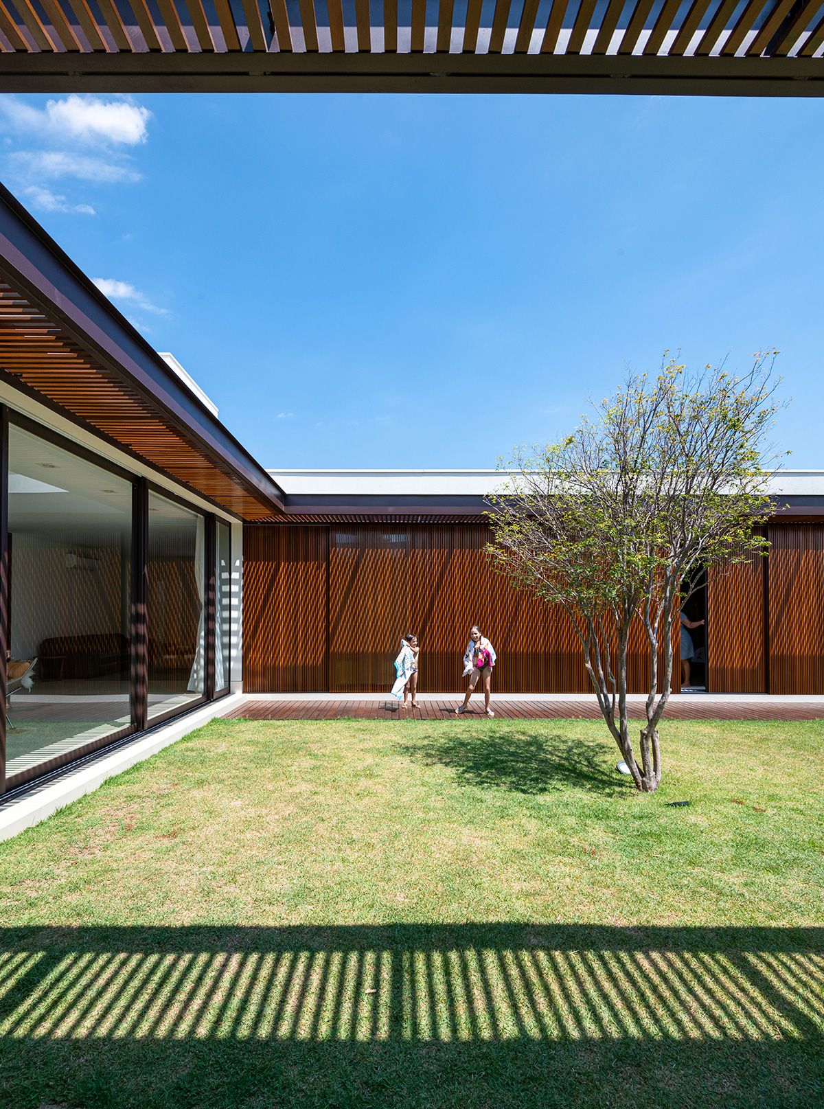 O recuo obrigatório que, inicialmente era um entrave, trabalha em favor do projeto, funcionando como uma extensão do pátio interno.