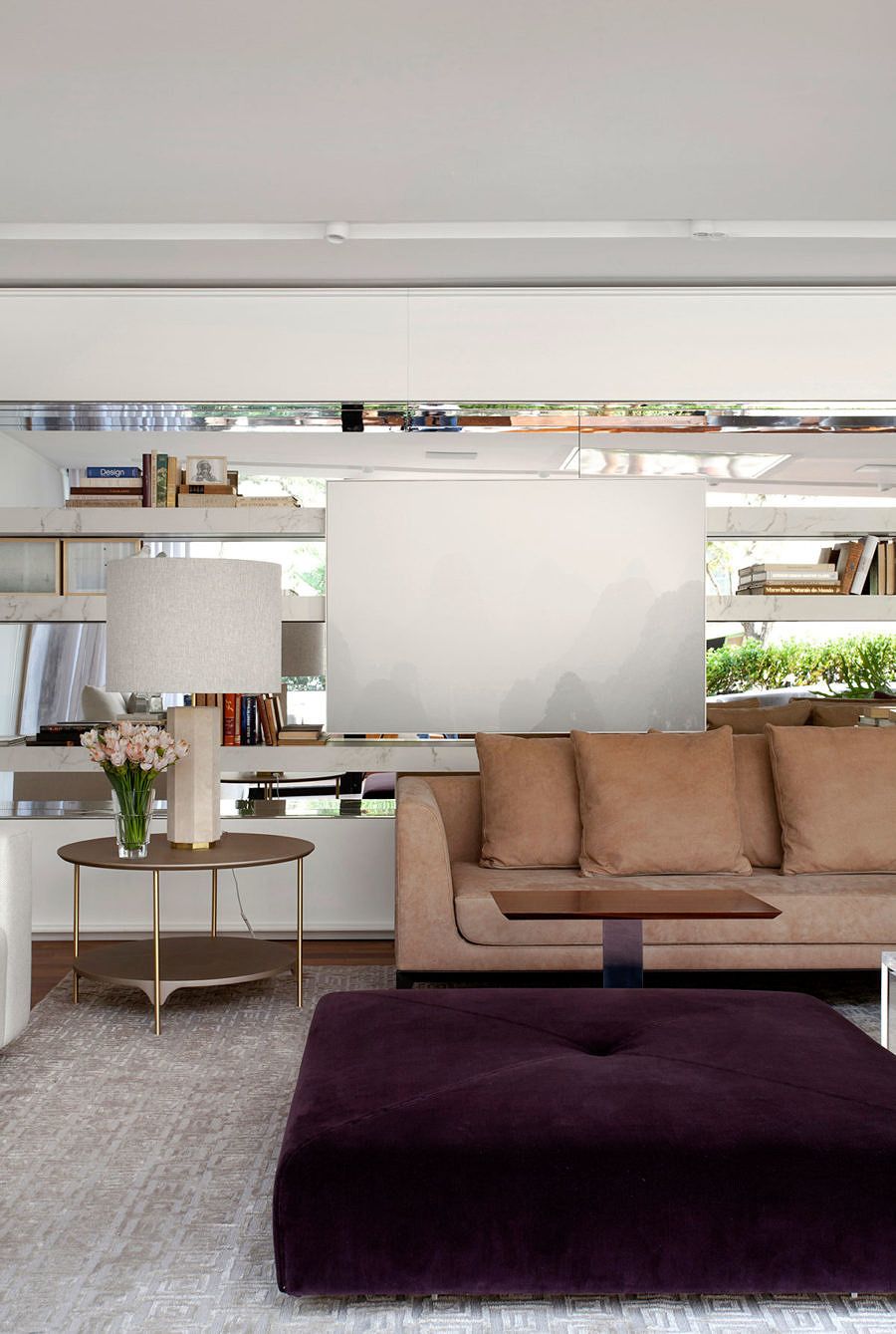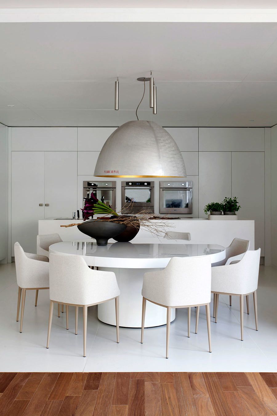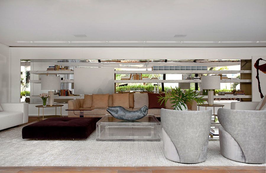 No estar, destaque para os estofados de linho natural, dispostos simetricamente, e um terceiro sofá, ao centro, com 3,80 metros de extensão e revestimento de couro natural. Envolvida por uma suave caixa branca, formada por paredes de madeira laqueada, a área gourmet integra a cozinha encantadora, com o mesmo minimalismo de todo o projeto.