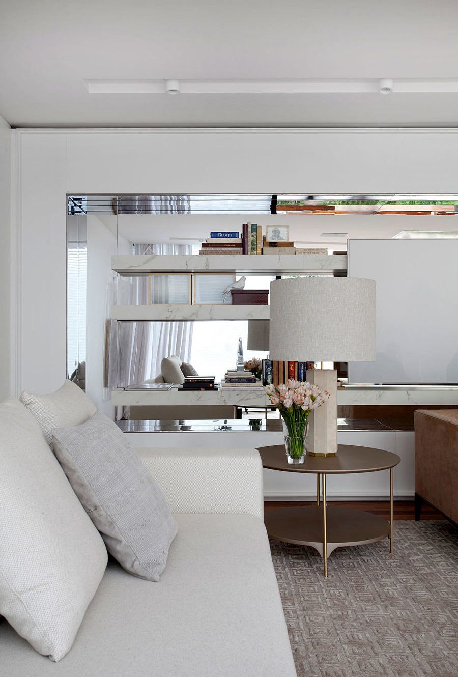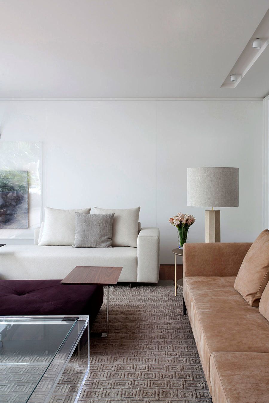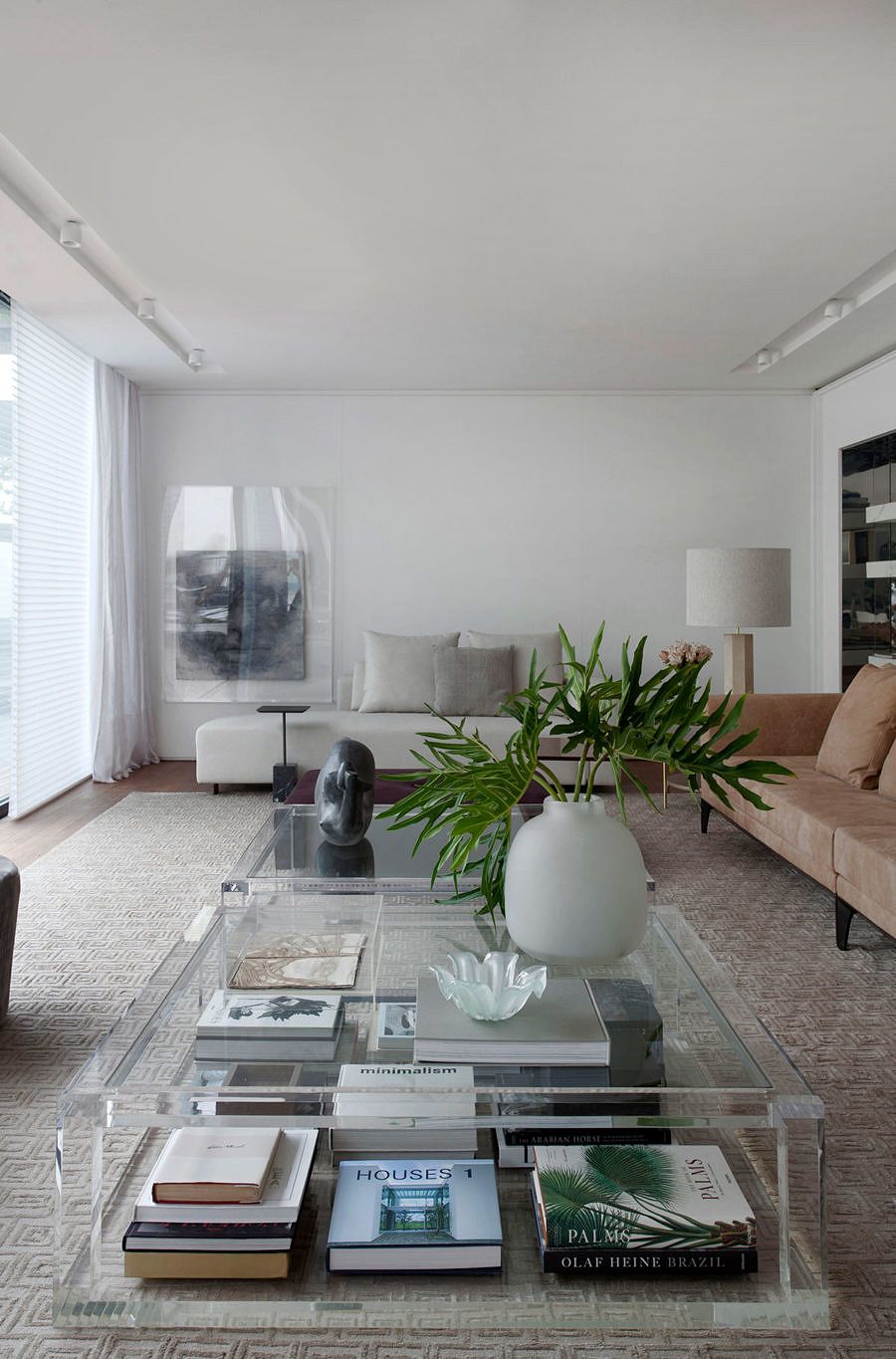 No estar, destaque para os estofados de linho natural, dispostos simetricamente, e um terceiro sofá, ao centro, com 3,80 metros de extensão e revestimento de couro natural. Envolvida por uma suave caixa branca, formada por paredes de madeira laqueada, a área gourmet integra a cozinha encantadora, com o mesmo minimalismo de todo o projeto.