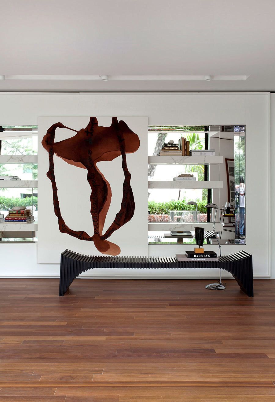 O piso de cumaru, aplicado na parte interna como tábua corrida, dá continuidade ao percurso, levando as pessoas para deslumbrar o mix de obras de arte e design. Na iluminação, os perfis refinados de acrílico com LED, que acompanham as duas extremidades do estar, valorizam as obras de arte.