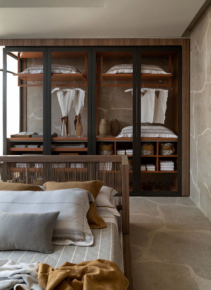 Quem entra no ambiente não consegue identificar a finalidade desse painel, mas durante o percurso percebe-se que aquela ‘caixa’, na verdade, acomoda a cama, o sofá, e a mesa, otimizando o espaço e criando um elemento de design personalizado.
