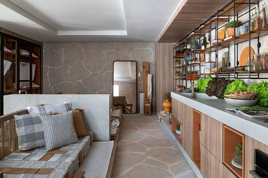 Idealizando um refúgio urbano, mas de natureza rústica, que exalta contemporaneidade com o uso de materiais naturais, o espaço conta com poucos móveis, prioriza a cozinha e dispõe de living, quarto, banheiro, closet e um jardim anexo.