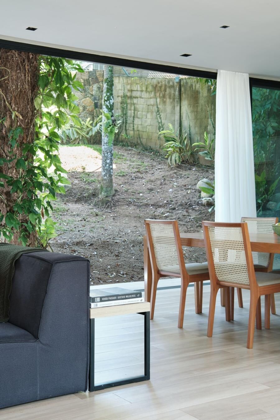 A transição entre o volume social e o íntimo é marcada por uma árvore preservada, que funcionou como eixo e símbolo do cuidado com o entorno. A varanda posterior revela outro gesto poético: ela se debruça sobre um paredão verde e uma rocha monumental, conectando a casa à paisagem de forma silenciosa e potente — quase como se o endereço tivesse sido moldado em torno da natureza, e não o contrário.