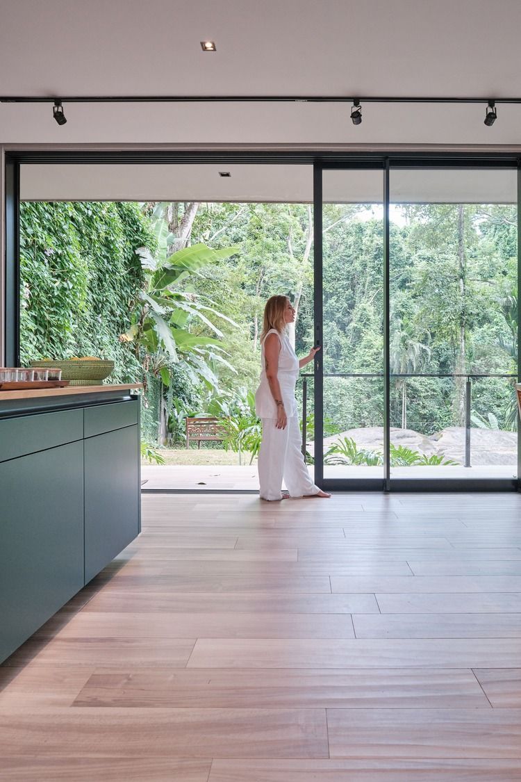 A inspiração dialoga diretamente com um projeto anterior dos arquitetos: a casa apresentada na CASACOR Rio 2021. Texturas naturais, materiais orgânicos e uma arquitetura que se dilui no entorno foram resgatados aqui, resultando em uma estrutura metálica leve e em grandes panos de vidro que se abrem para o terreno. A área social parece flutuar, criando uma espacialidade luminosa e contínua entre dentro e fora — atmosfera que já se tornou assinatura da Thimi Arquitetura.