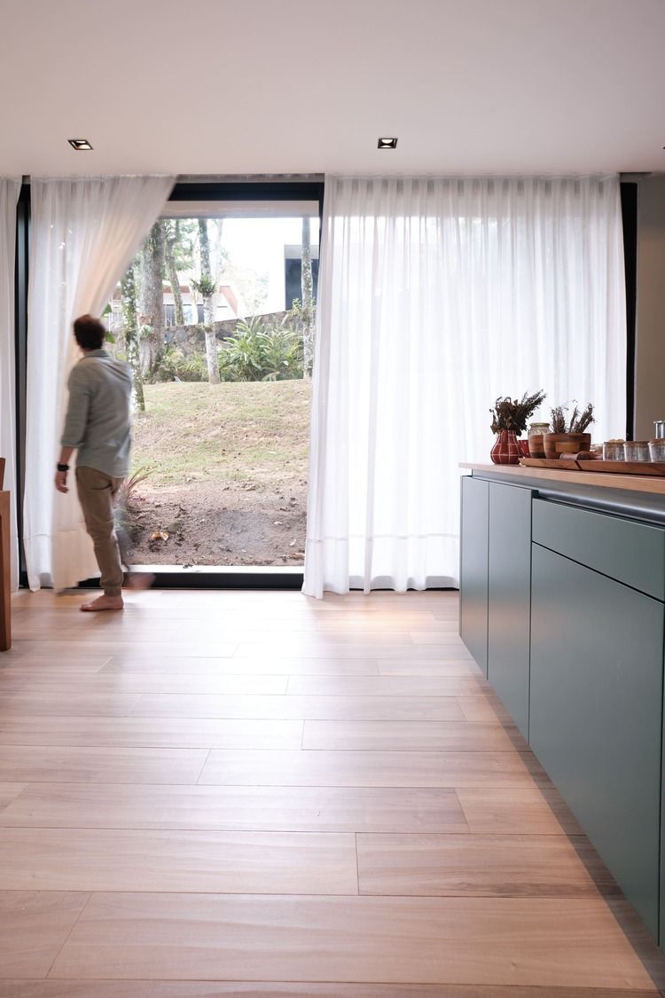 Thiago Morsch e Michele Wilkinson, do escritório Thimi Arquitetura, partiaram da leve declividade do terreno para conceber uma casa térrea, compacta nas dimensões, mas ampla na generosidade dos espaços. Uma construção pensada para receber amigos, acolher os rituais familiares e ressignificar o cotidiano antes vivido em um apartamento pequeno.