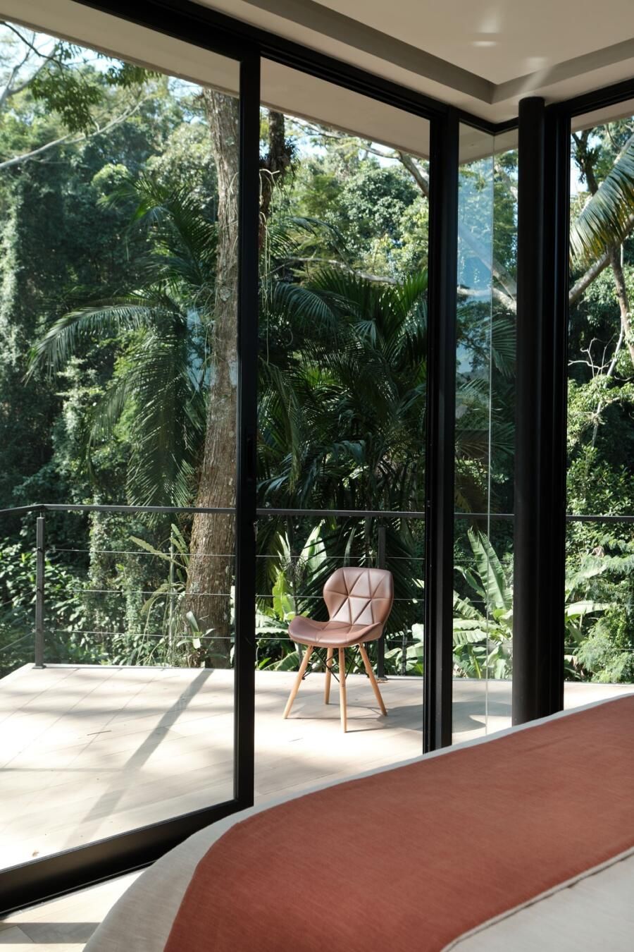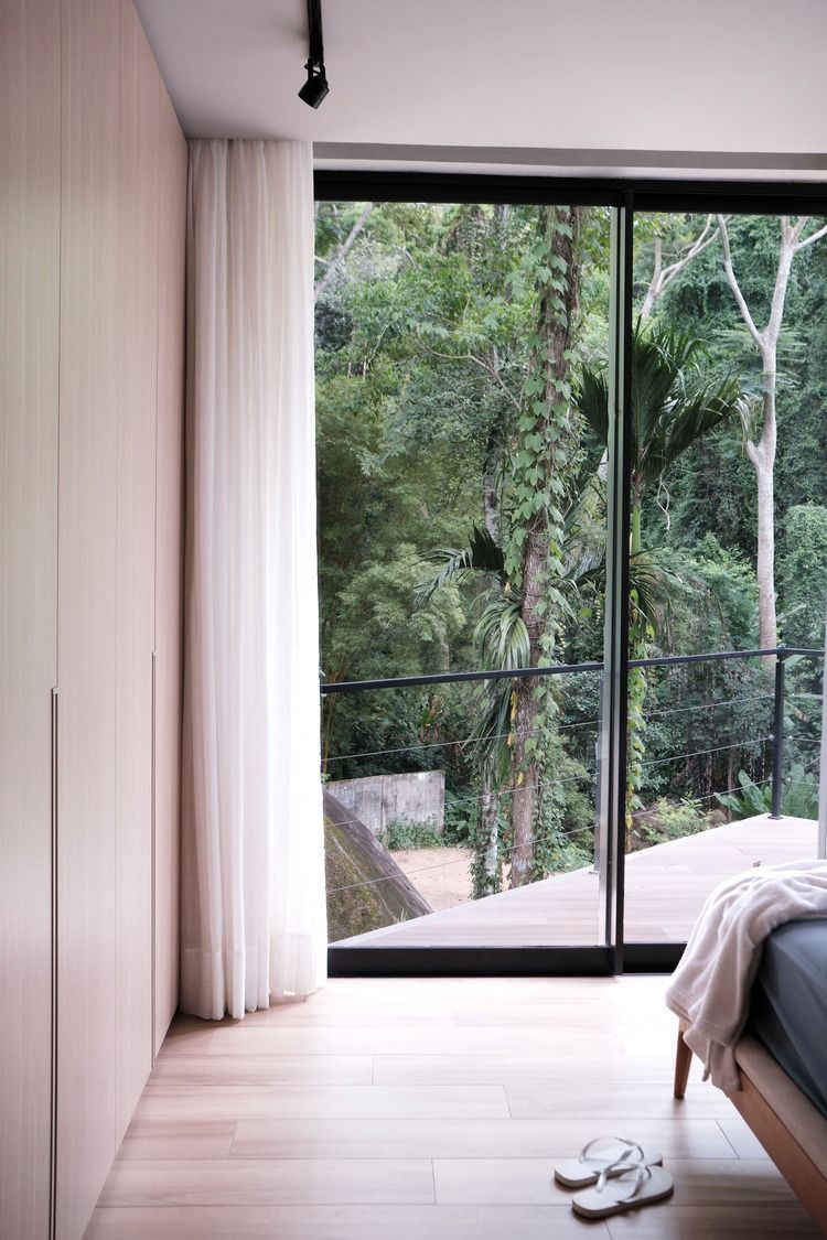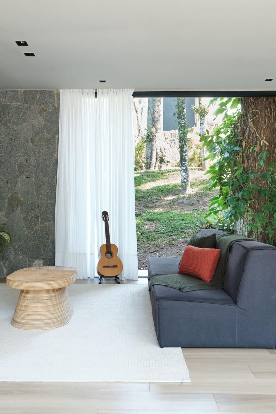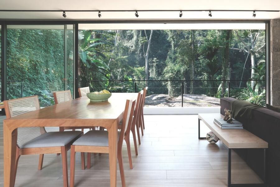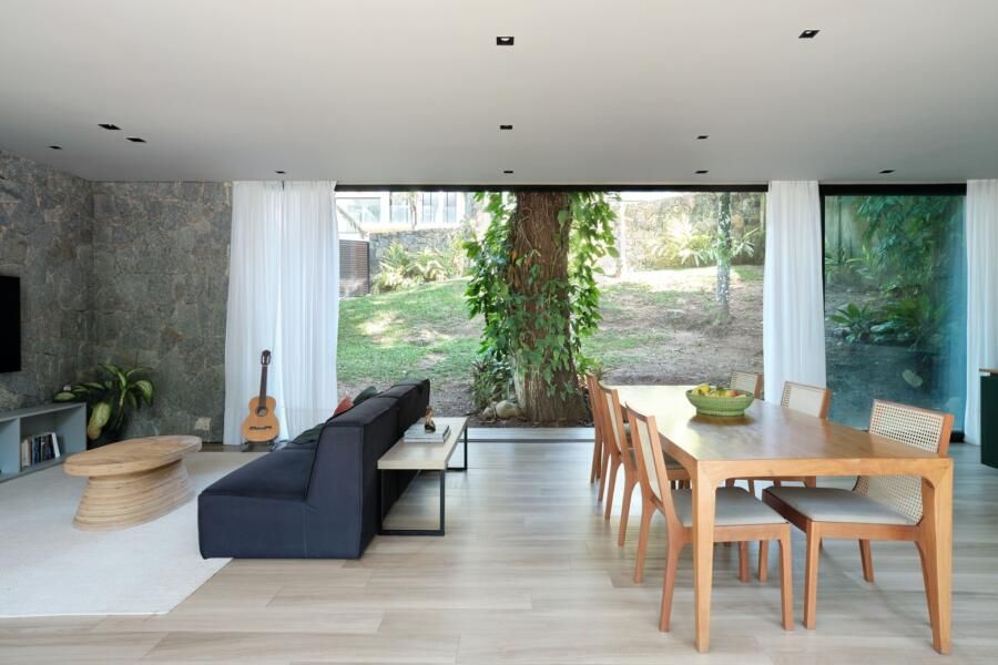 A transição entre o volume social e o íntimo é marcada por uma árvore preservada, que funcionou como eixo e símbolo do cuidado com o entorno. A varanda posterior revela outro gesto poético: ela se debruça sobre um paredão verde e uma rocha monumental, conectando a casa à paisagem de forma silenciosa e potente — quase como se o endereço tivesse sido moldado em torno da natureza, e não o contrário.