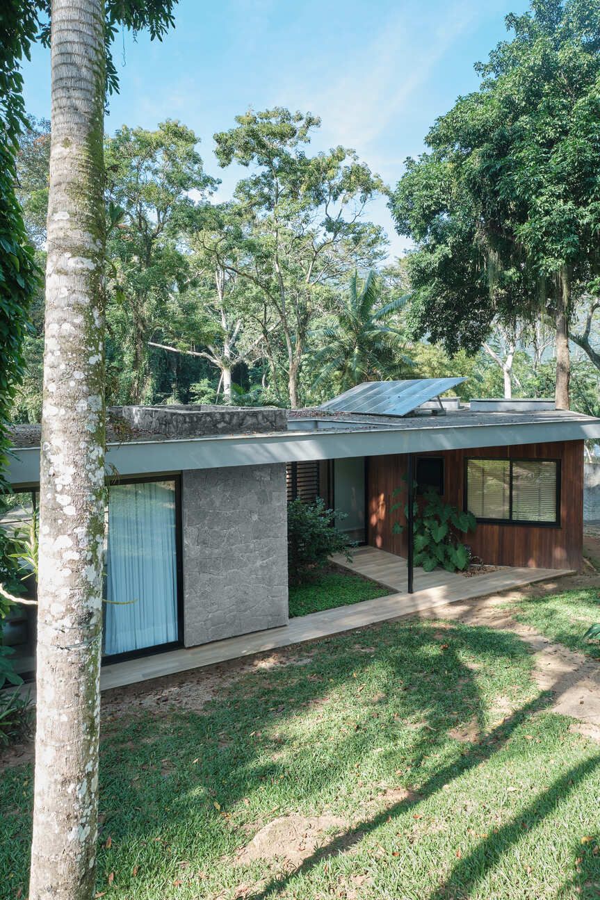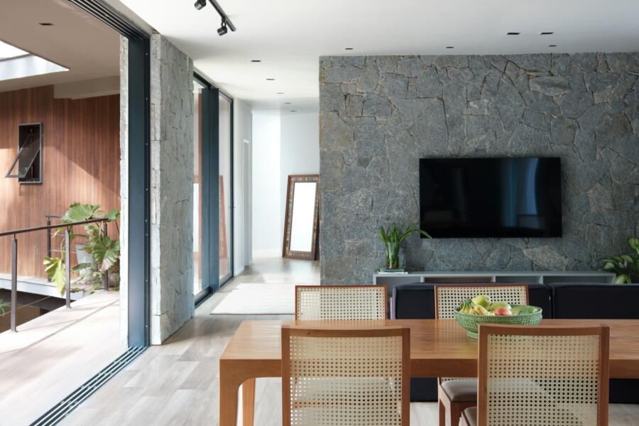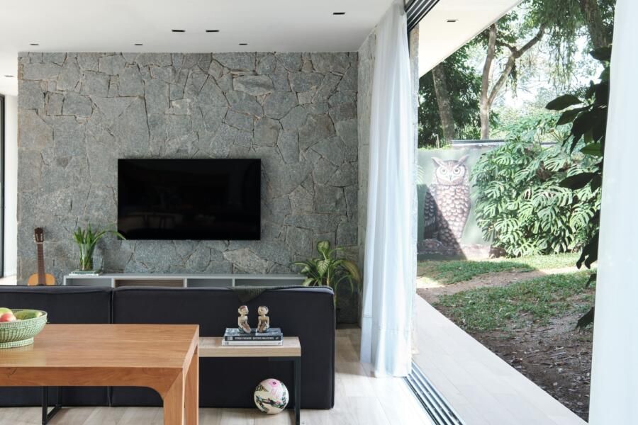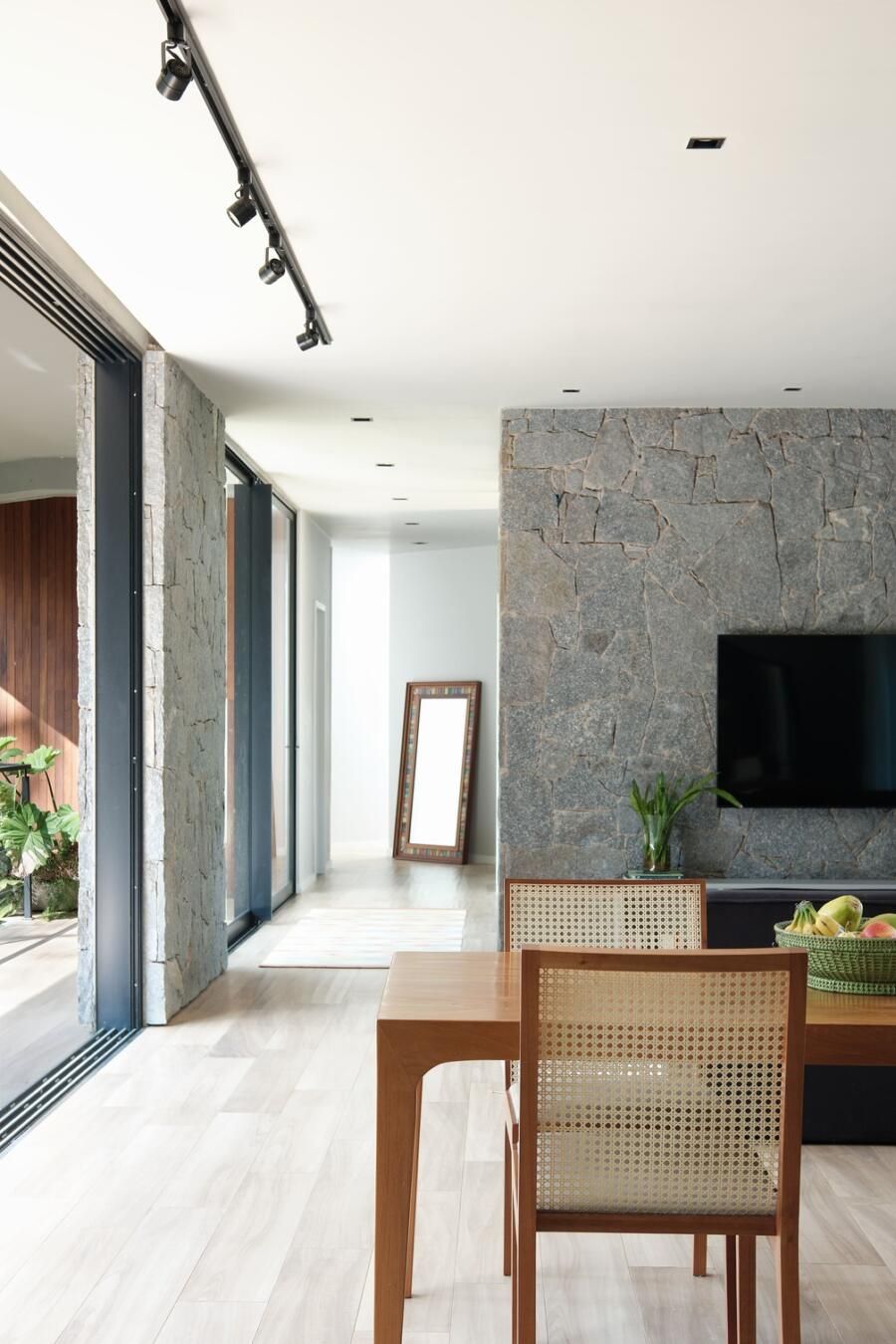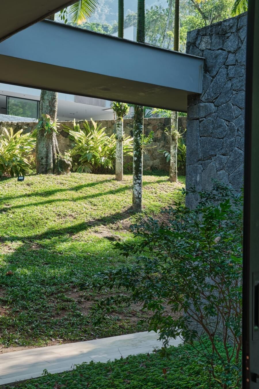 O uso de materiais naturais funciona como fio condutor. Pedra, madeira e um paisagismo exuberante moldam não só a estética, mas a experiência sensorial de viver ali.
