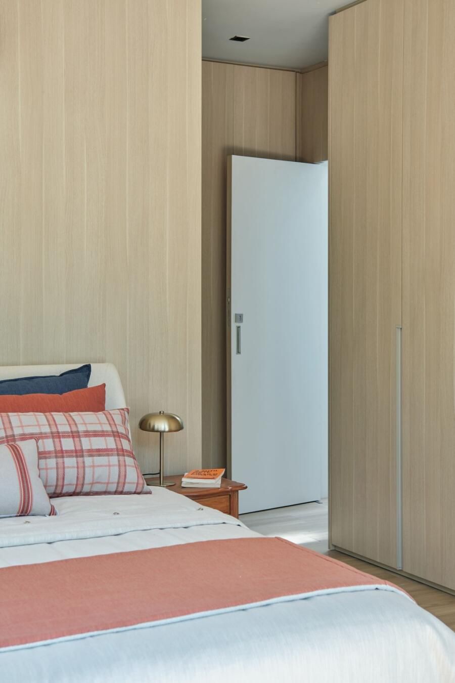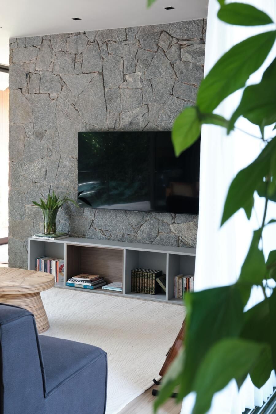 No coração da casa, sala e cozinha se integram em um único gesto, articulados por uma ilha central que funciona como ponto de encontro diário. Ali, a alvenaria praticamente desaparece: restam apenas duas paredes — a da TV, revestida em pedra Moledo, e a que abriga a marcenaria da cozinha, desenhada pela Florense Niterói e inspirada na CASACOR. O piso contínuo estende-se até a varanda, reforçando a sensação de passagem livre entre interior e exterior. Portas de correr piso-teto em serralheria ampliam a transparência e convidam o verde a ocupar a cena.