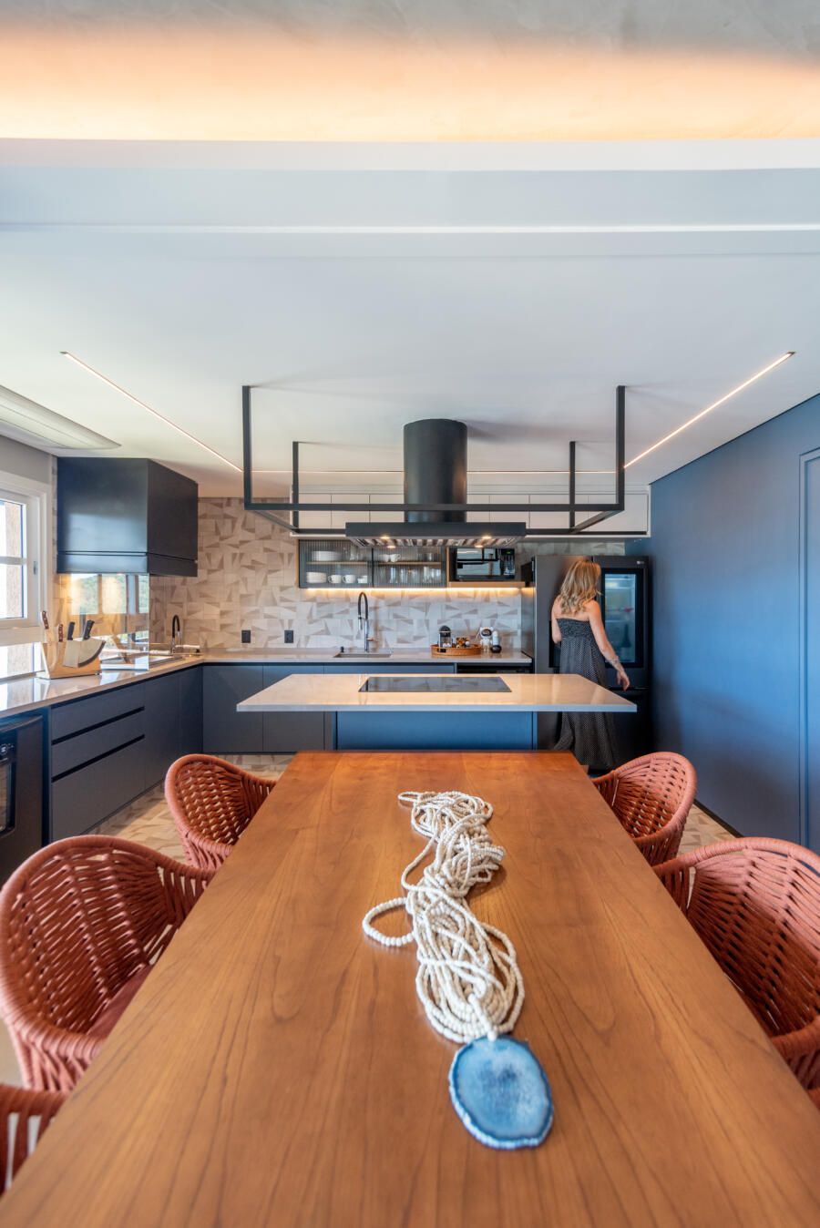 Apesar de praiana, a decoração da casa não segue o tema. Ao invés disso, elementos naturais como o cimento queimado e cores vivas ganham destaque, inclusive com uma cozinha azul.