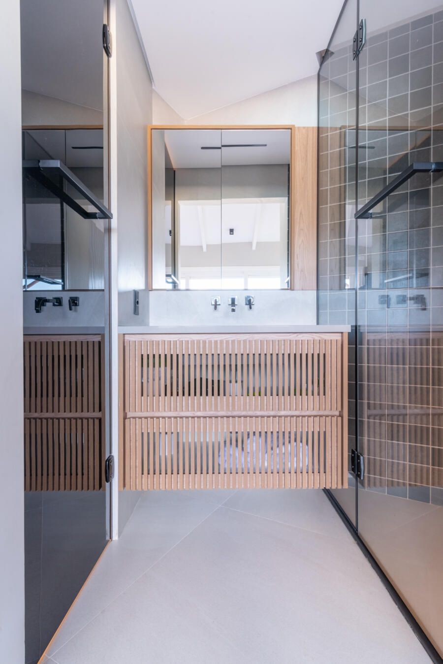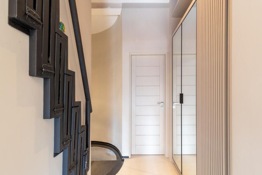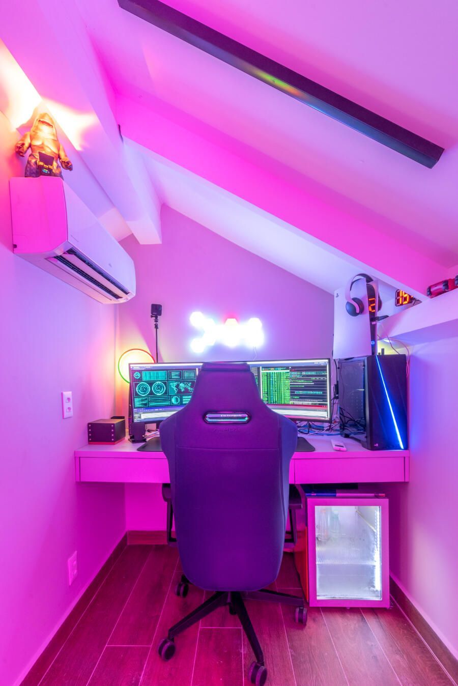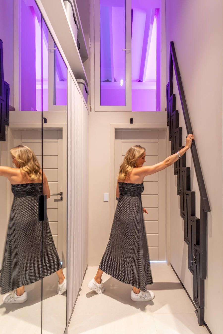 “A criação de um mezanino na inclinação do telhado, o terceiro pavimento (com uma escada móvel para parede) tinha como função acomodar o hobby de jogar do Alê, que já virou um job para ele, de consultoria e avaliação de jogos no Metaverso.”