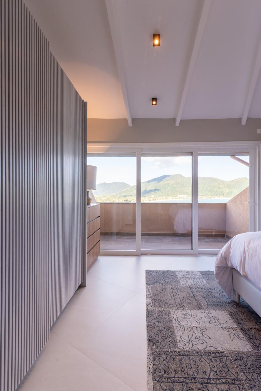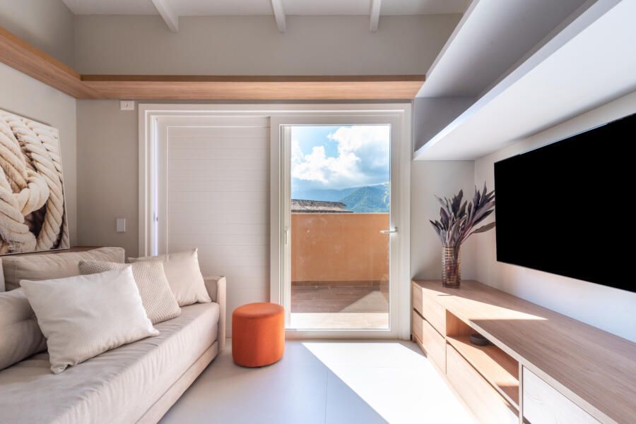 “Foi feita uma reforma completa com alteração de escada e abertura de vãos para integração dos ambientes para valorizar a vista que sempre foi um dos principais pedidos do casal. A praia que emoldura todo o apartamento serviu de inspiração, antes uma escada e dormitório de serviço impediam a visão, então a alteração estrutural da escada permitiu a nova configuração.”