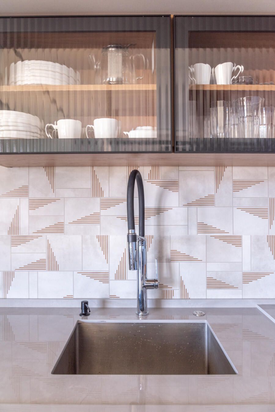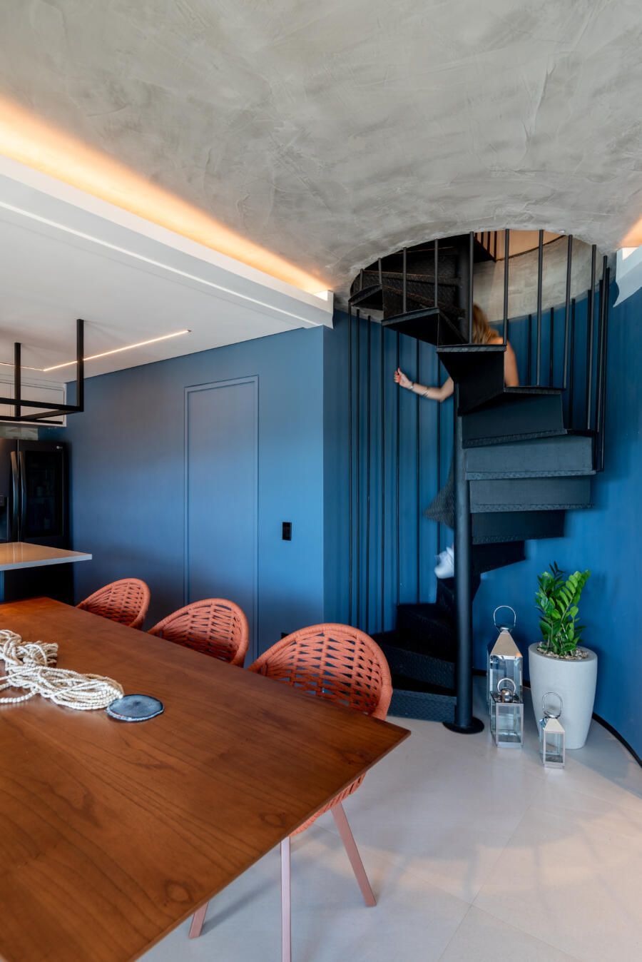 “Os principais destaques vão para a cozinha azul integrada, mudança da escada helicoidal, banheiro senhor e senhora com espaços divididos devido a diferente rotina do casal.