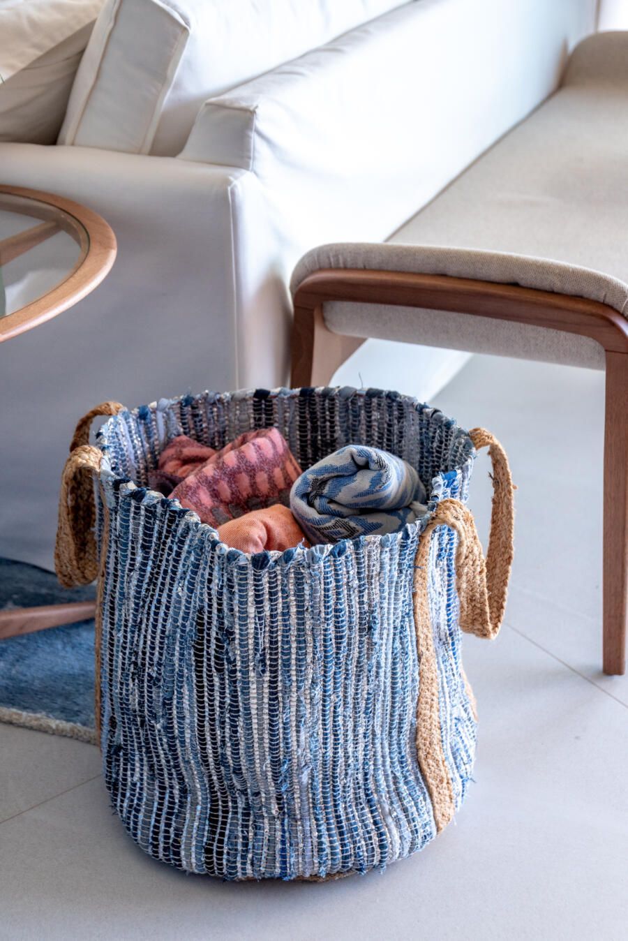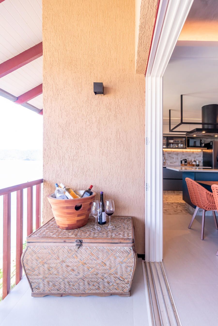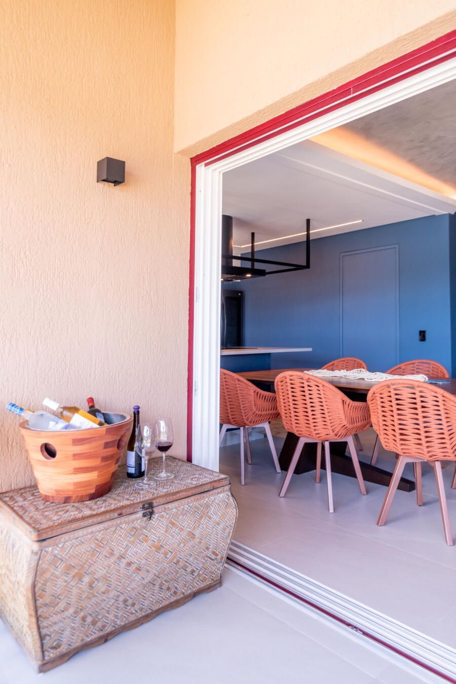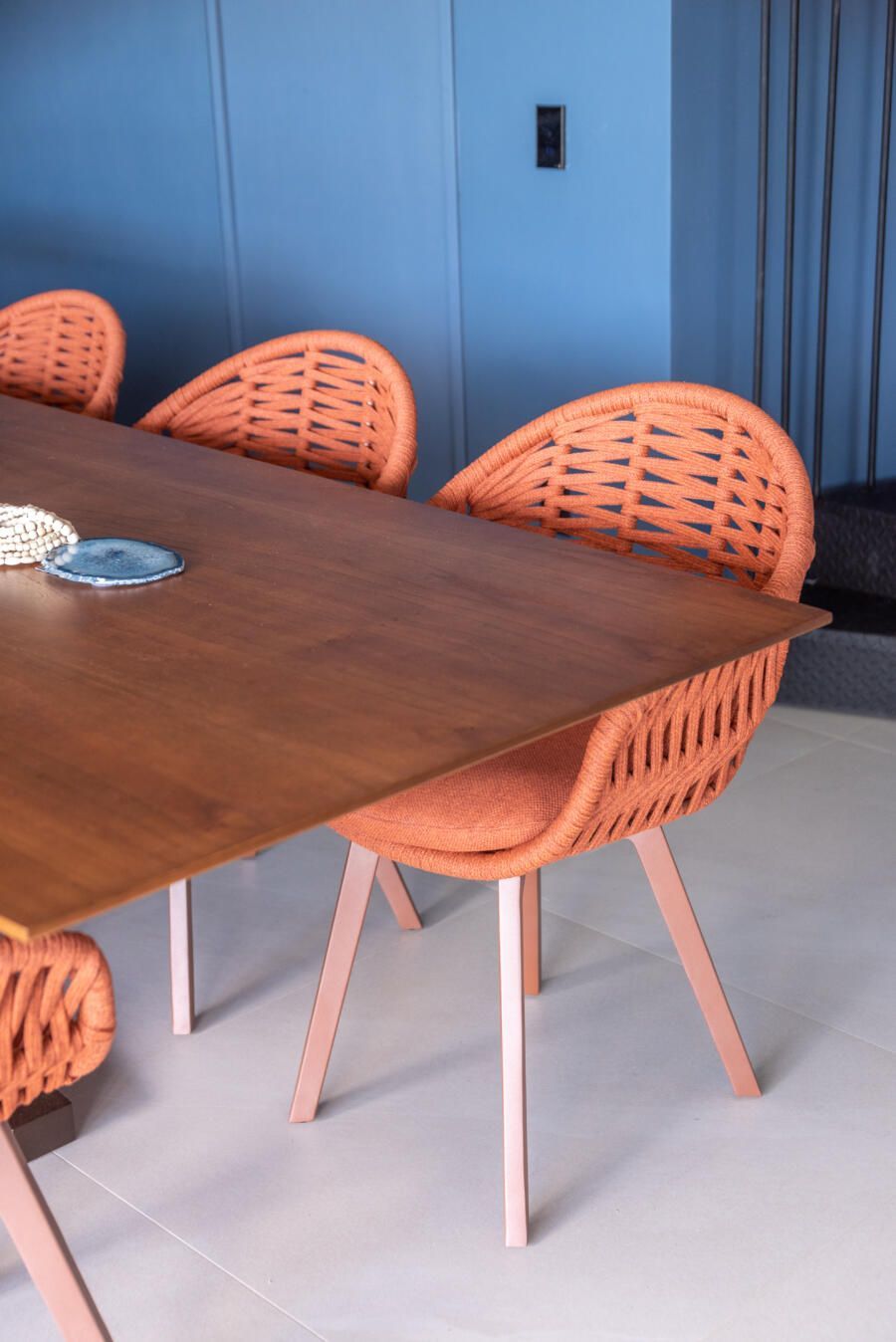 Apesar de praiana, a decoração da casa não segue o tema. Ao invés disso, elementos naturais como o cimento queimado e cores vivas ganham destaque, inclusive com uma cozinha azul.