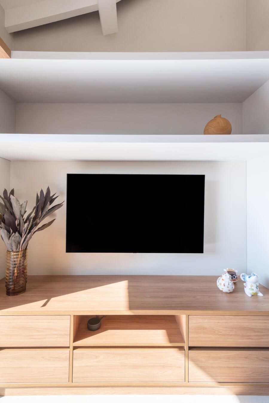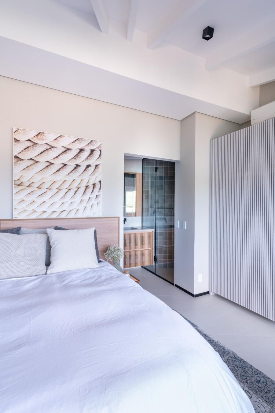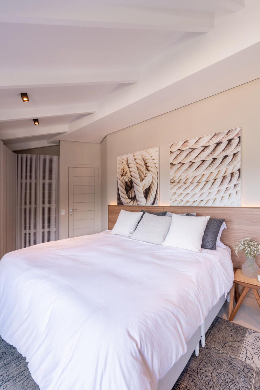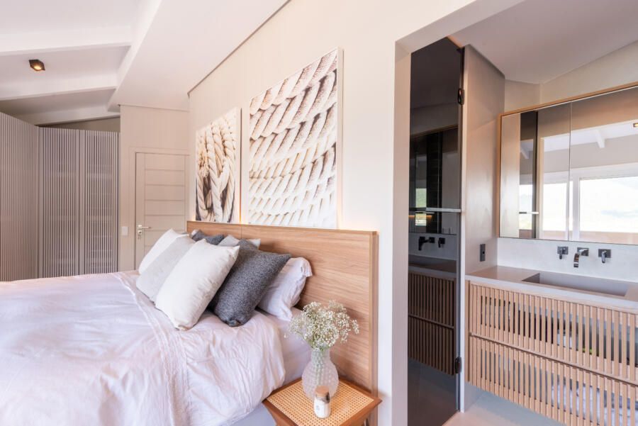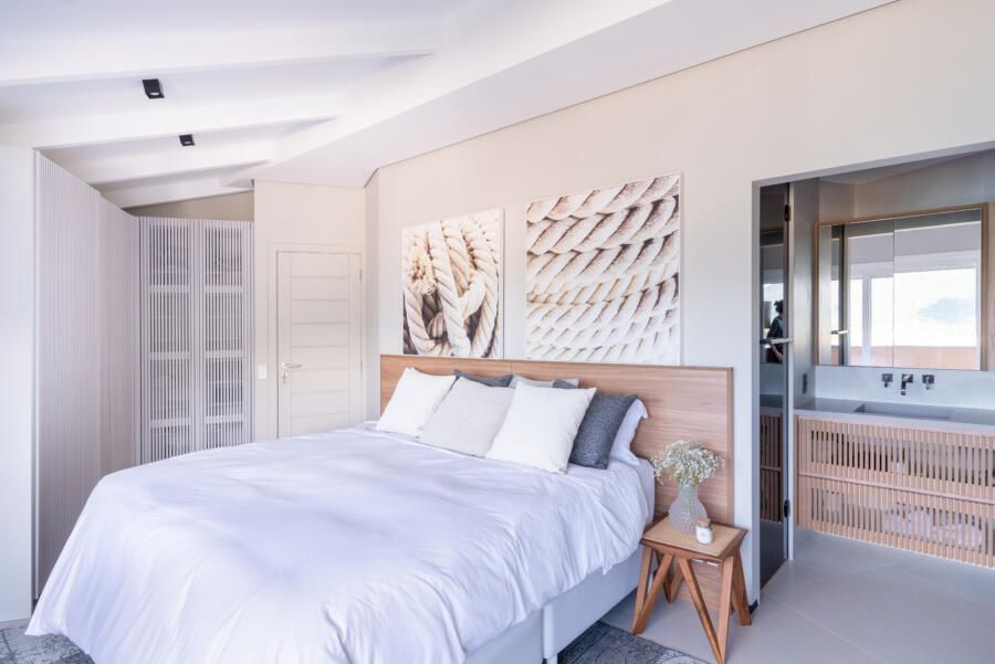 “Foi feita uma reforma completa com alteração de escada e abertura de vãos para integração dos ambientes para valorizar a vista que sempre foi um dos principais pedidos do casal. A praia que emoldura todo o apartamento serviu de inspiração, antes uma escada e dormitório de serviço impediam a visão, então a alteração estrutural da escada permitiu a nova configuração.”