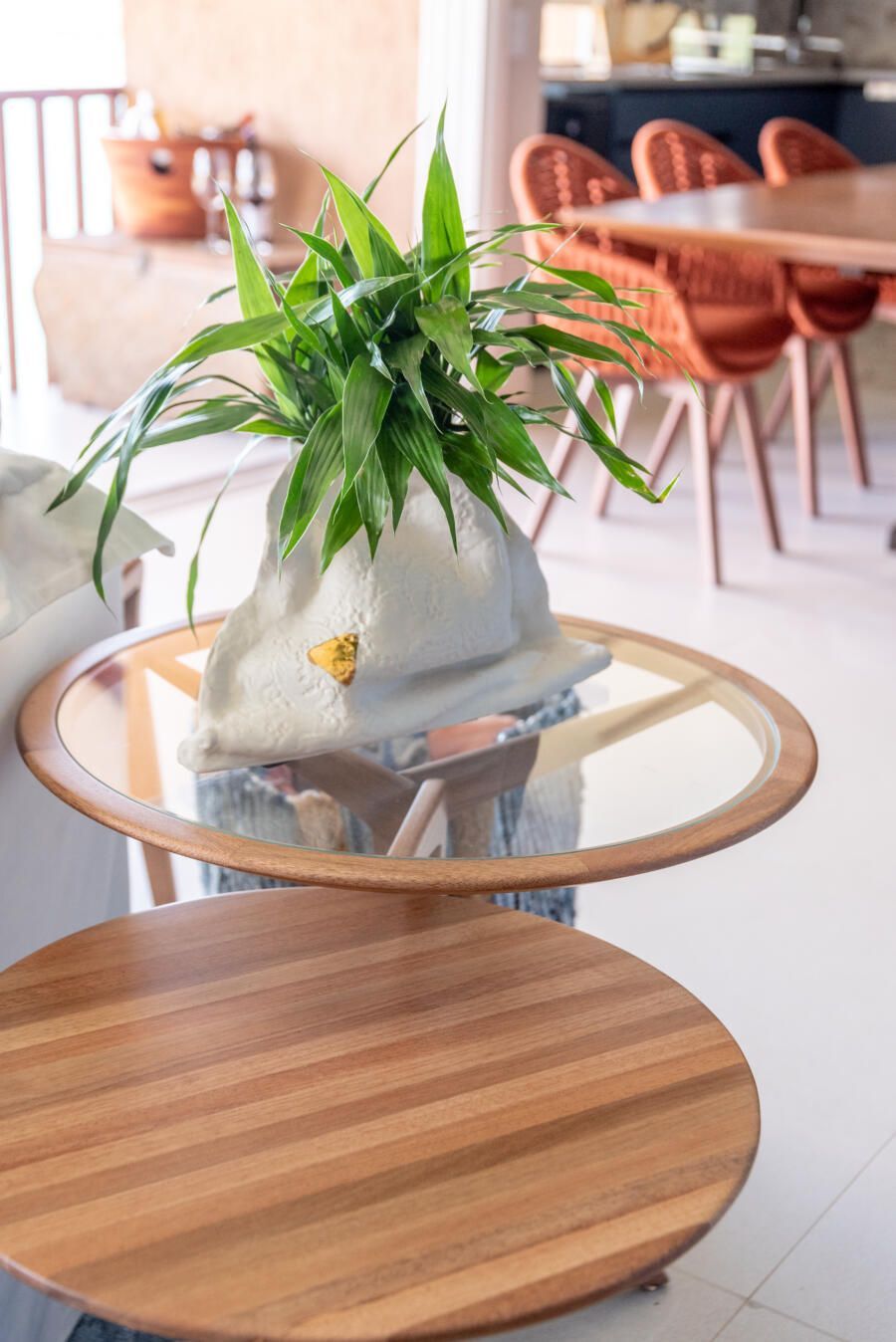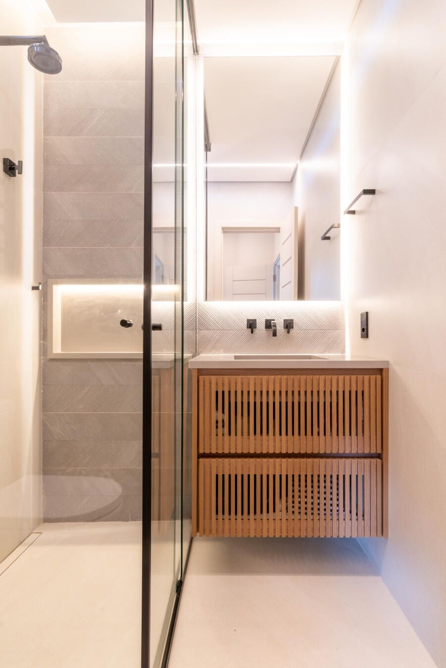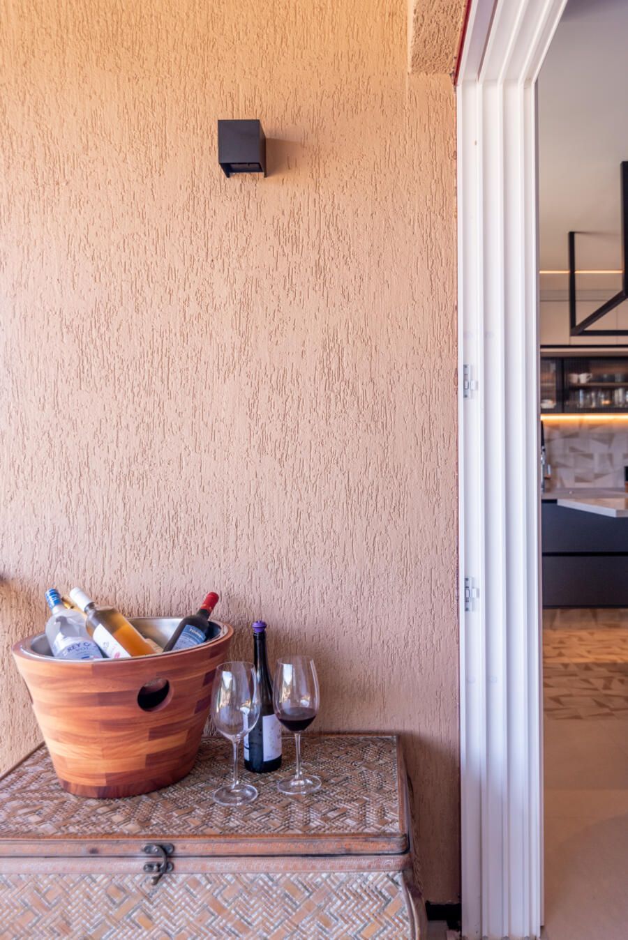 “Foi feita uma reforma completa com alteração de escada e abertura de vãos para integração dos ambientes para valorizar a vista que sempre foi um dos principais pedidos do casal. A praia que emoldura todo o apartamento serviu de inspiração, antes uma escada e dormitório de serviço impediam a visão, então a alteração estrutural da escada permitiu a nova configuração.”