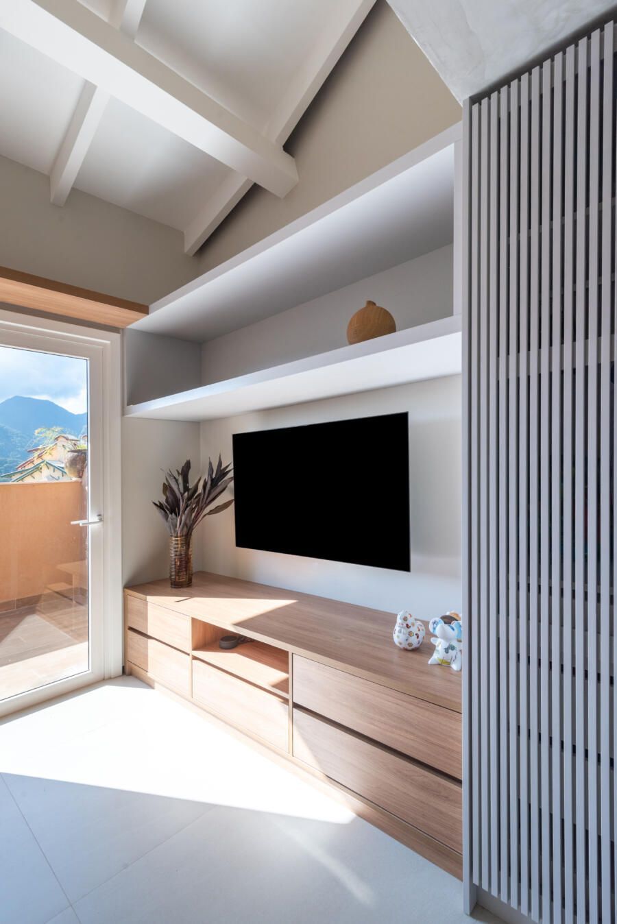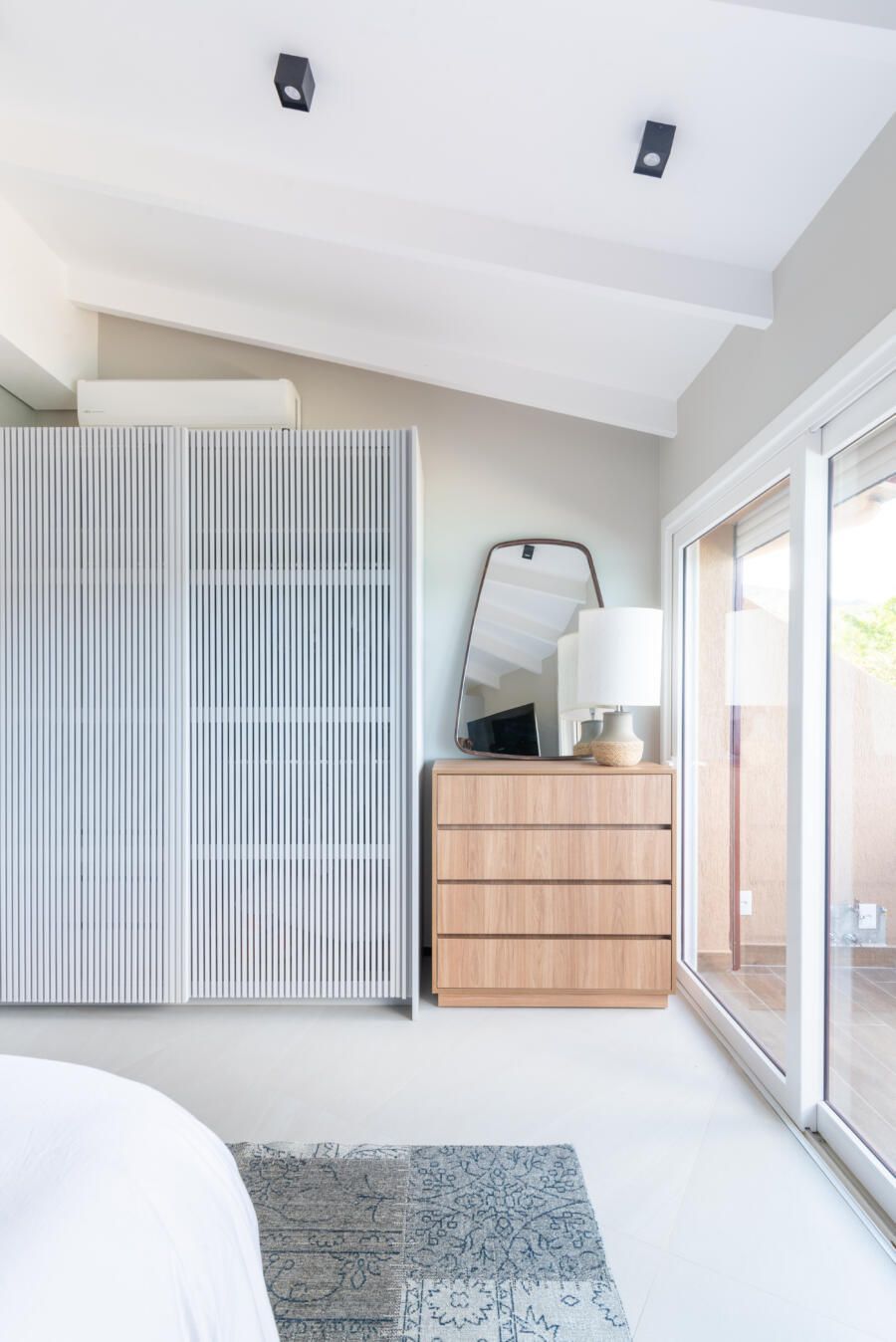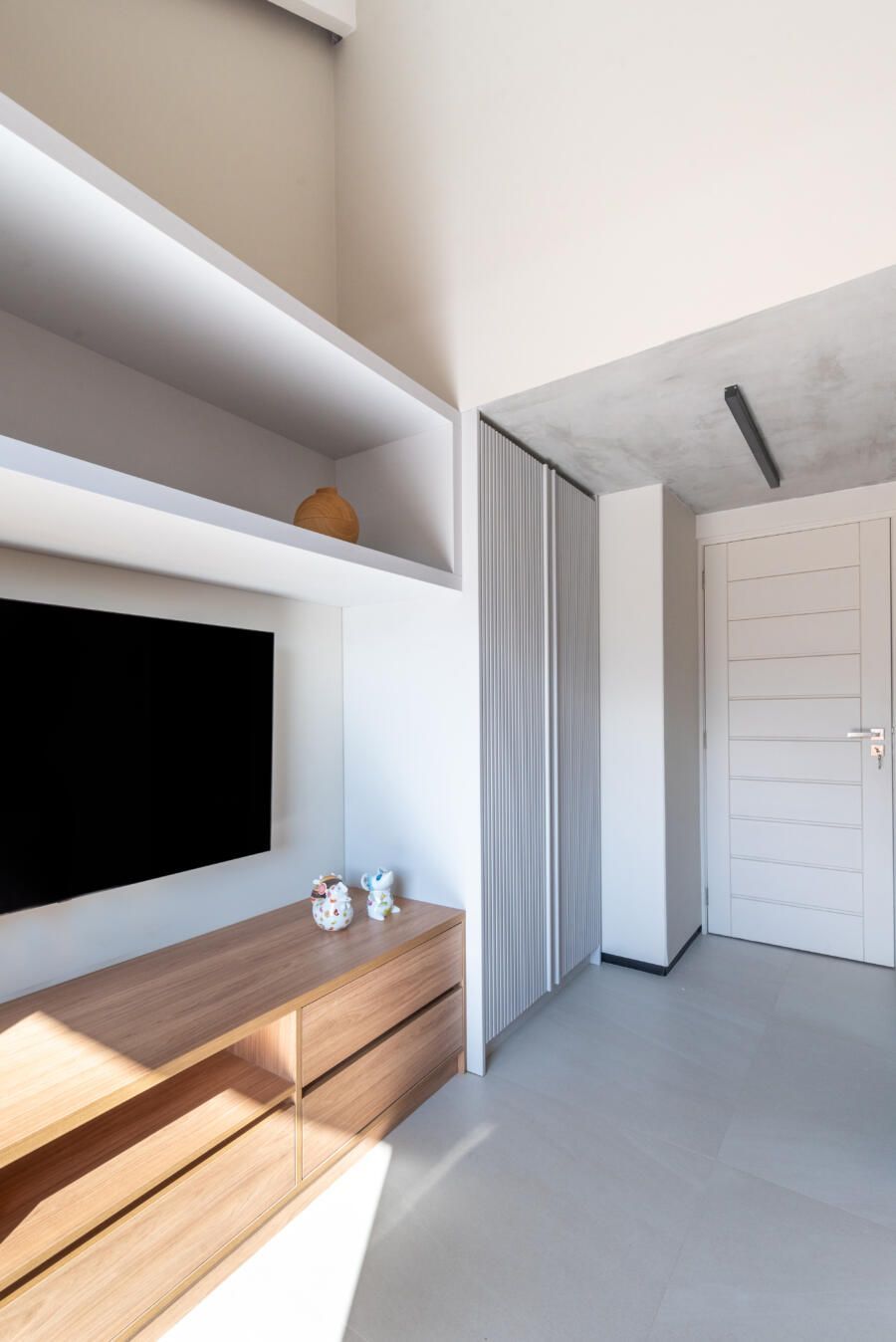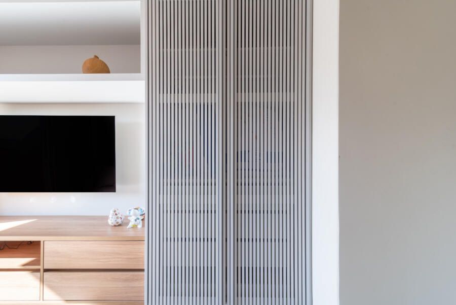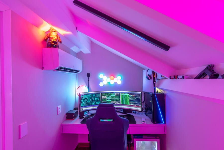 “A criação de um mezanino na inclinação do telhado, o terceiro pavimento (com uma escada móvel para parede) tinha como função acomodar o hobby de jogar do Alê, que já virou um job para ele, de consultoria e avaliação de jogos no Metaverso.”