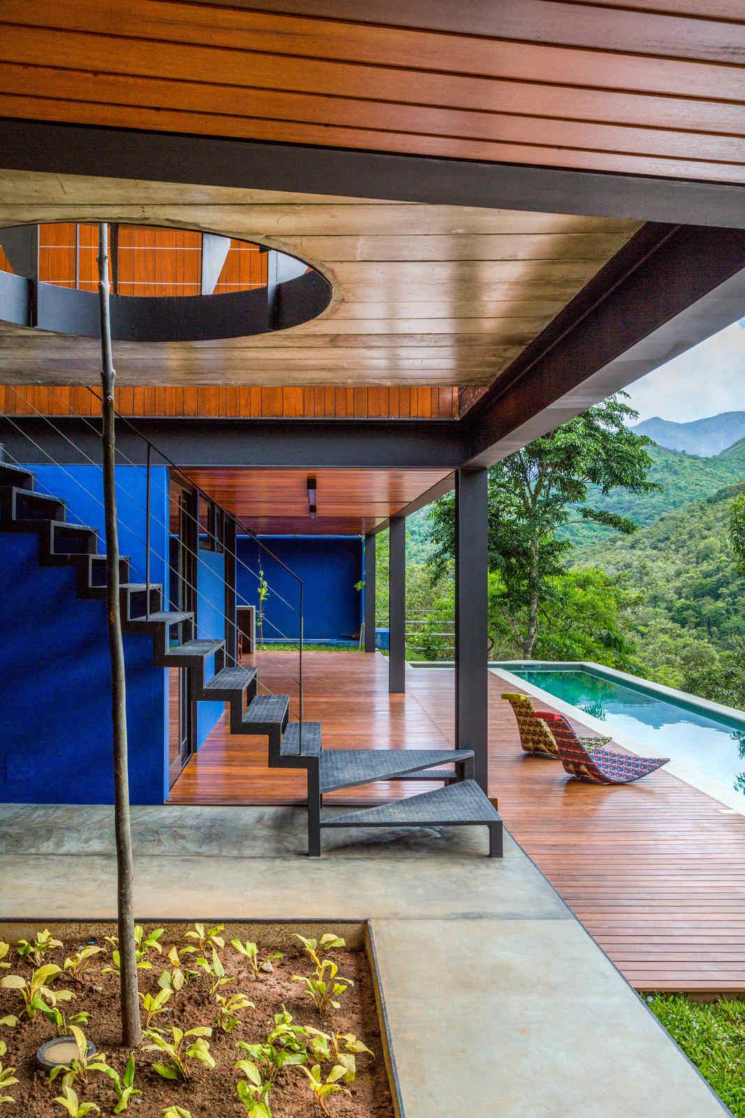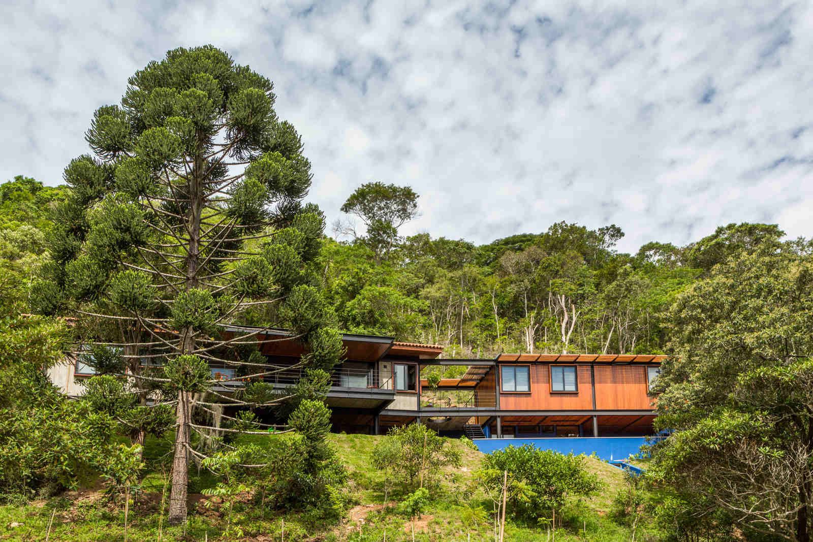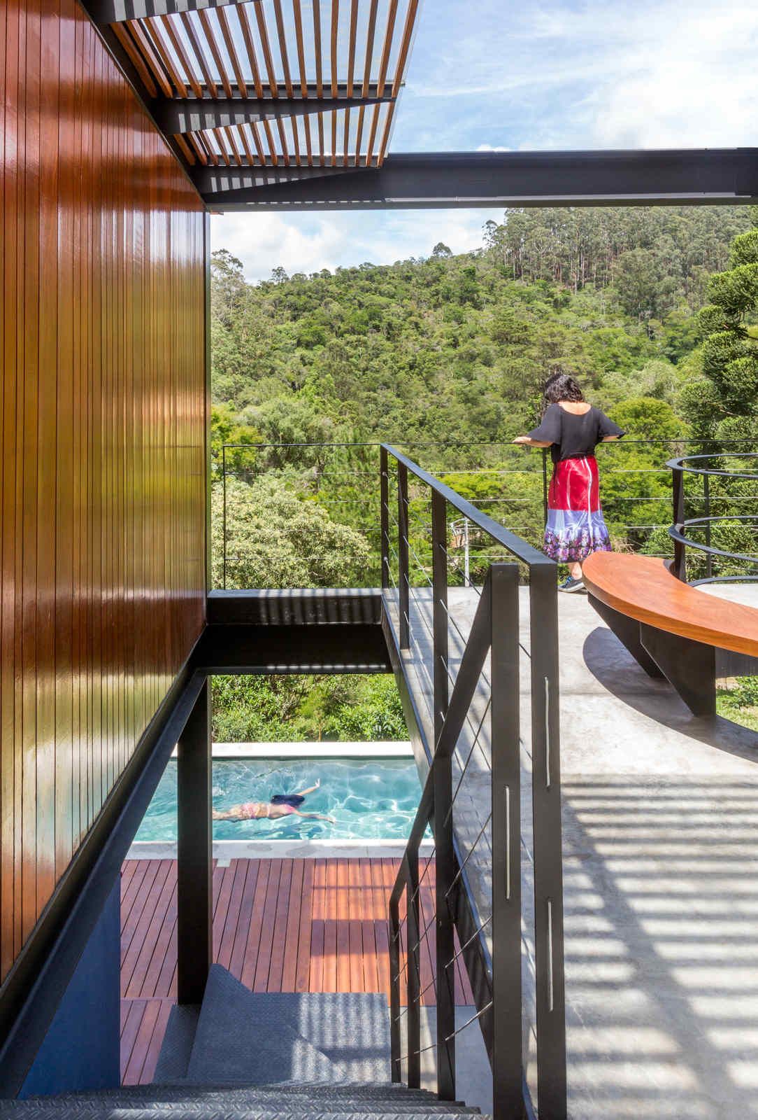 “Depois de quatro meses de estudos intensos, o escritório concluiu que o melhor formato seria dividir a planta em duas áreas, alterando o mínimo possível a topografia do lugar: uma parte englobando a área social e a suíte master e outra com sala de TV e quartos de hóspedes. Toda a ala de serviços e o lazer, incluindo a piscina em raia e a sauna, ficaram embaixo, em meio a pilotis de aço, que, além de sustentarem a edificação, ajudaram a manter este pavimento aberto. Dessa forma, a construção venceu, com suavidade, a inclinação de cerca de 30° do terreno.”