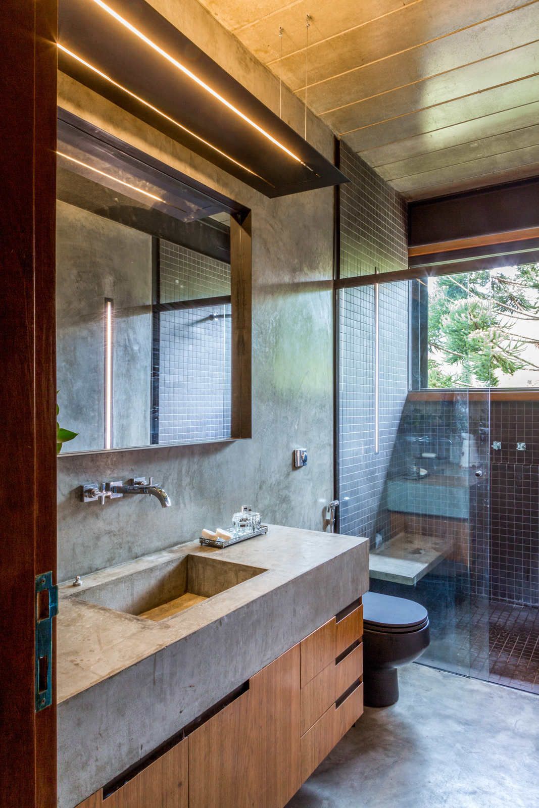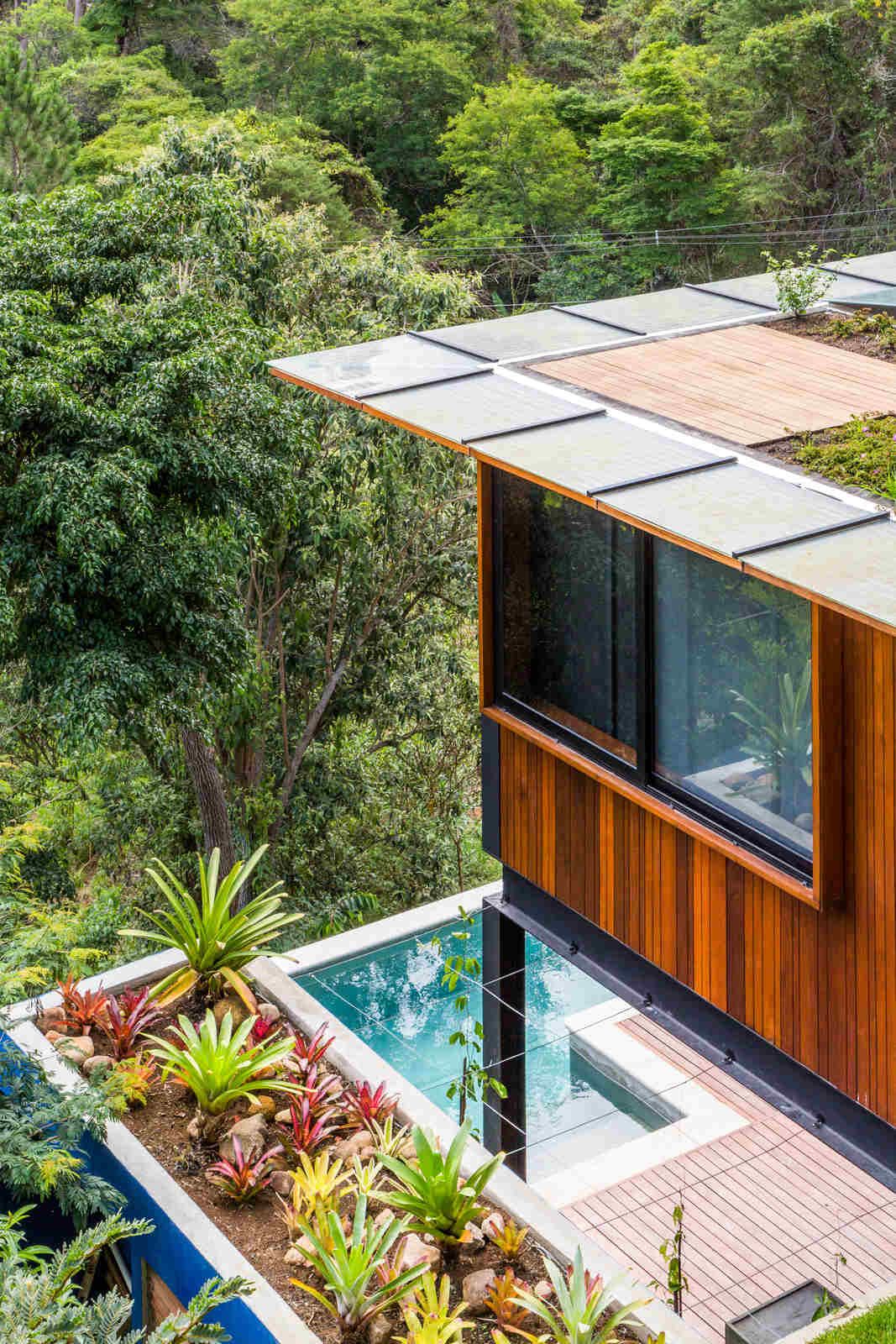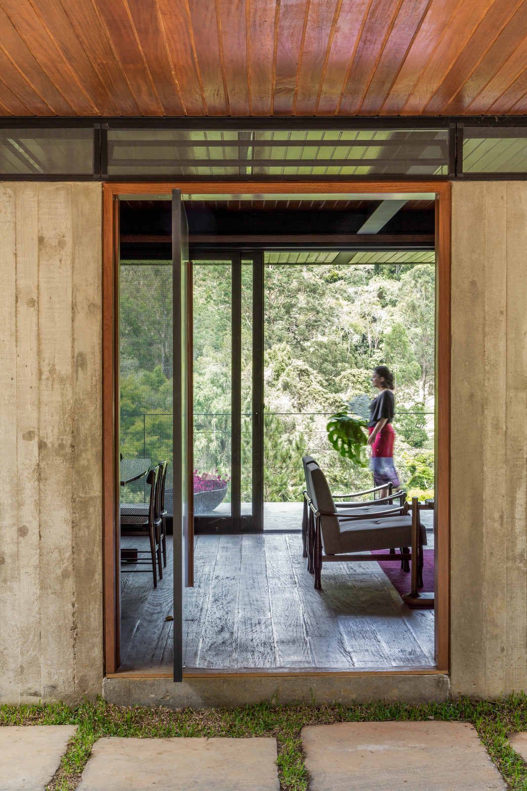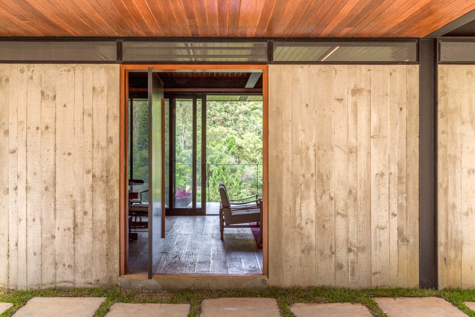 “Depois de quatro meses de estudos intensos, o escritório concluiu que o melhor formato seria dividir a planta em duas áreas, alterando o mínimo possível a topografia do lugar: uma parte englobando a área social e a suíte master e outra com sala de TV e quartos de hóspedes. Toda a ala de serviços e o lazer, incluindo a piscina em raia e a sauna, ficaram embaixo, em meio a pilotis de aço, que, além de sustentarem a edificação, ajudaram a manter este pavimento aberto. Dessa forma, a construção venceu, com suavidade, a inclinação de cerca de 30° do terreno.”