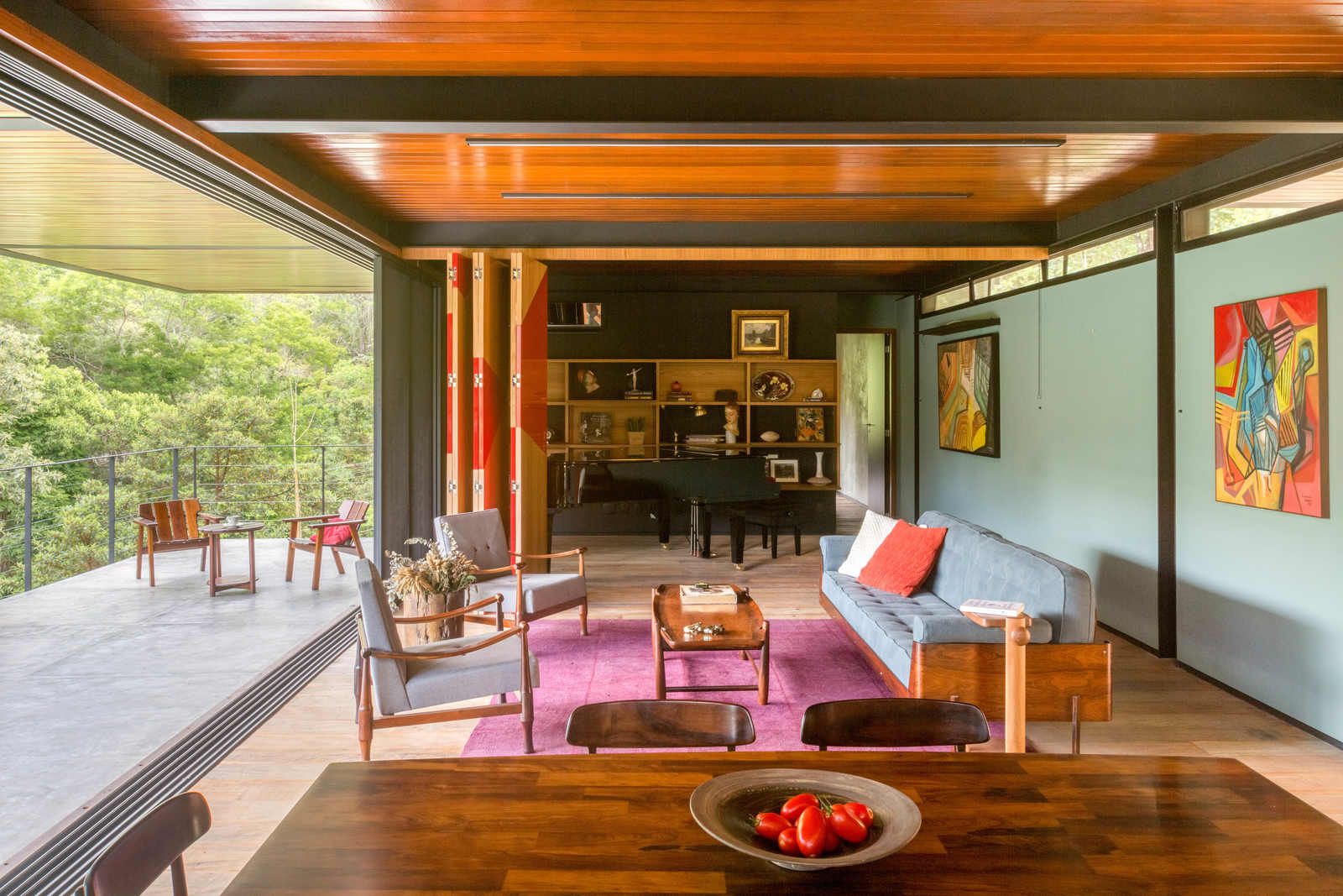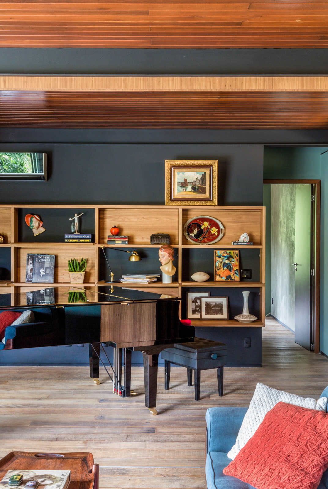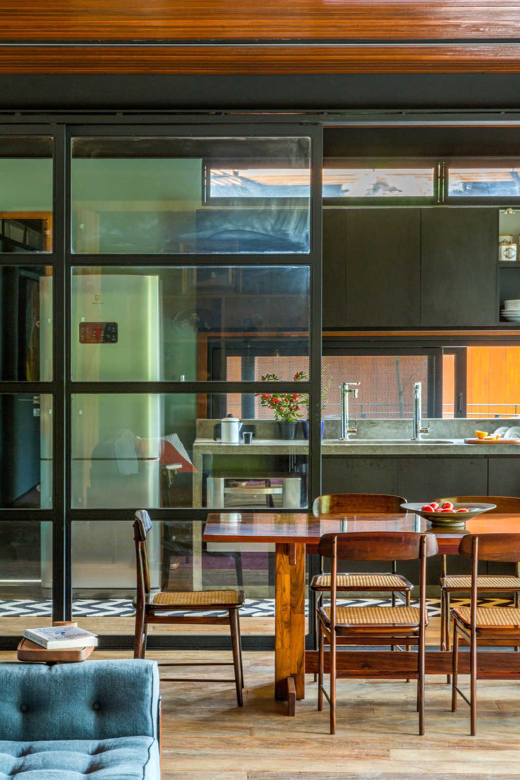 “Como o morador costuma garimpar móveis dos anos 50 e 60, buscamos projetar espaços contemporâneos já pensando na integração dessas peças.”