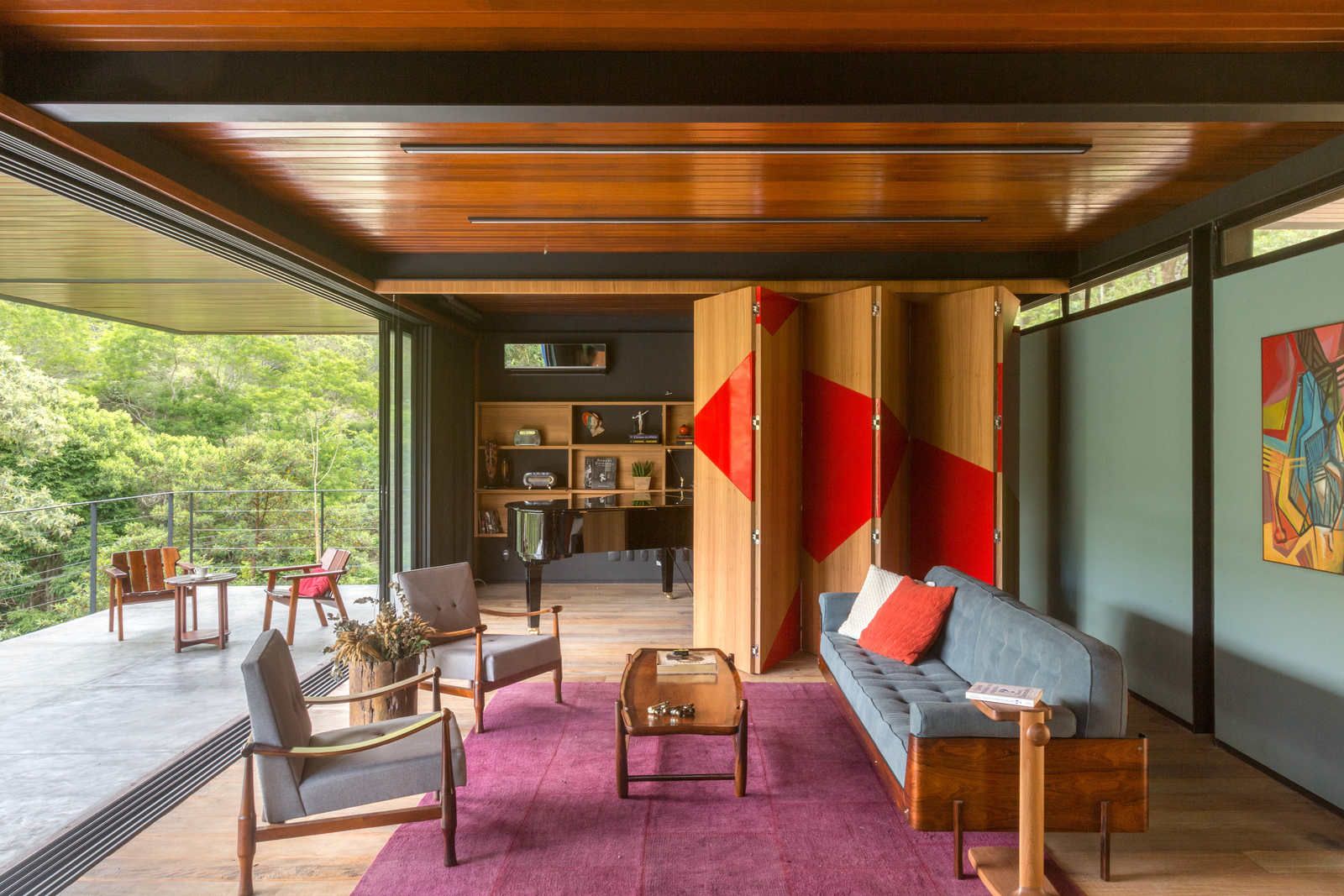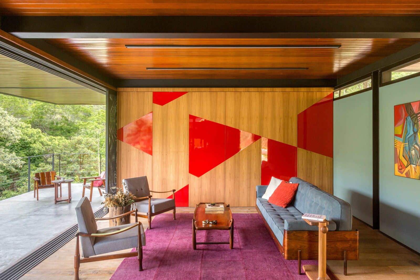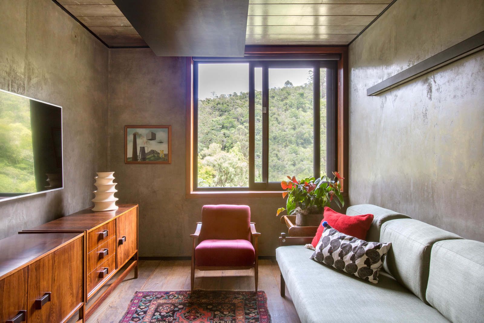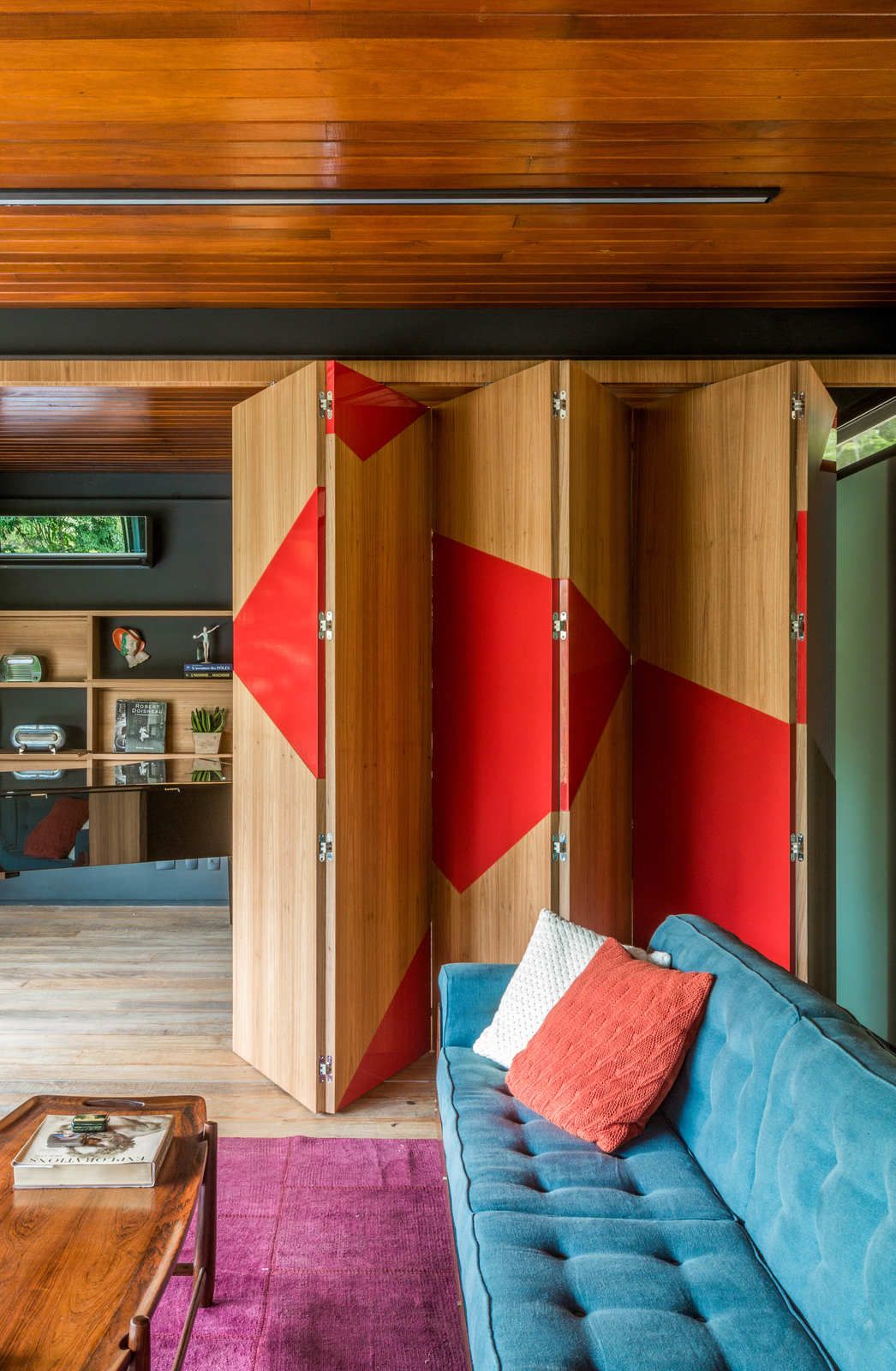 “Como o morador costuma garimpar móveis dos anos 50 e 60, buscamos projetar espaços contemporâneos já pensando na integração dessas peças.”