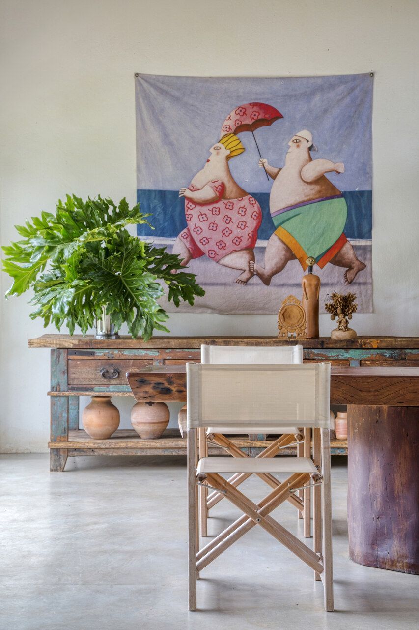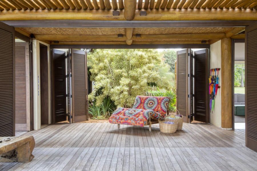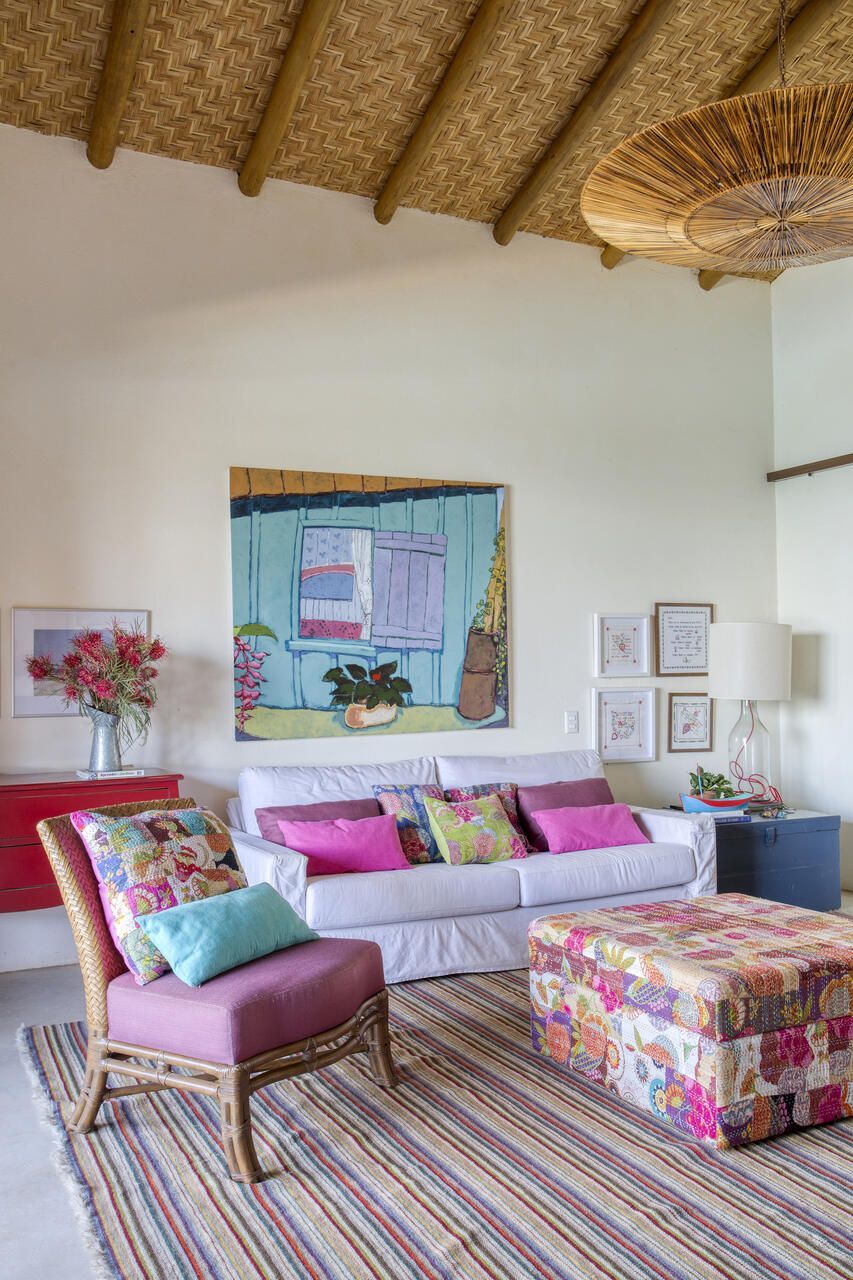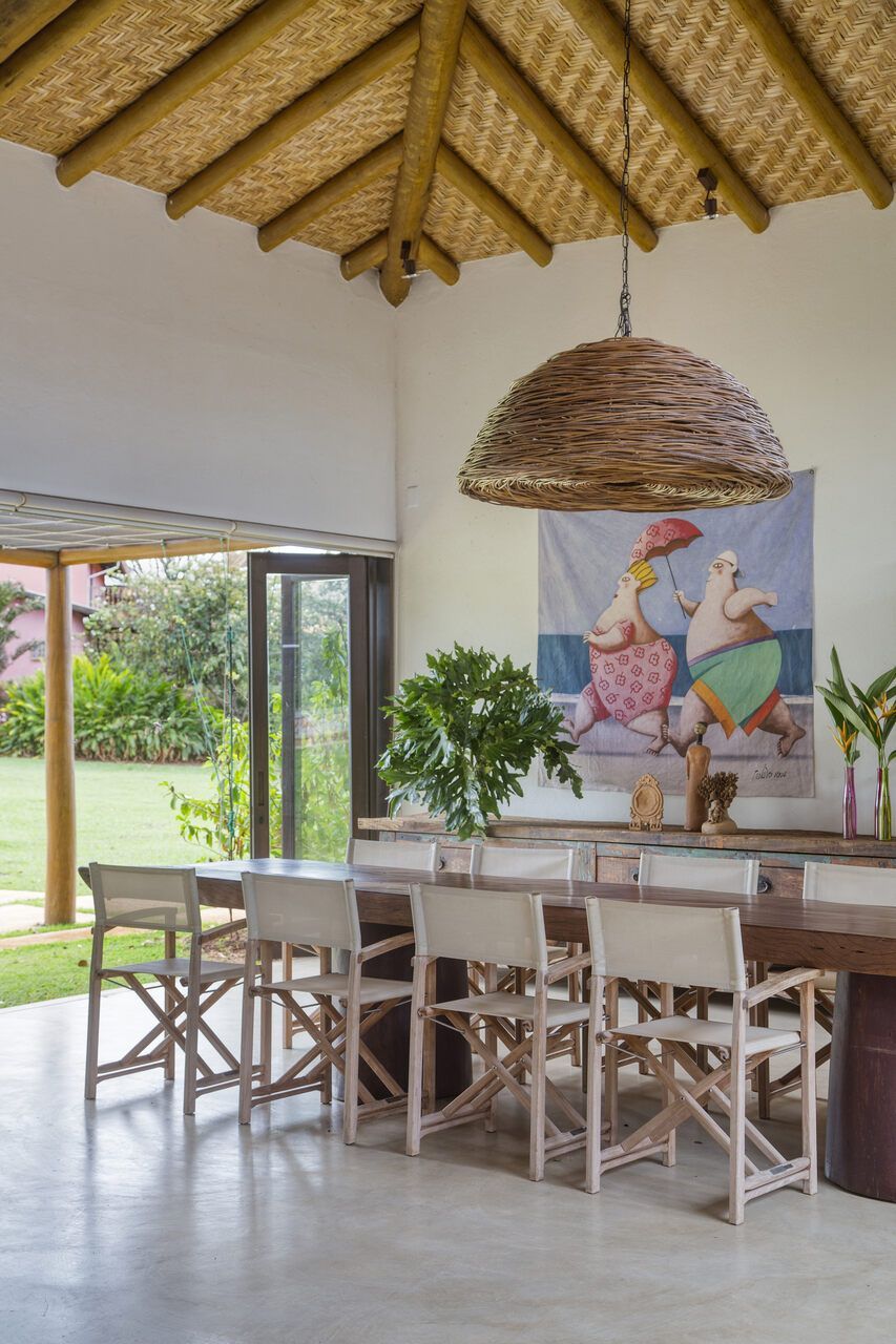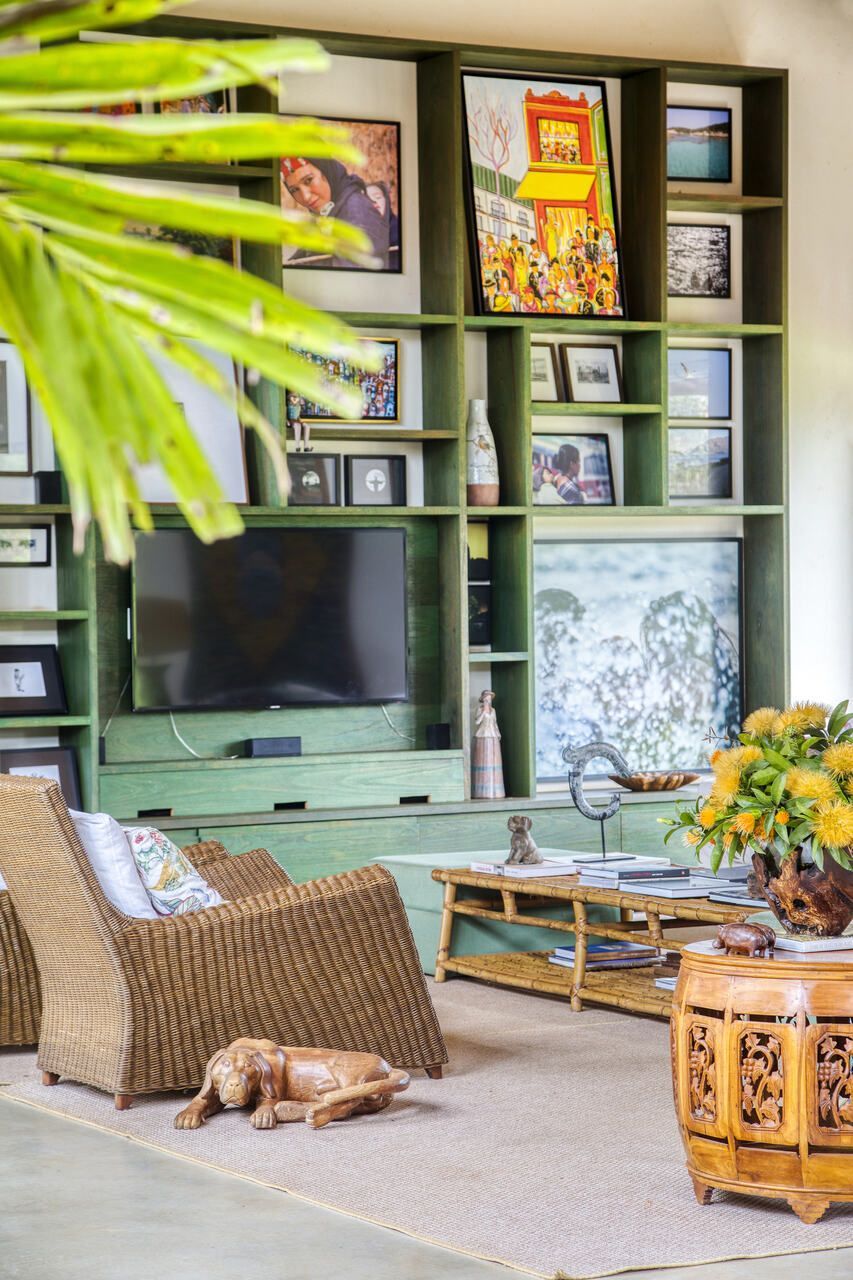 Grande parte dos móveis e adornos utilizados na decoração foi reaproveitada do acervo pessoal dos proprietários, incluindo obras de arte e fotografias de viagens. Para equilibrar os elementos coloridos e estampados, a arquiteta optou por uma paleta neutra nos interiores, com paredes brancas e piso cinza claro. Já nos ambientes externos, os tons terrosos e naturais criam harmonia com a paisagem ao redor.