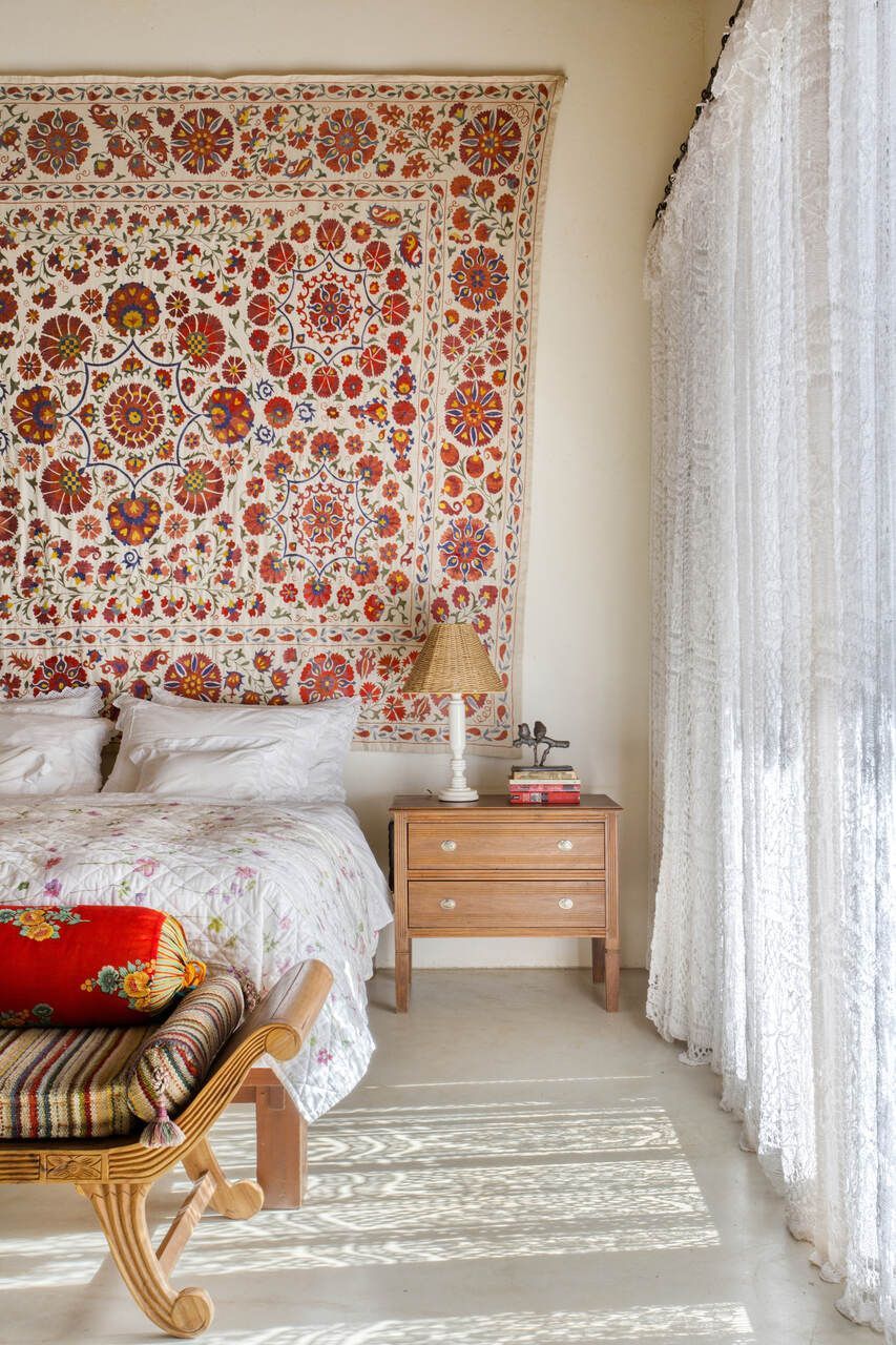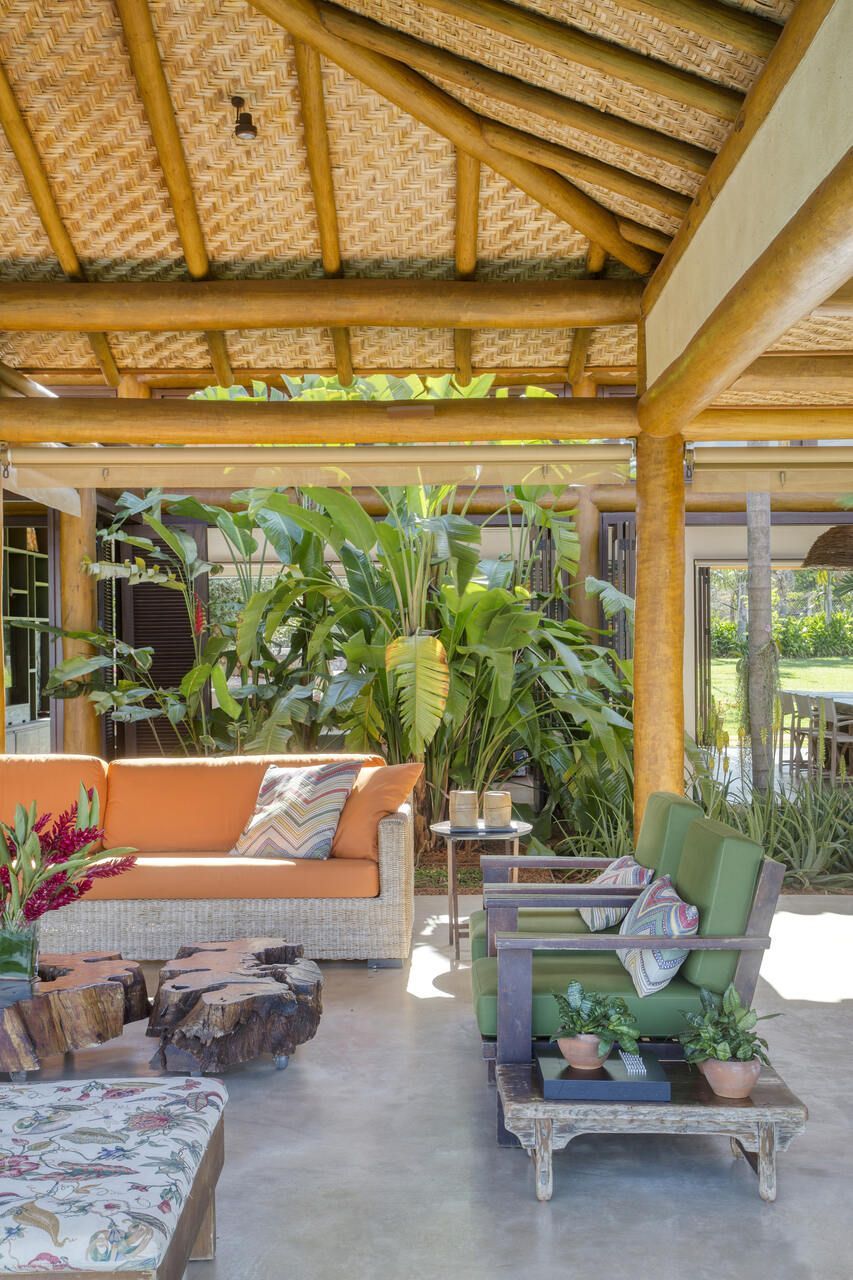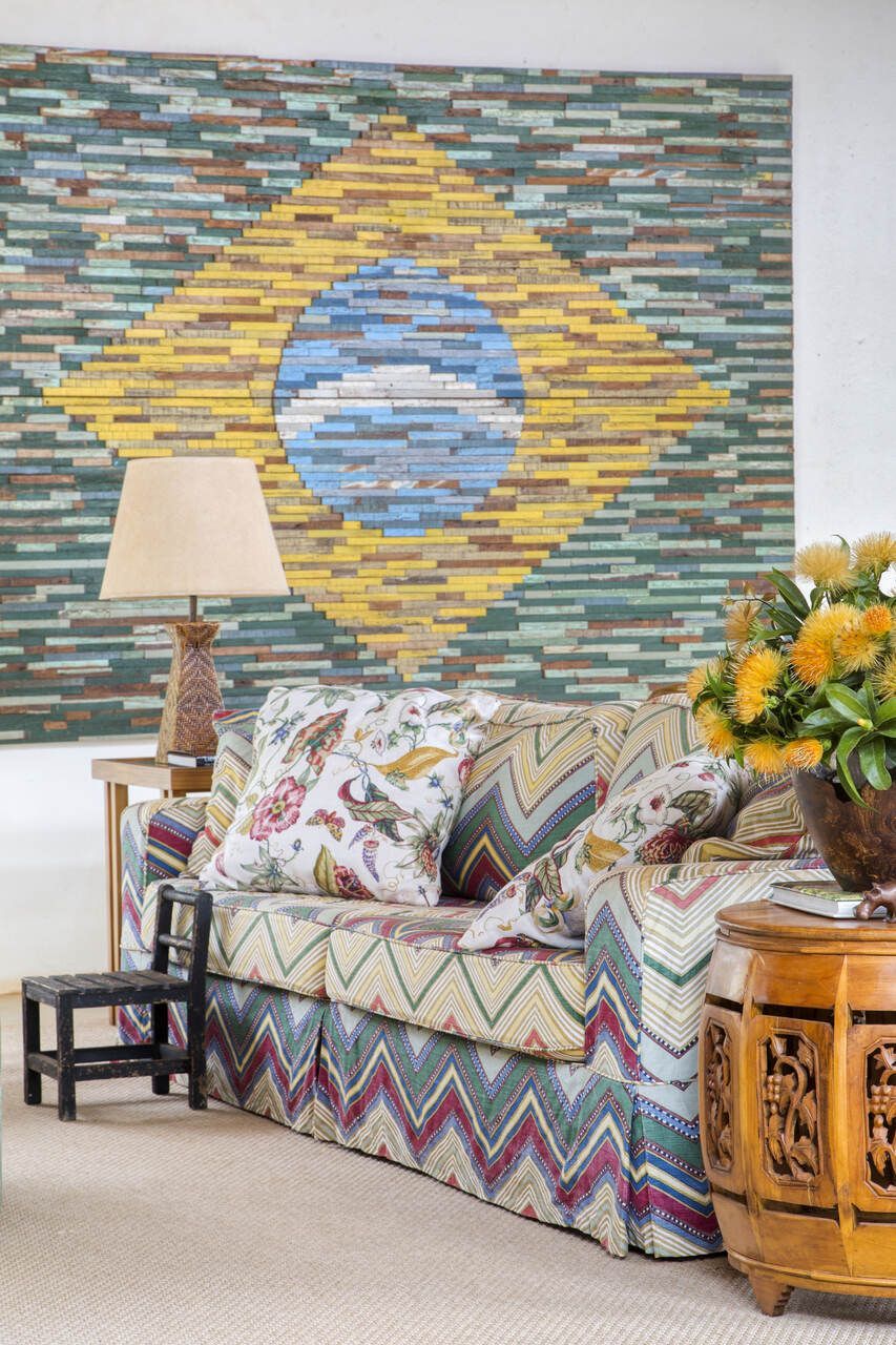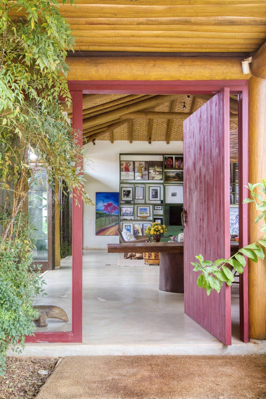 Grande parte dos móveis e adornos utilizados na decoração foi reaproveitada do acervo pessoal dos proprietários, incluindo obras de arte e fotografias de viagens. Para equilibrar os elementos coloridos e estampados, a arquiteta optou por uma paleta neutra nos interiores, com paredes brancas e piso cinza claro. Já nos ambientes externos, os tons terrosos e naturais criam harmonia com a paisagem ao redor.