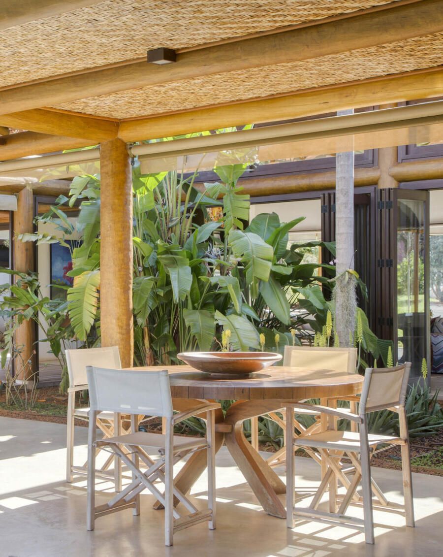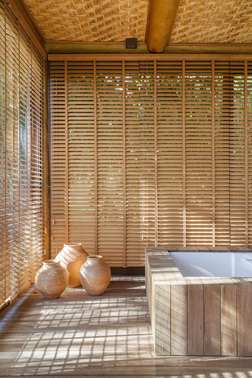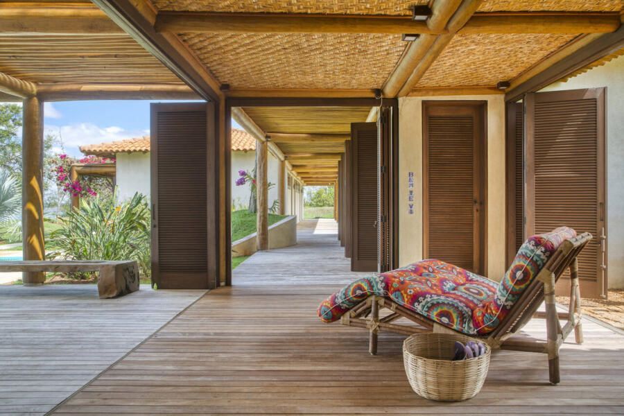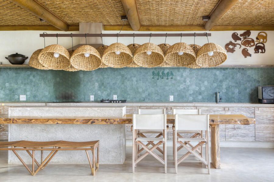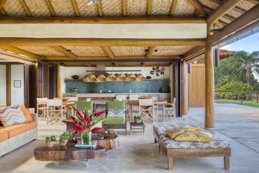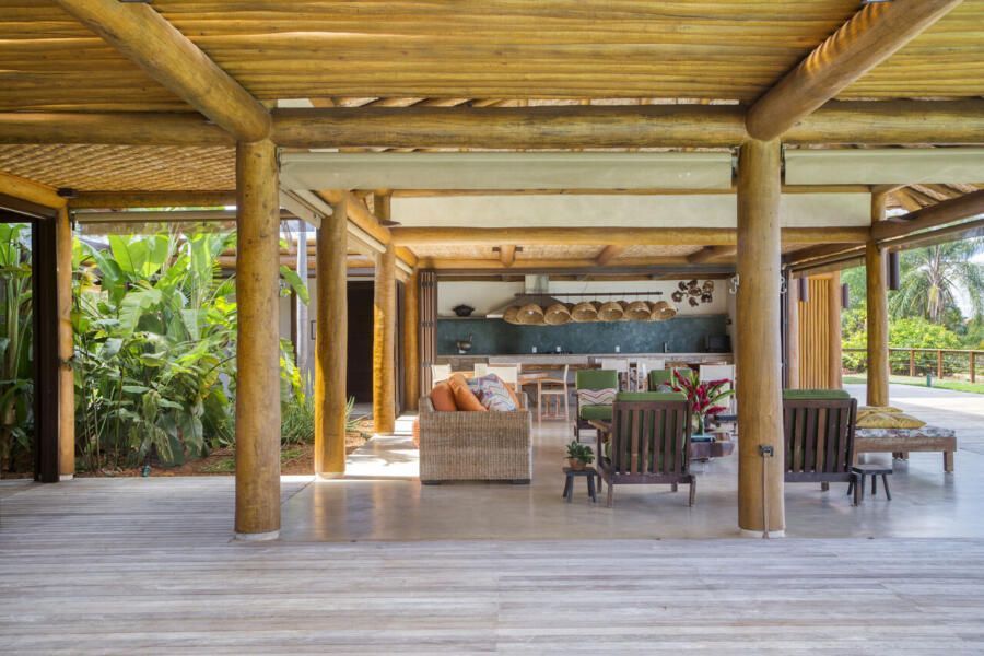 A inspiração em pousadas é evidente na estrutura em pau roliço (toras) de eucalipto, vigas metálicas e esquadrias de madeira com portas venezianas ou vidro transparente. O forro em taquara – casca de bambu trançada – e o piso de tecnocimento em cinza claro completam a escolha de materiais que privilegia praticidade e beleza. Na área externa, destaca-se o deck de madeira que amplia a sensação de contato com a natureza.