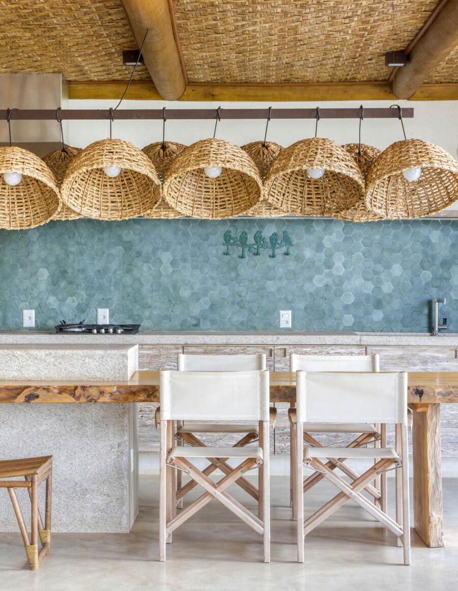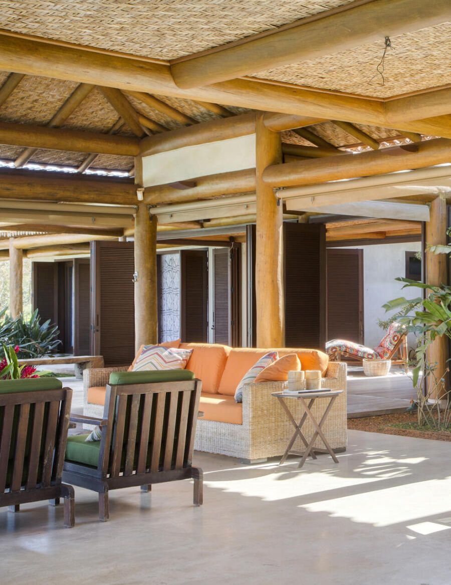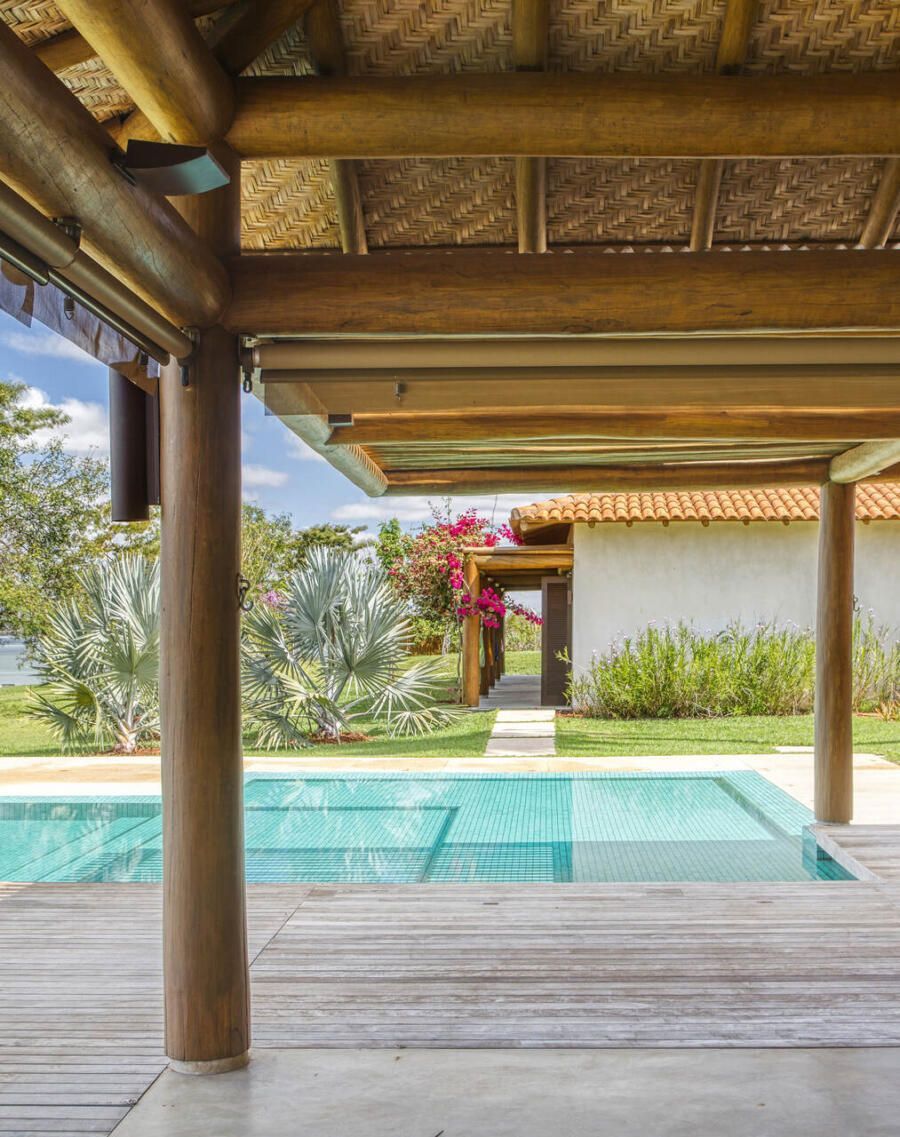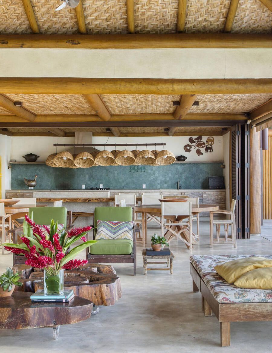 A inspiração em pousadas é evidente na estrutura em pau roliço (toras) de eucalipto, vigas metálicas e esquadrias de madeira com portas venezianas ou vidro transparente. O forro em taquara – casca de bambu trançada – e o piso de tecnocimento em cinza claro completam a escolha de materiais que privilegia praticidade e beleza. Na área externa, destaca-se o deck de madeira que amplia a sensação de contato com a natureza.