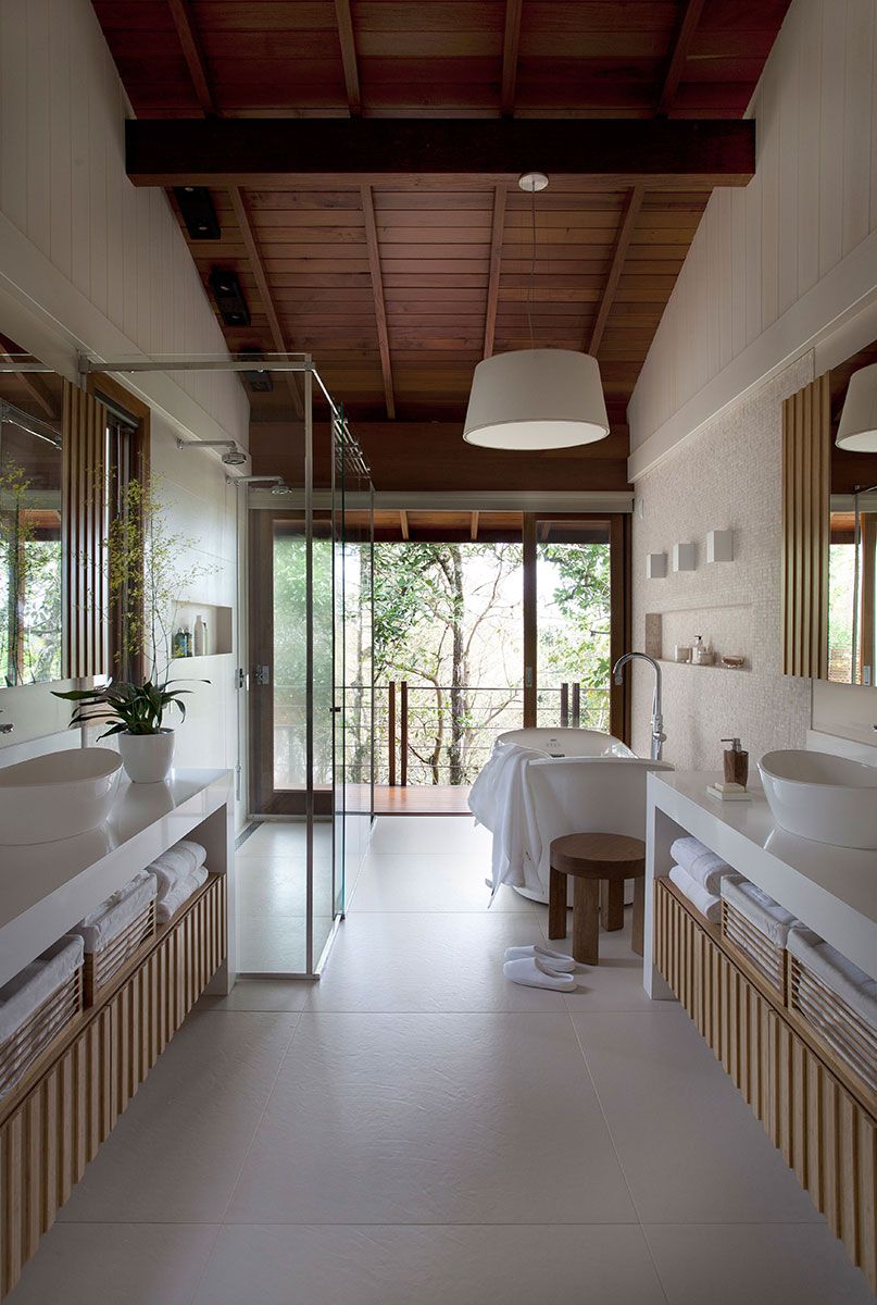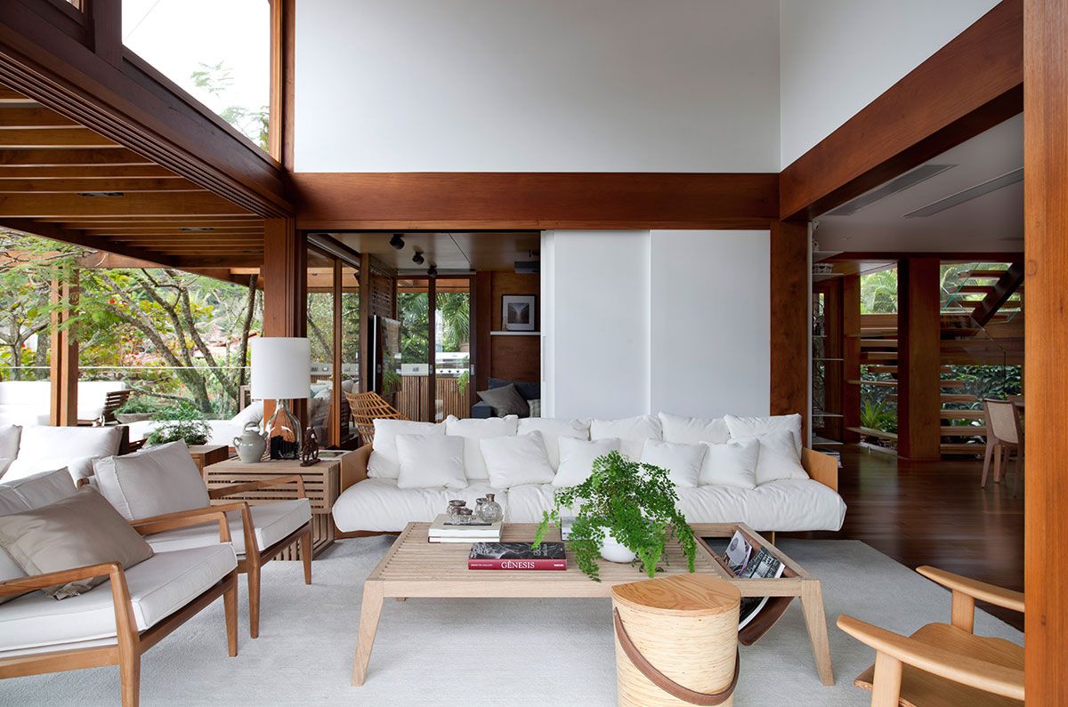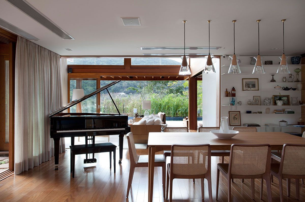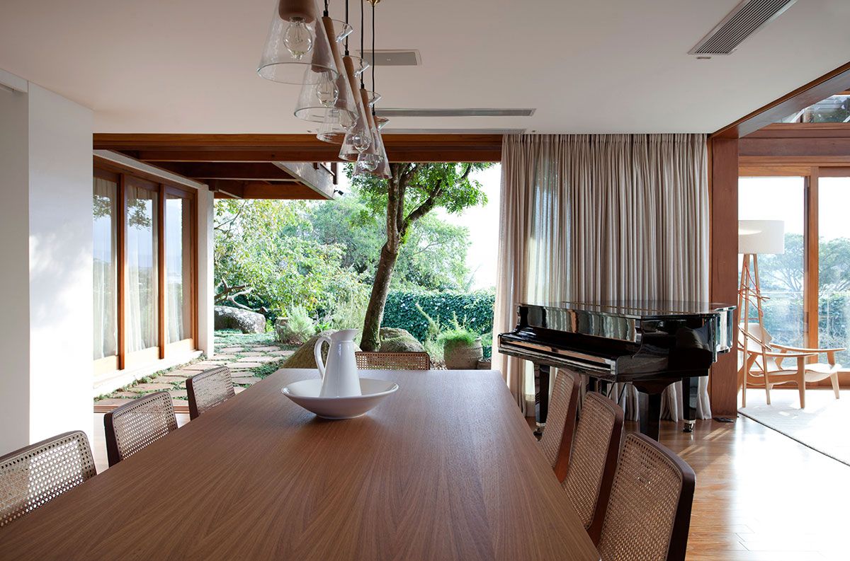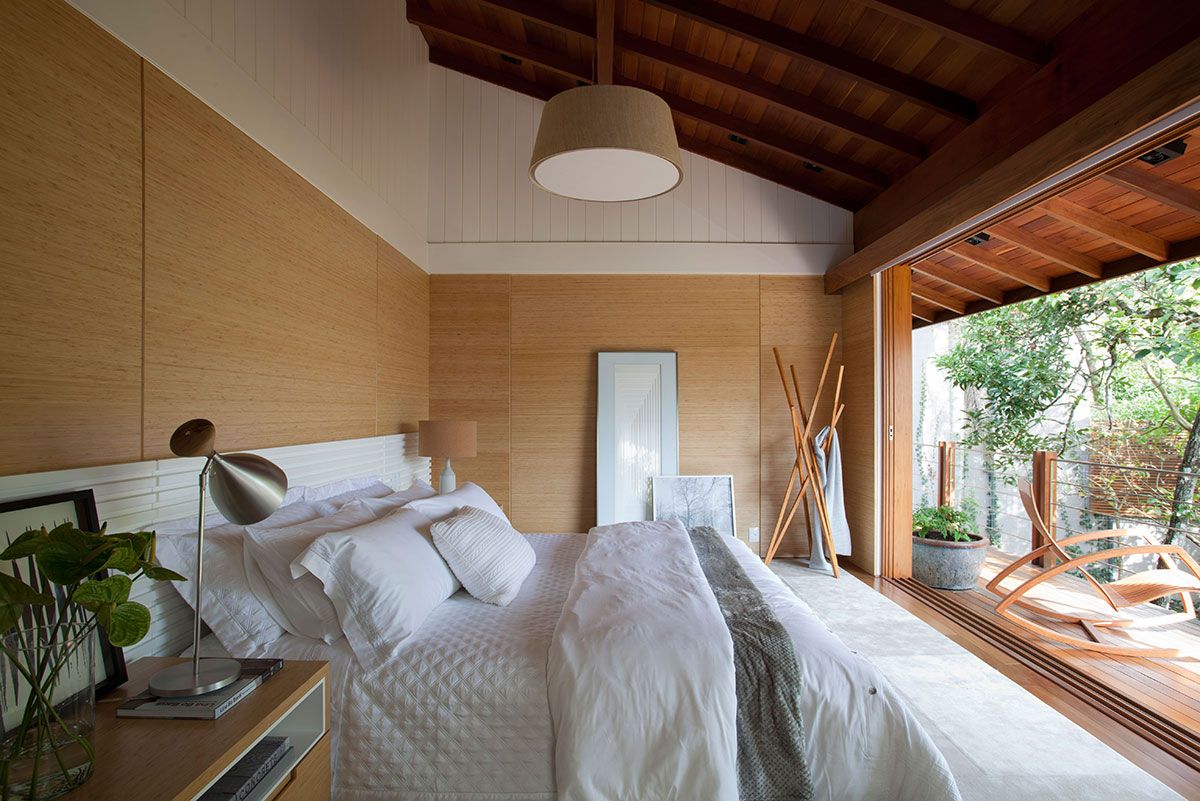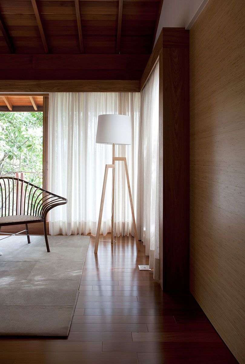 Uma casa natural, com total integração à natureza ao redor, e que esbanjasse simplicidade, foi o pedido dos clientes. Dividida em subsolo, com garagem e sauna, e dois andares, a casa concentra no térreo as áreas sociais, como sala, varanda, home theater, piscina, cozinha e espaço gourmet. Acima, há os quartos das duas filhas, o de hóspedes e o do casal. A paleta de cores se baseia em tons neutros, que junto da madeira clara de freijó e bambu, conferem sintonia e pureza aos espaços.