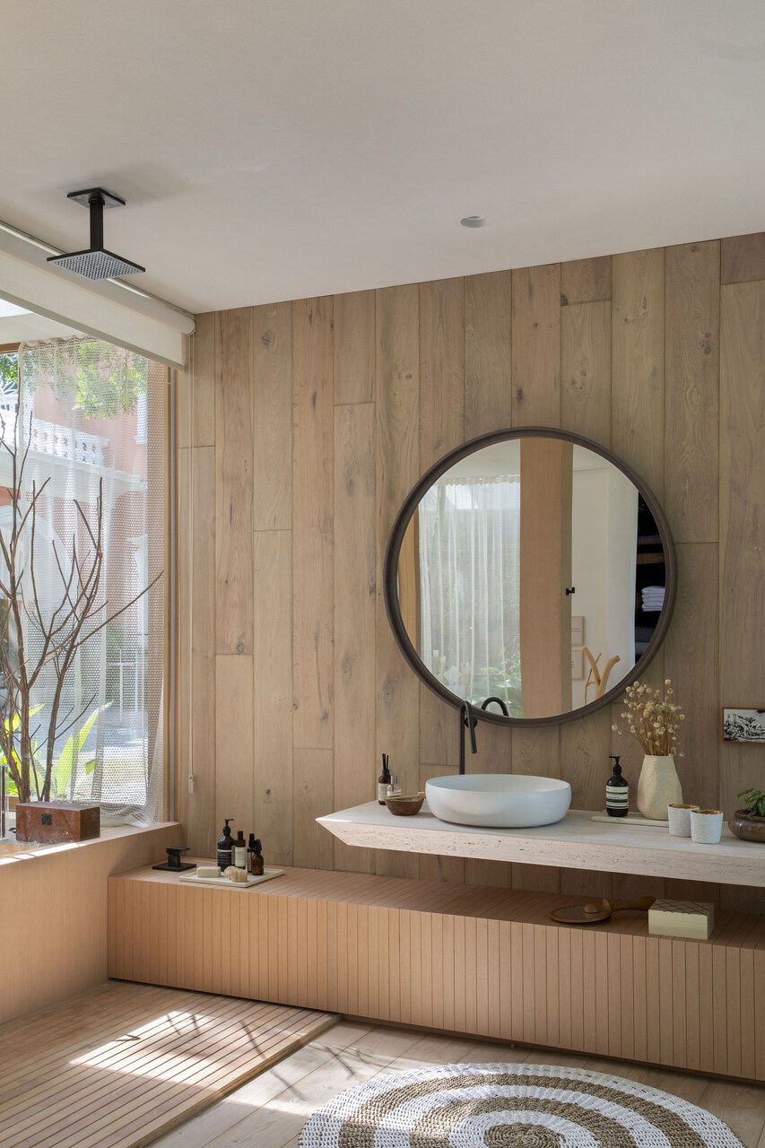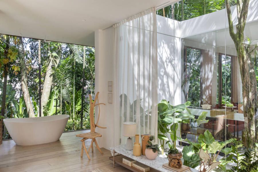 Por fim, a cozinha concentrada em ilha e o banheiro-spa dedicado ao autocuidado, com a banheira de imersão voltada para o jardim externo, trazem aconchego e elegância ao projeto.