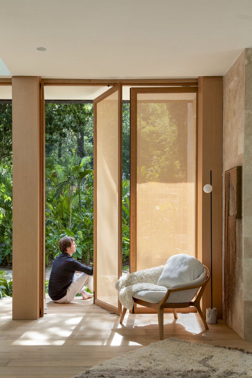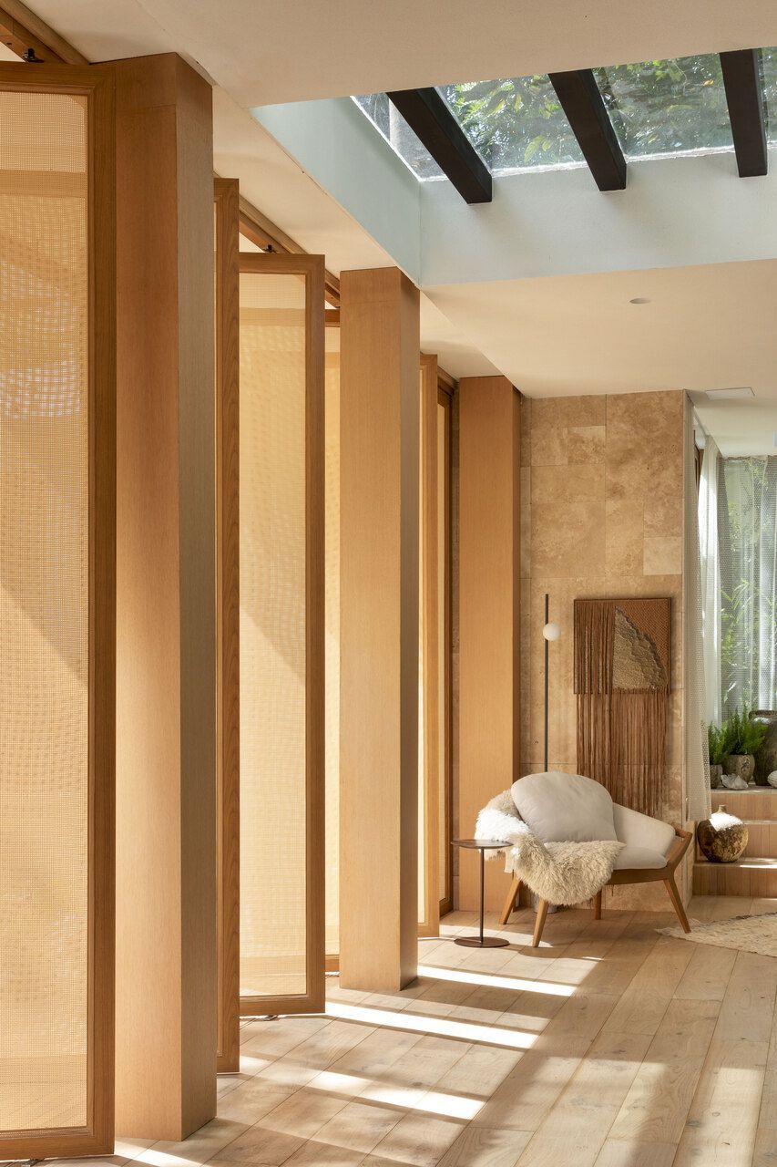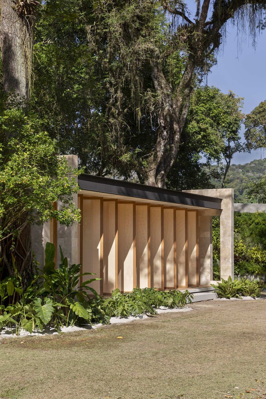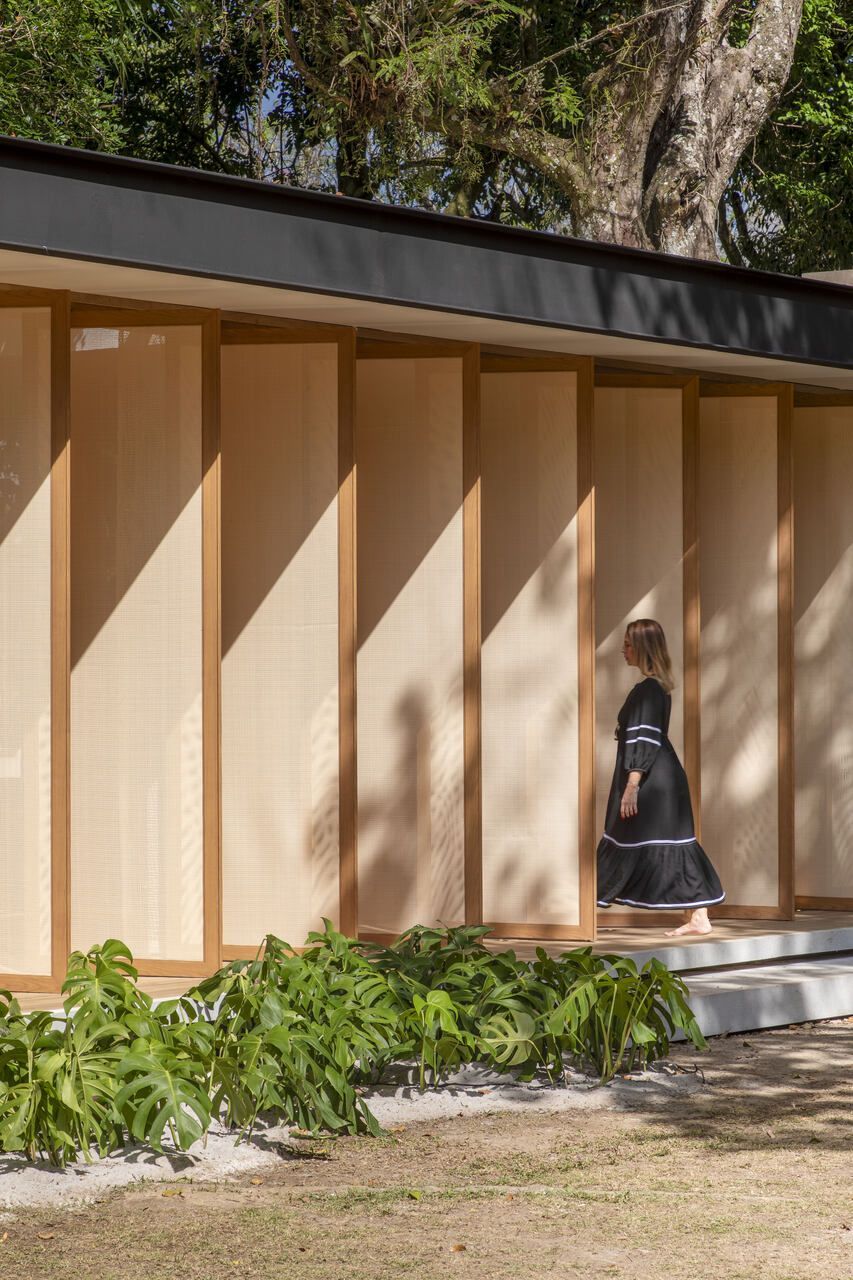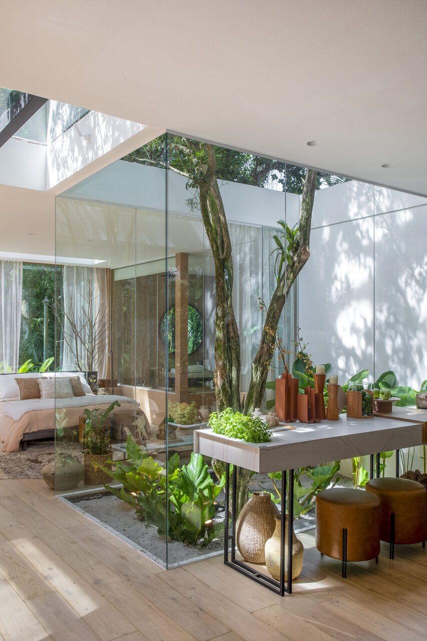 O rasgo no teto é outro grande destaque do projeto. Por ele, uma grande árvore existente no terreno se esgueira, assumindo papel importante no espaço como jardim de interno. Além disso, a árvore também serve como divisão fluida entre área social e íntima da Casa Senses, e os arquitetos reforçam que o rasgo é totalmente aberto para deixar a chuva e o sol entrarem “sempre que quiserem, sem cerimônia”.