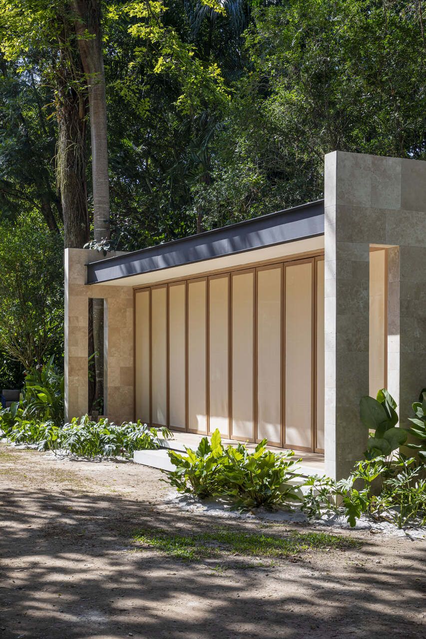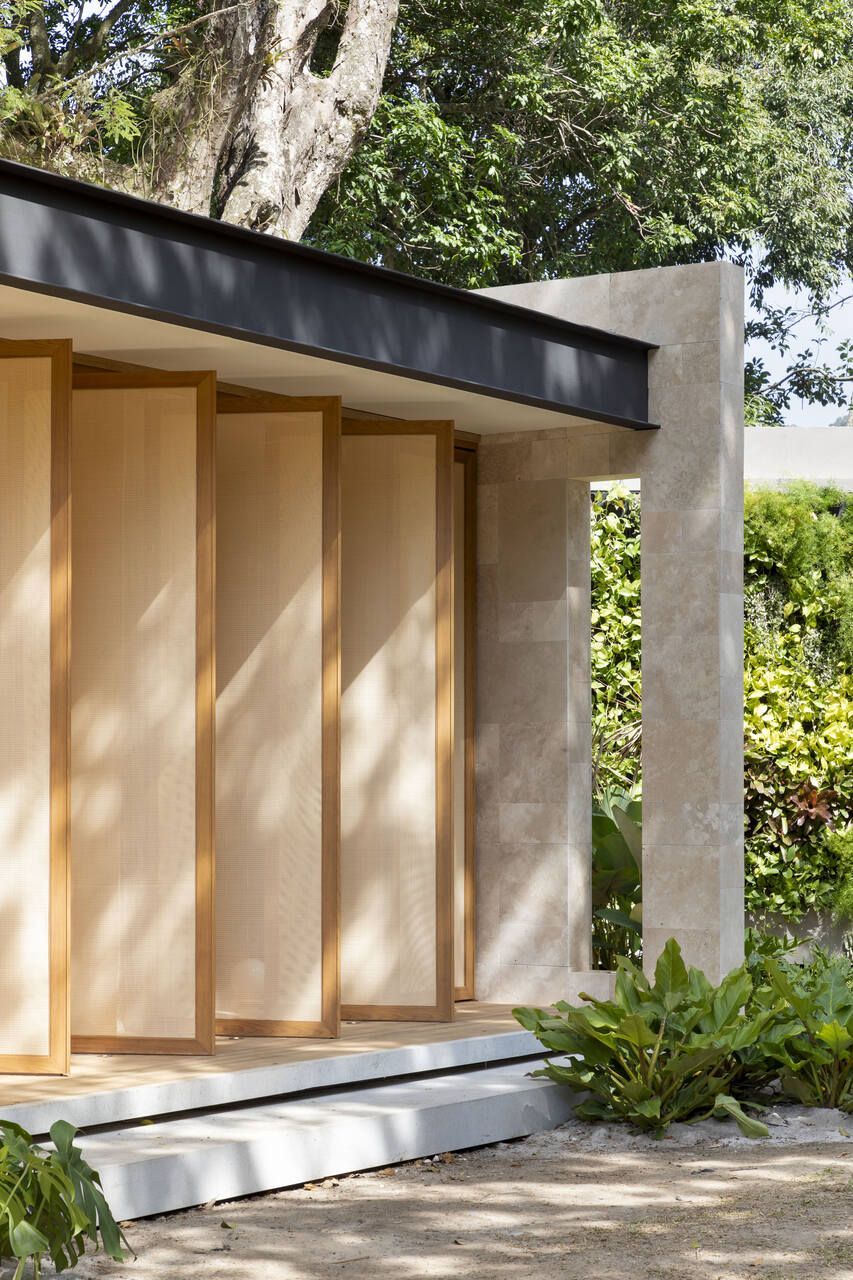 Todo o piso da casa é revestido com réguas de madeira, as paredes e pórticos com placas de mármore travertino e as esquadrias de alumínio da fachada principal, que funcionam como brises pivotantes, receberam pintura especial com aparência de madeira e fechamento em trama de palhinha ao invés do vidro tradicional.