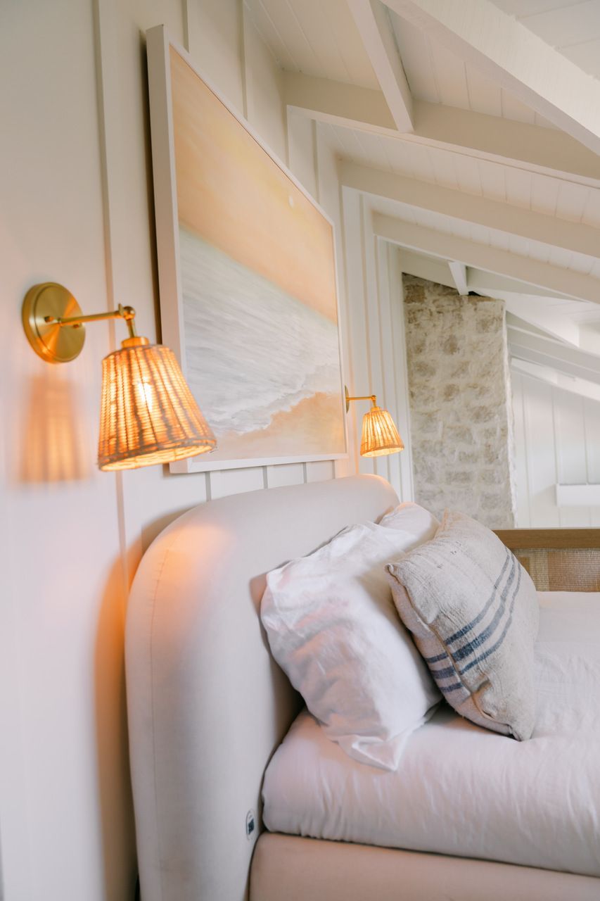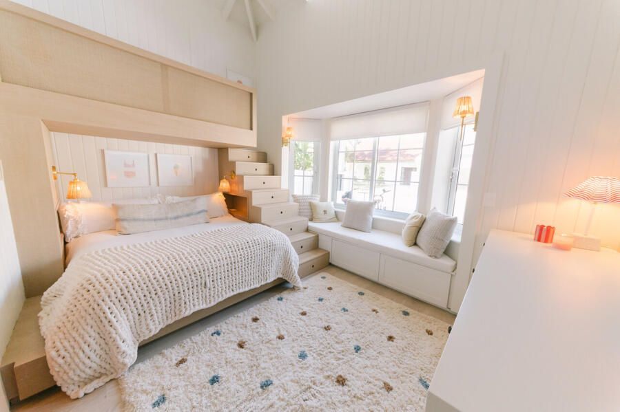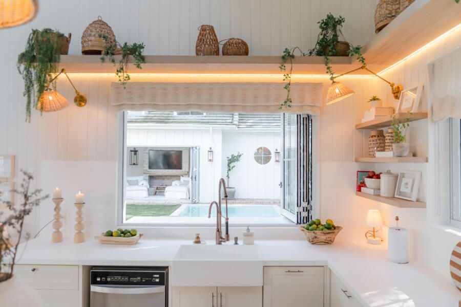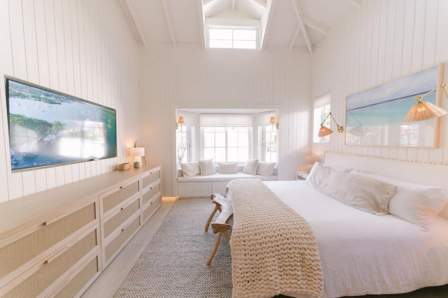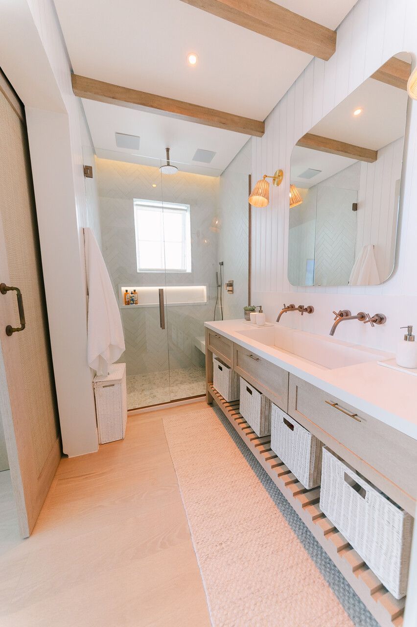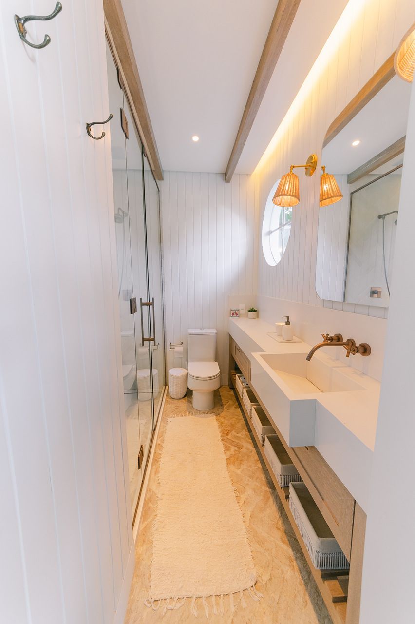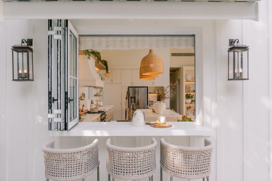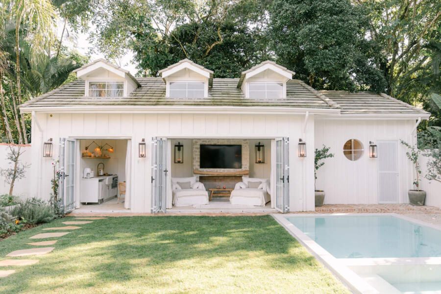 Além do desafio de conceber um projeto americano em pleno litoral brasileiro, as arquitetas também buscaram contemplar diversos itens que a família gostaria de ter em sua casa dos sonhos na whislist, como: barwindow, porta holandesa, banheiros Jack and Jill, janela em estilo náutico, portas camarão, shiplap, mansardas, vigas falsas, baywindow com bancos, e muitas arandelas.