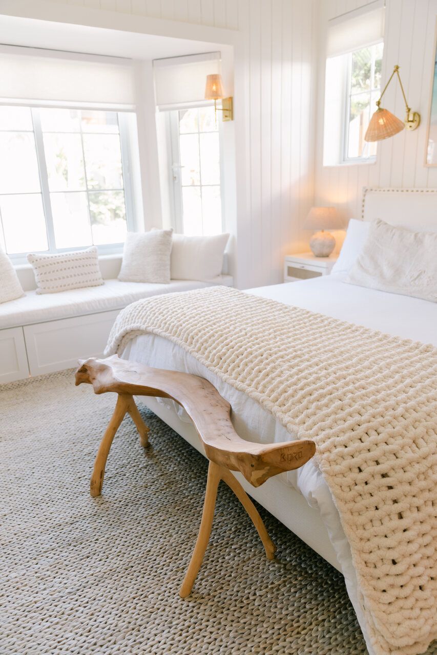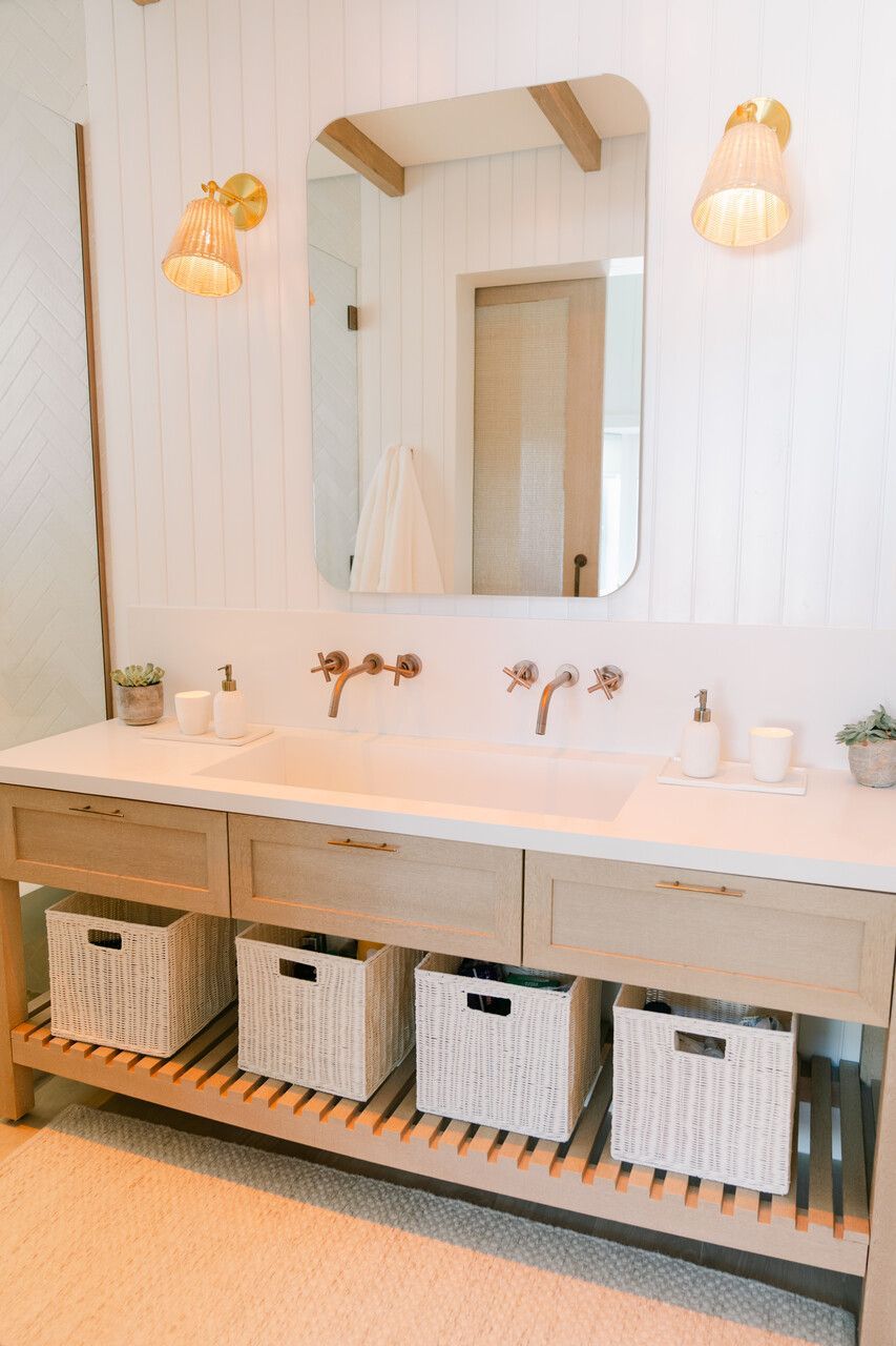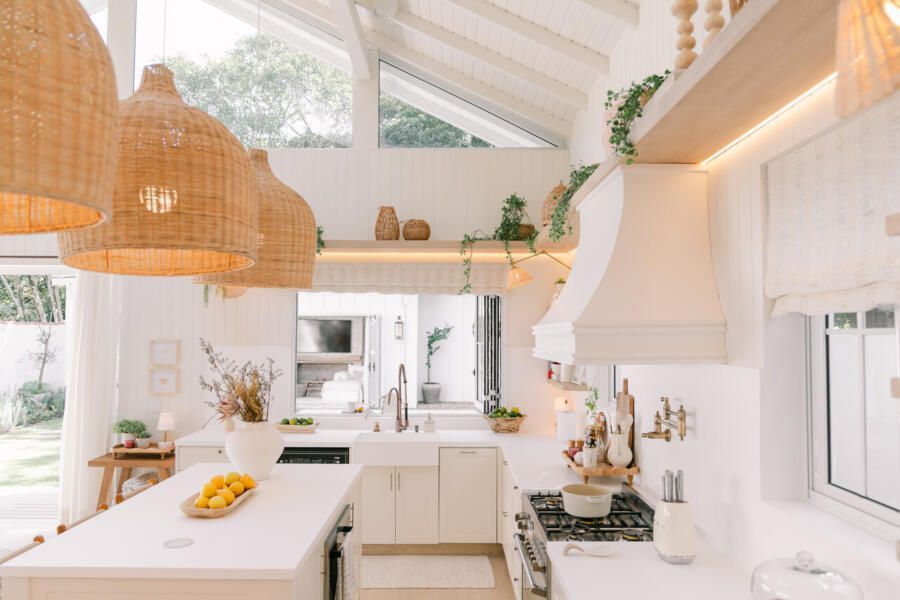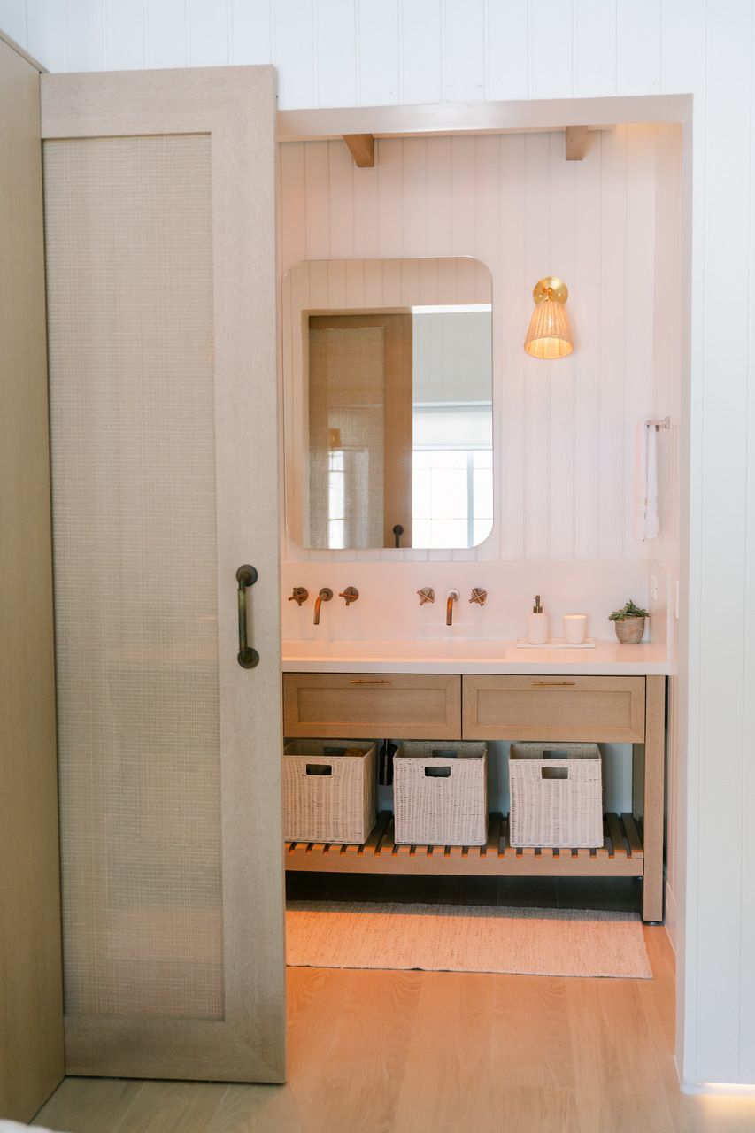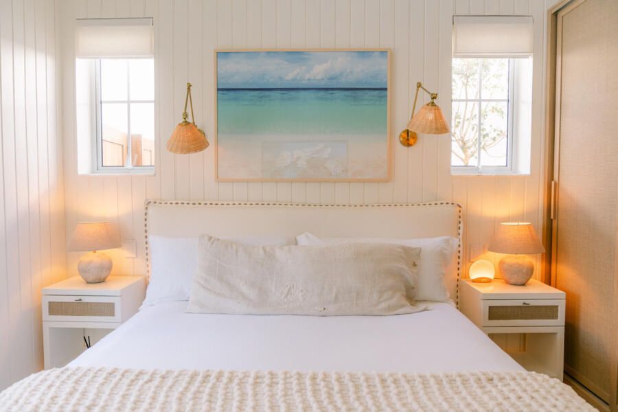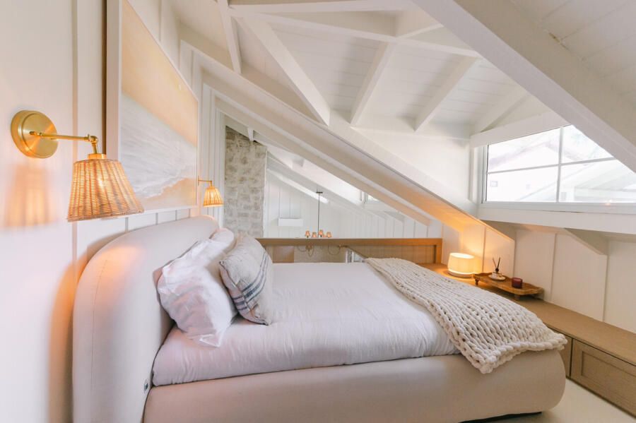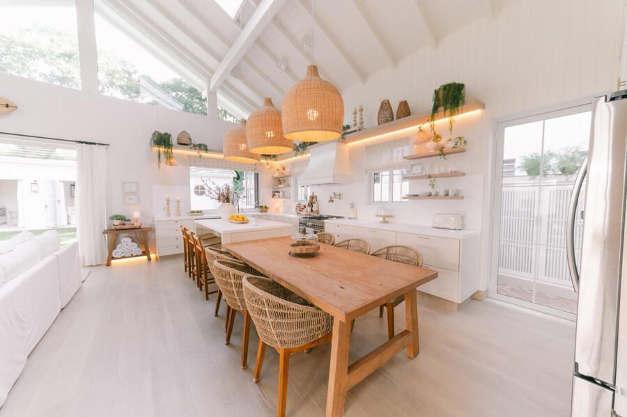 Além do desafio de conceber um projeto americano em pleno litoral brasileiro, as arquitetas também buscaram contemplar diversos itens que a família gostaria de ter em sua casa dos sonhos na whislist, como: barwindow, porta holandesa, banheiros Jack and Jill, janela em estilo náutico, portas camarão, shiplap, mansardas, vigas falsas, baywindow com bancos, e muitas arandelas.