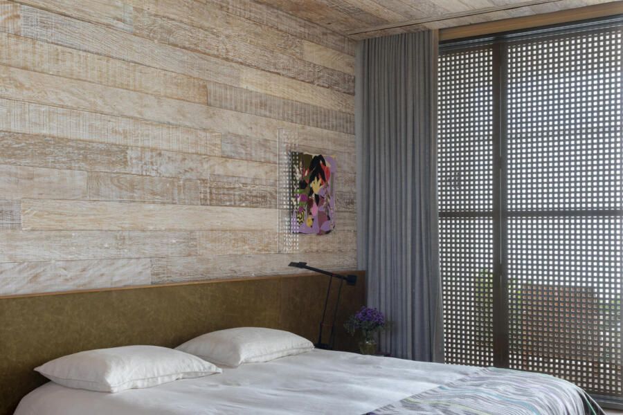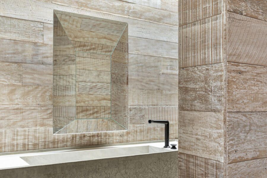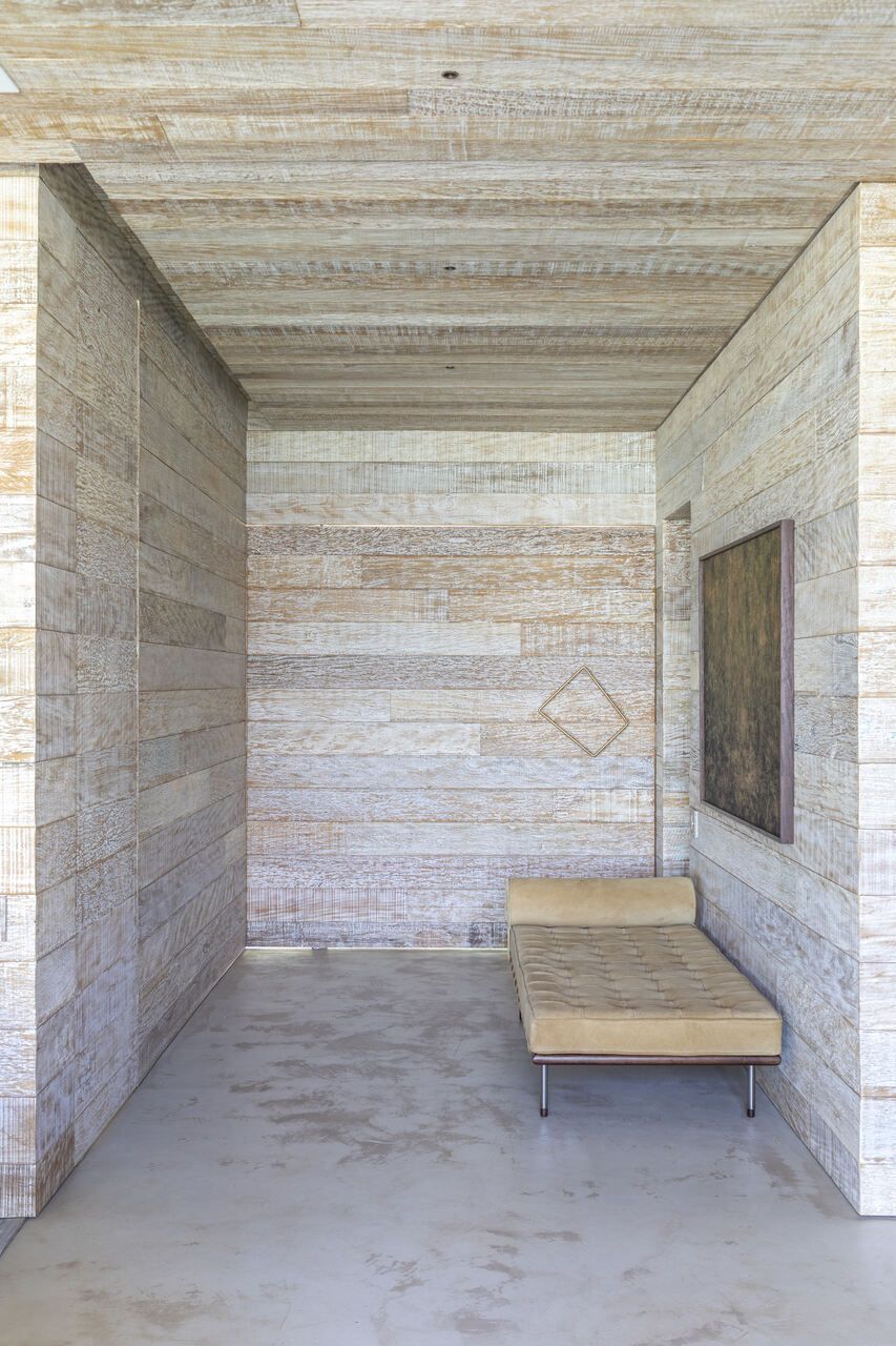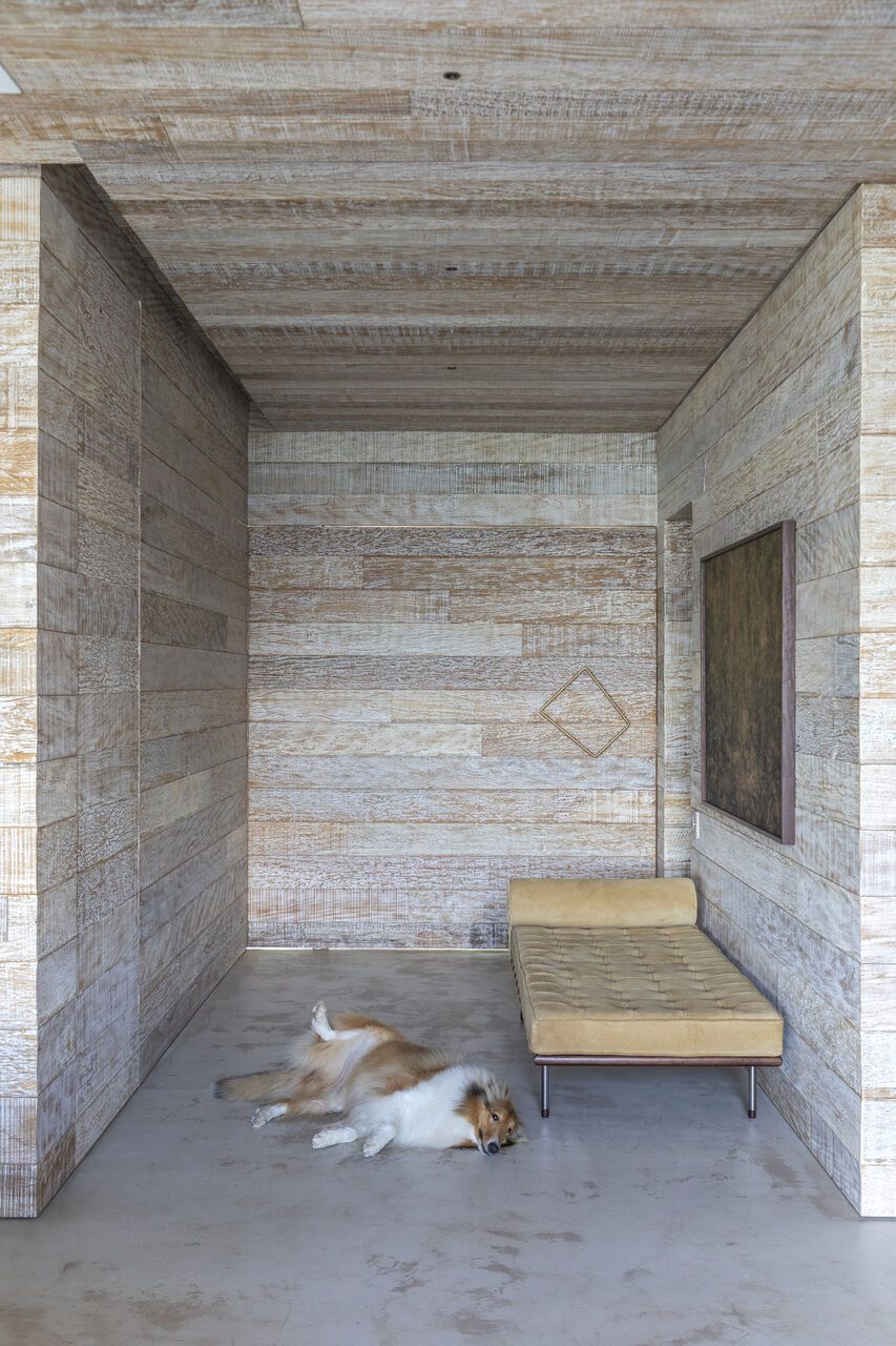 A paleta de materiais reforça a harmonia visual e o caráter atemporal do projeto. Madeira de demolição lixada e tratada em tom esbranquiçado reveste fachadas, tetos, painéis e marcenarias, sempre com a mesma paginação. Já o piso e algumas paredes receberam textura cimentícia cinza crômio, que cria unidade e reforça o estilo minimalista da casa térrea.