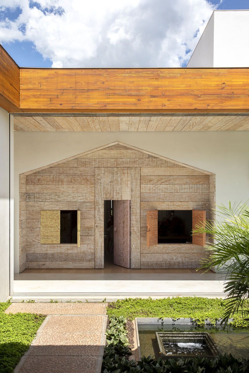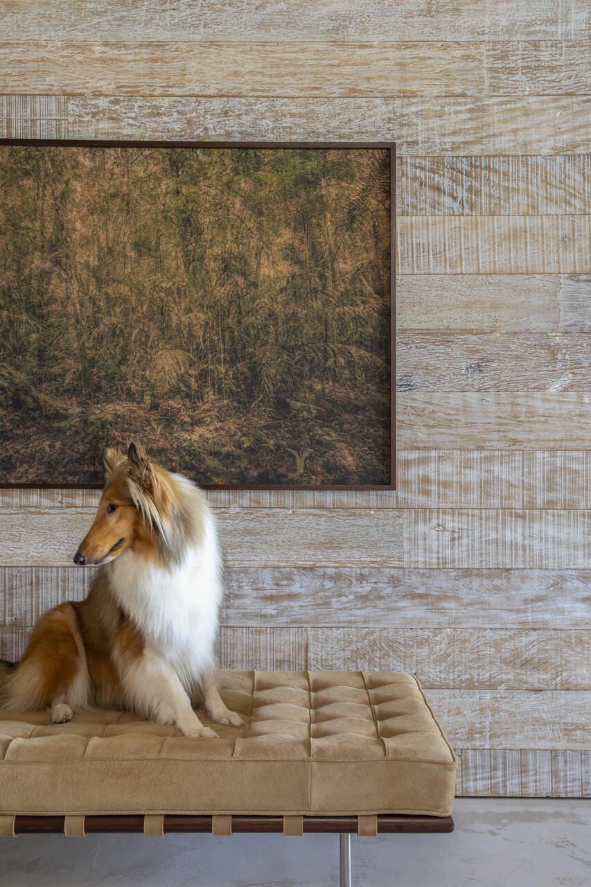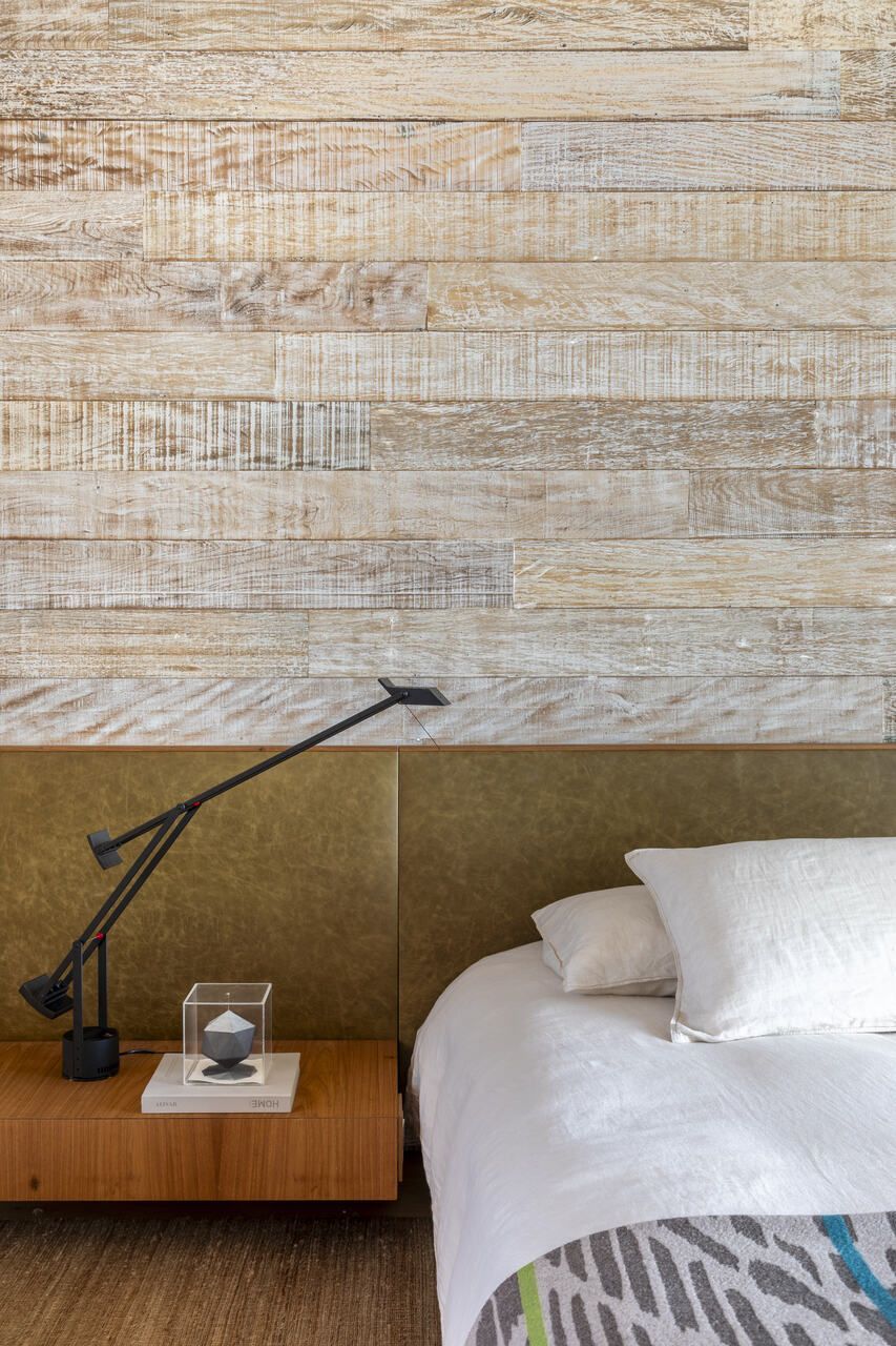 A paleta de materiais reforça a harmonia visual e o caráter atemporal do projeto. Madeira de demolição lixada e tratada em tom esbranquiçado reveste fachadas, tetos, painéis e marcenarias, sempre com a mesma paginação. Já o piso e algumas paredes receberam textura cimentícia cinza crômio, que cria unidade e reforça o estilo minimalista da casa térrea.