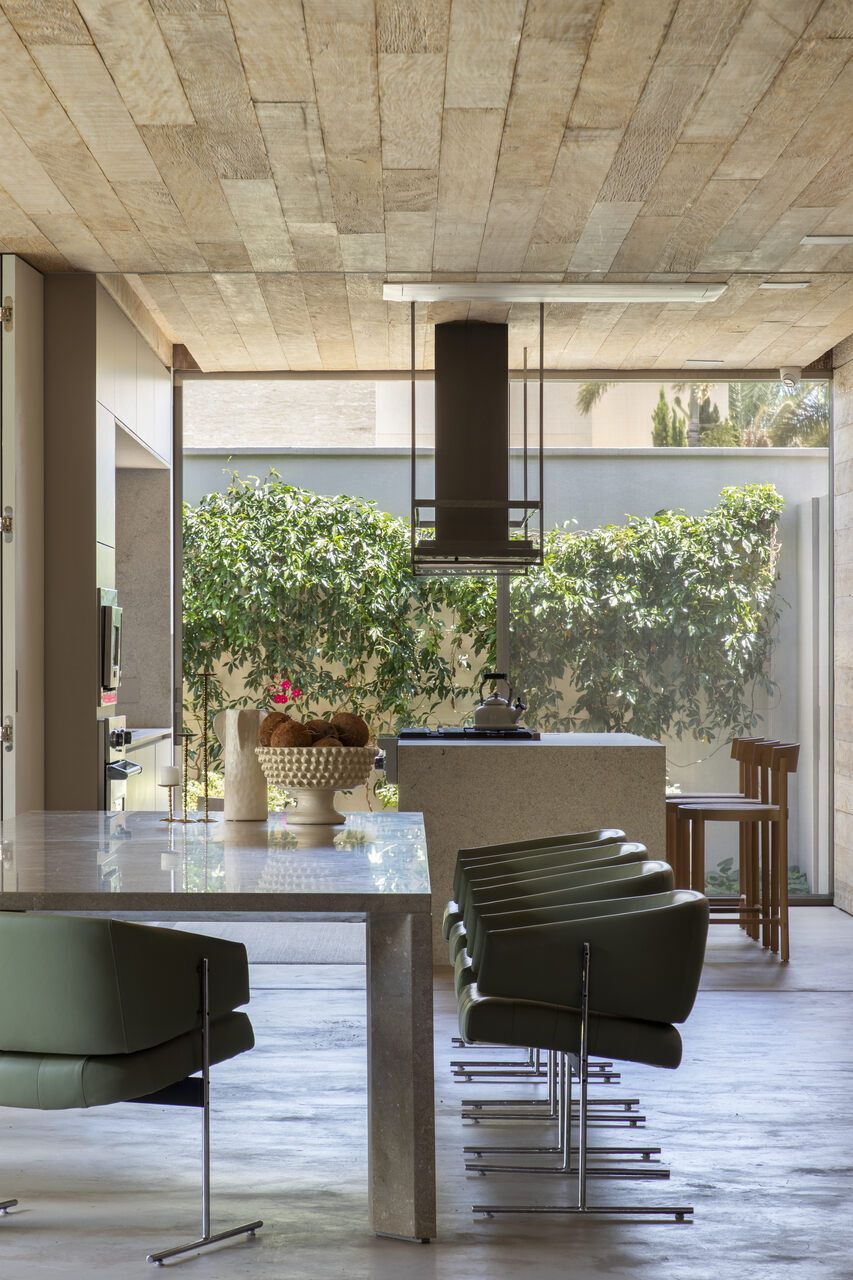 “Criamos grandes vãos com portas que se abrem por inteiro, permitindo, por exemplo, que a sala de jantar, a sala de TV e a área gourmet se integrem totalmente, dependendo da ocasião. Posicionamos a cozinha próximo à área gourmet externa para servir de apoio.”