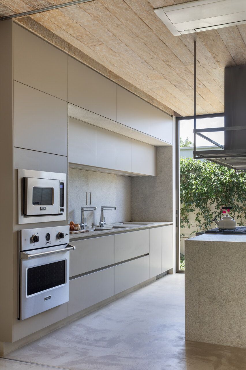 “Por isso, todas as bancadas da casa são do mesmo granito Itaúnas e todo o piso e as paredes sem madeira receberam a mesma textura cimentícia cinza claro.”