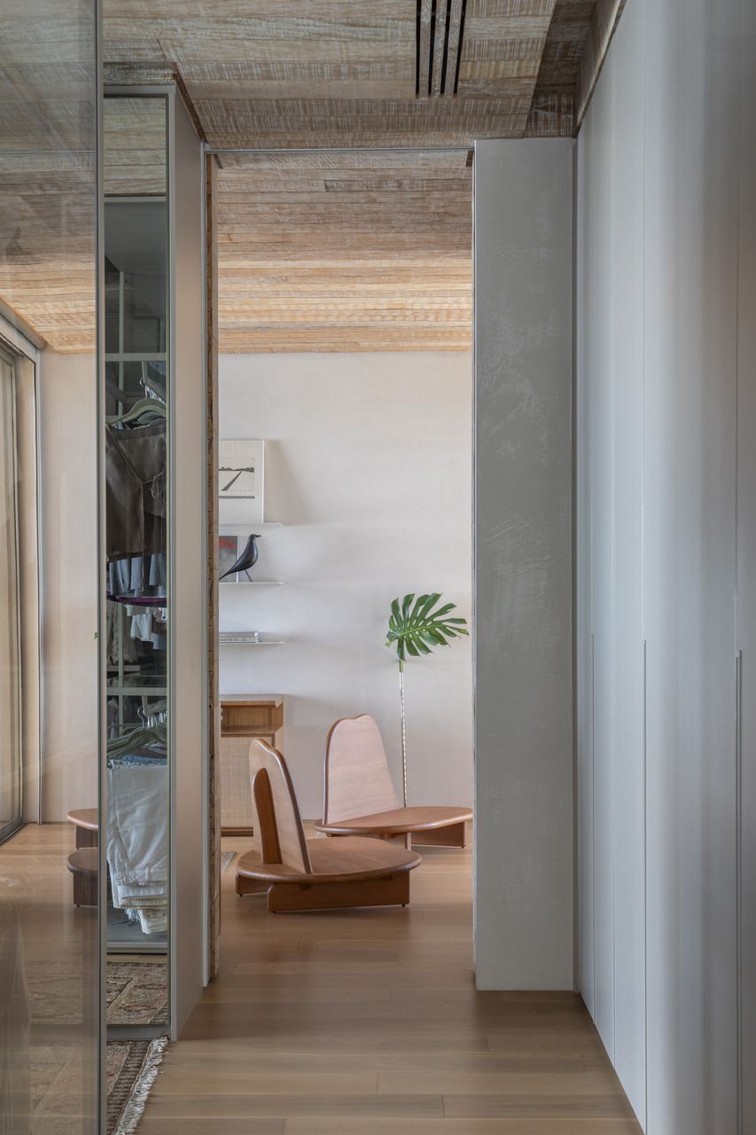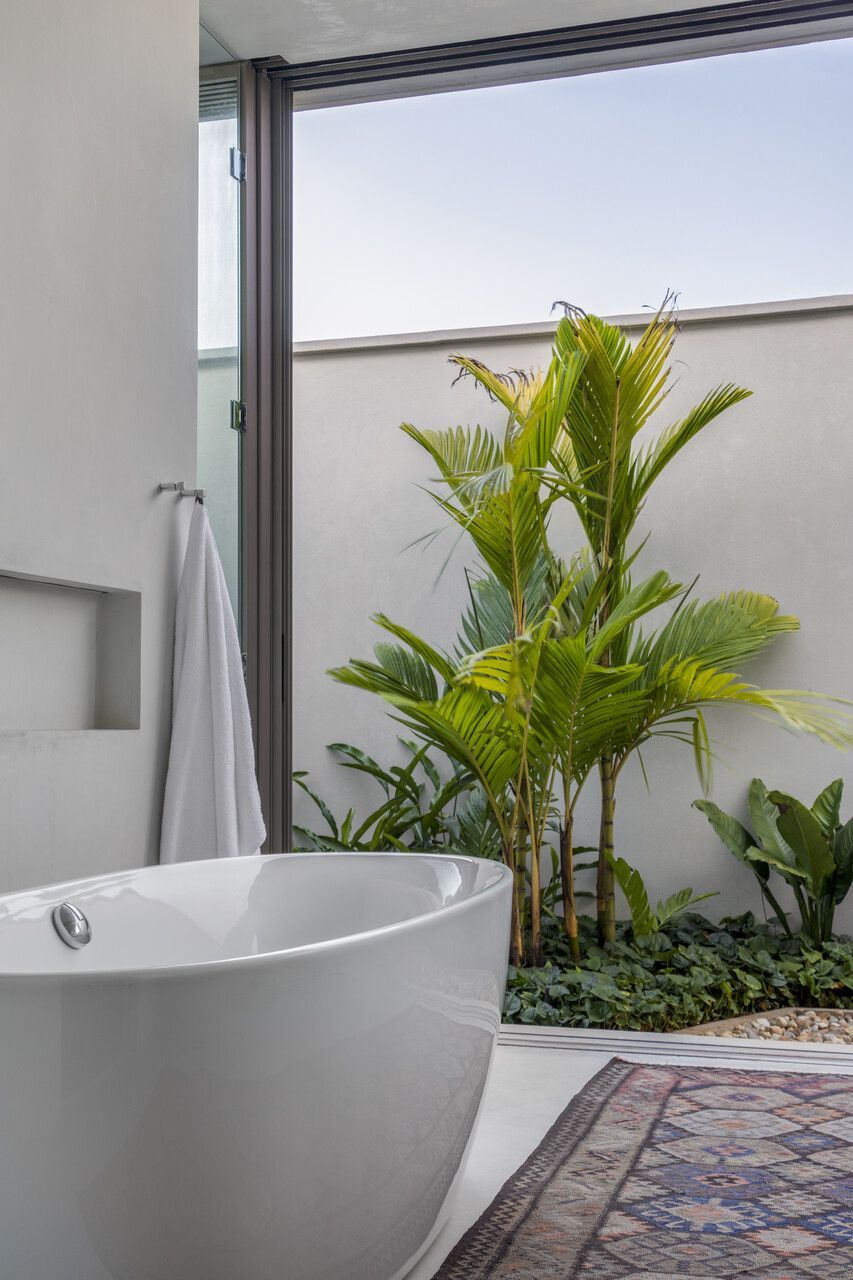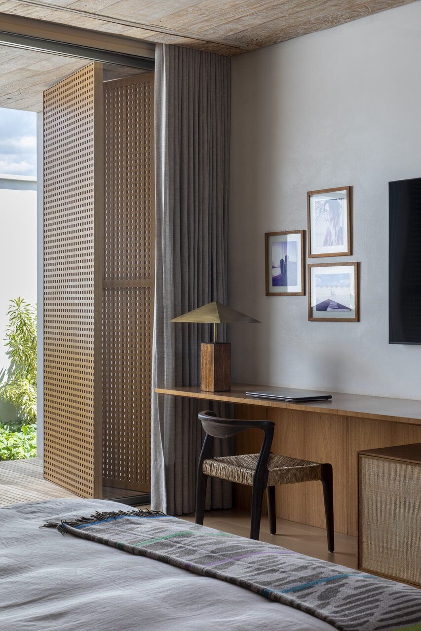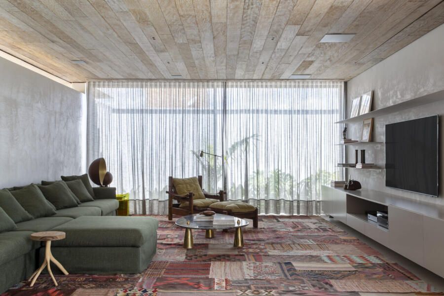 A decoração segue a mesma diretriz estética, com móveis de design brasileiro e marcenaria sob medida. No mobiliário, destacam-se peças assinadas por Carlos Motta, Guilherme Wentz, Jorge Zalszupin e Lucas Neves, que convivem em harmonia com o projeto arquitetônico. O tom neutro e claro predomina, com toques de verde que reforçam a integração com o jardim e pontos de cor em vermelho e vinho em ambientes como a sala de TV.